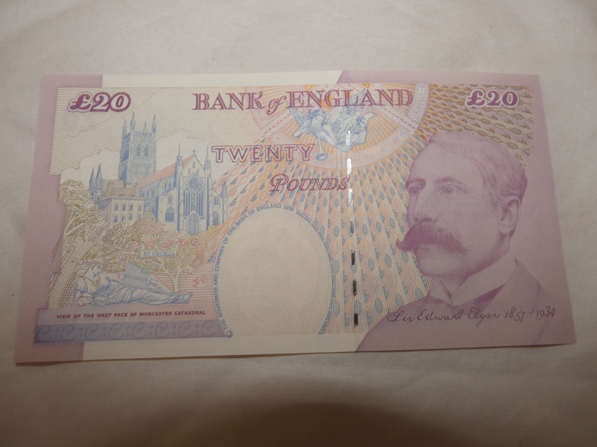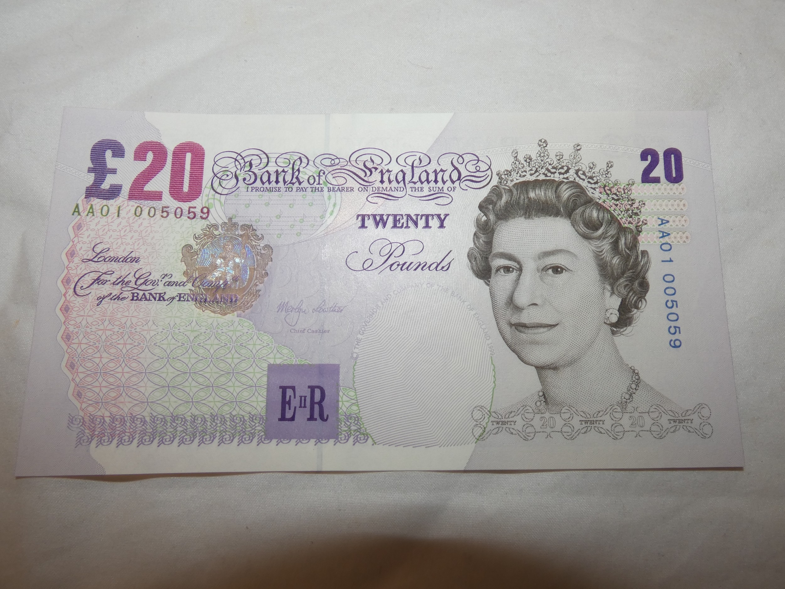 Uncirculated Bank of England £20 banknote, Lowther, AA01 005059, first prefix, series E.