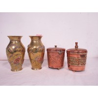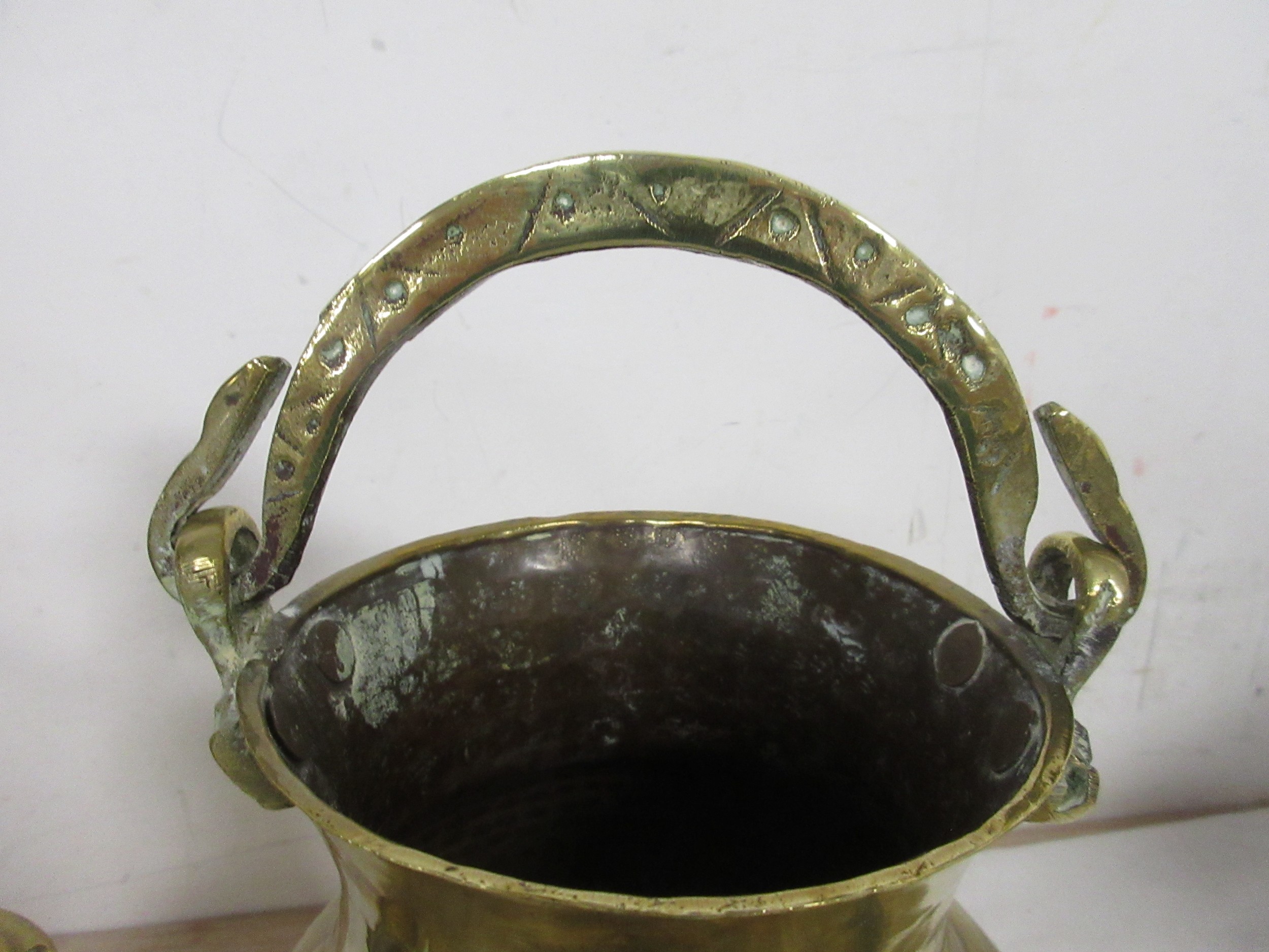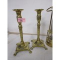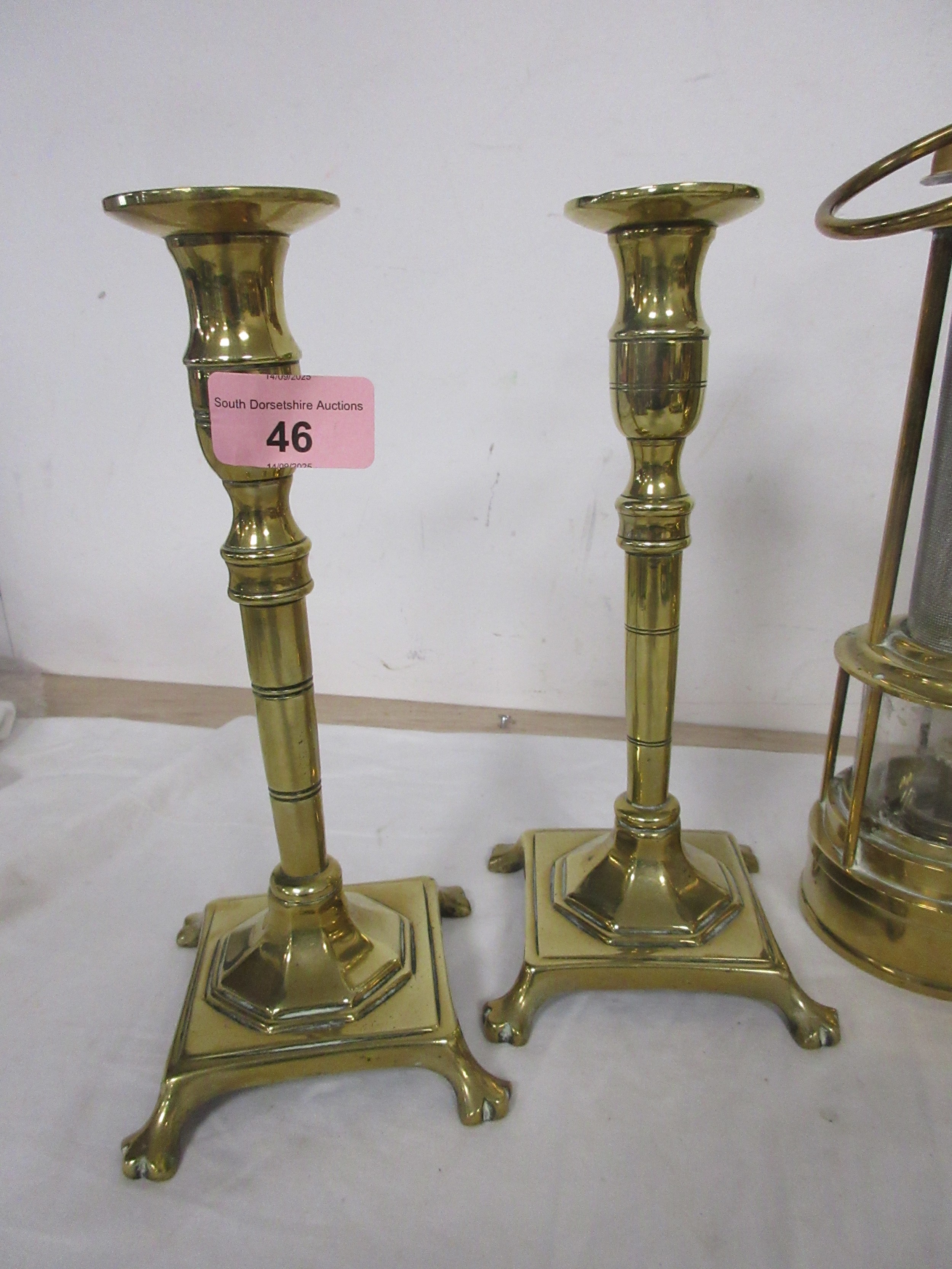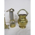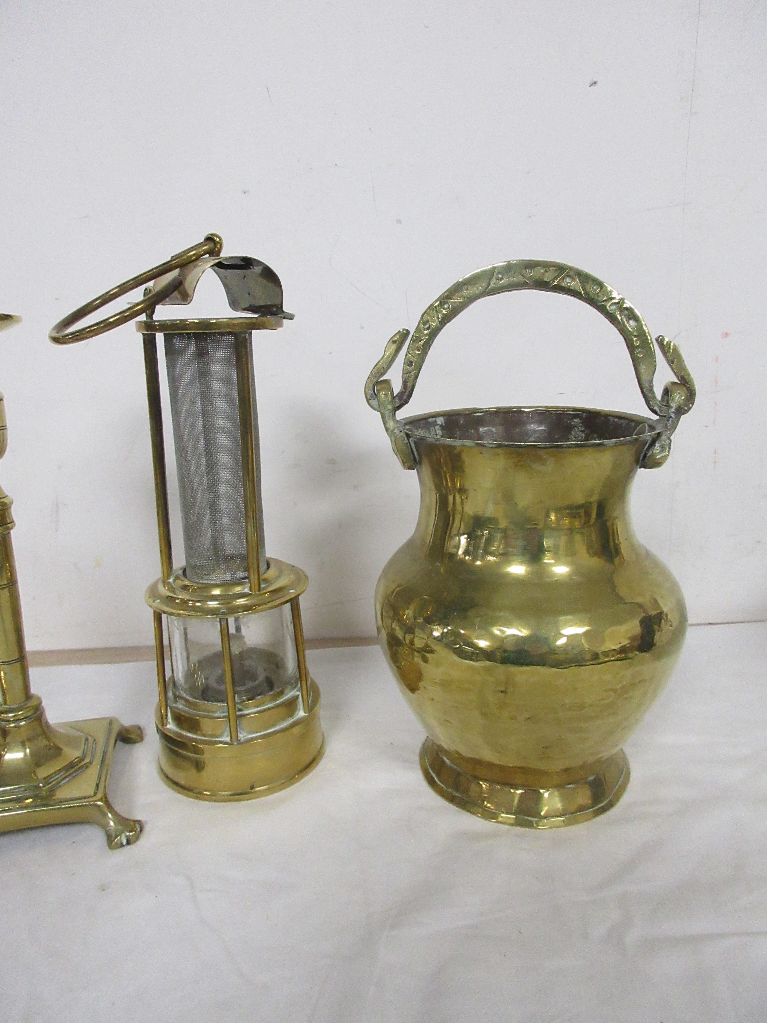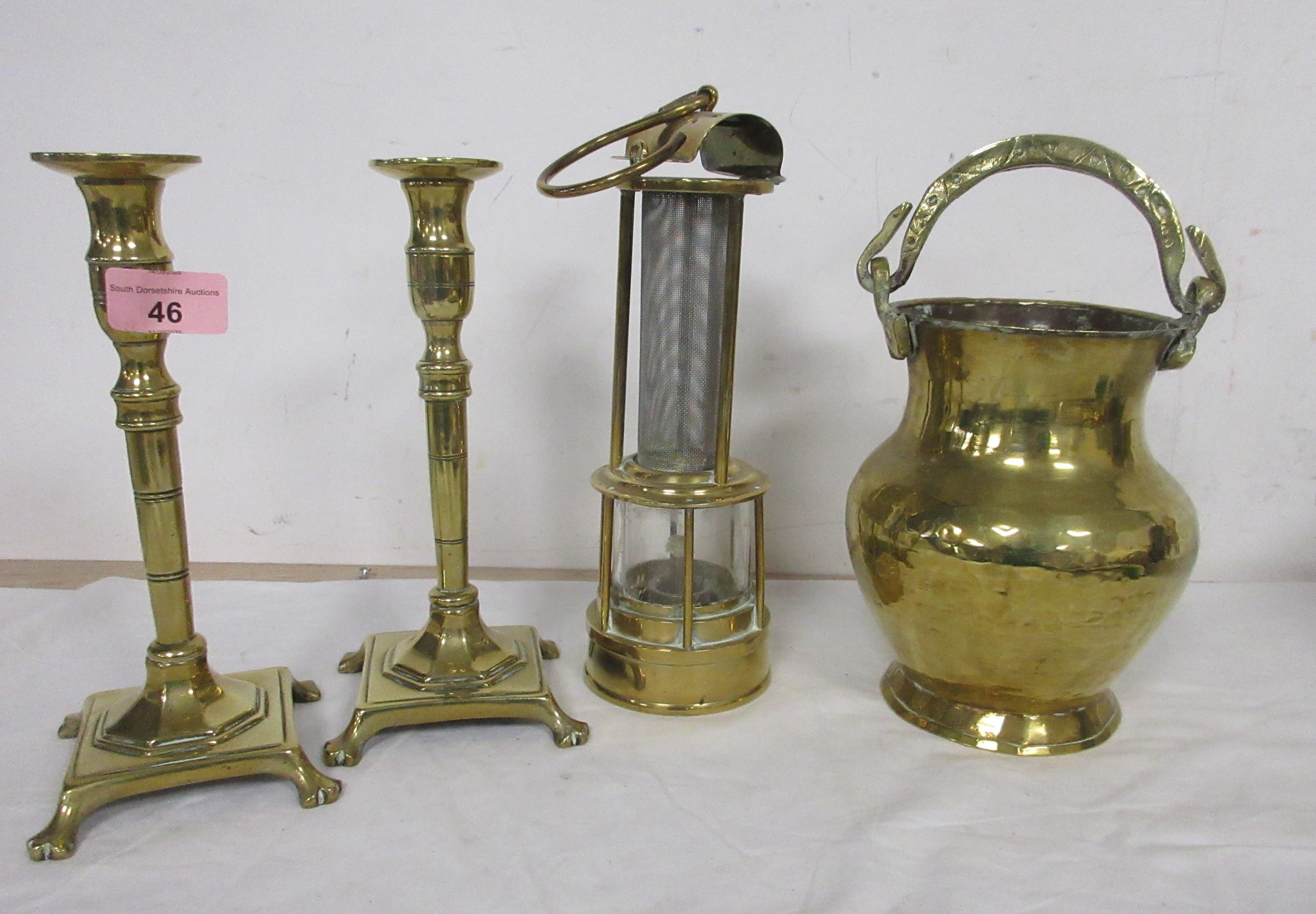 A brass miner's type lamp, a brass vase with serpent handle, and a pair of brass candlesticks (23cm)