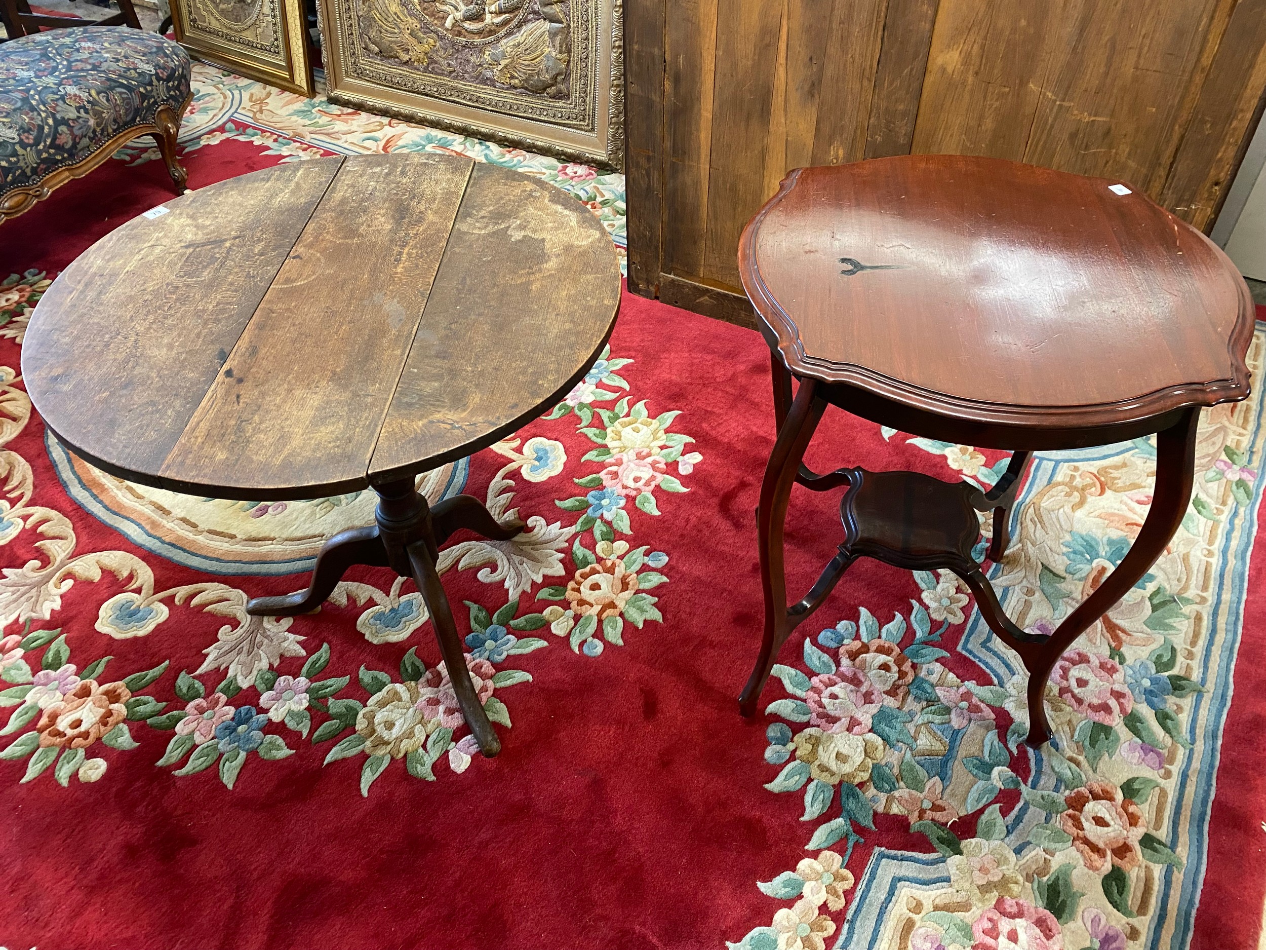 A Georgian oak occasional table with circular hinged top, turned column, on three downswept legs - 30in. dia. and an Edwardian mahogany occasional with shaped square top, on slender legs united by undertier - 23in. square