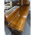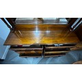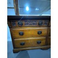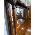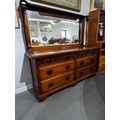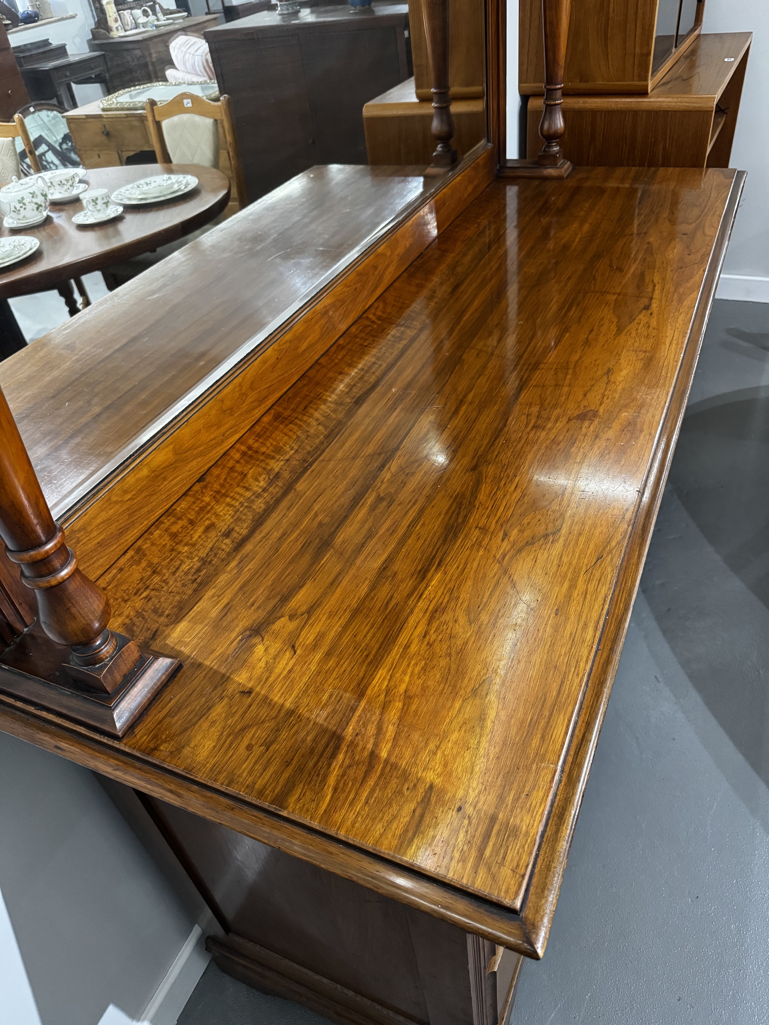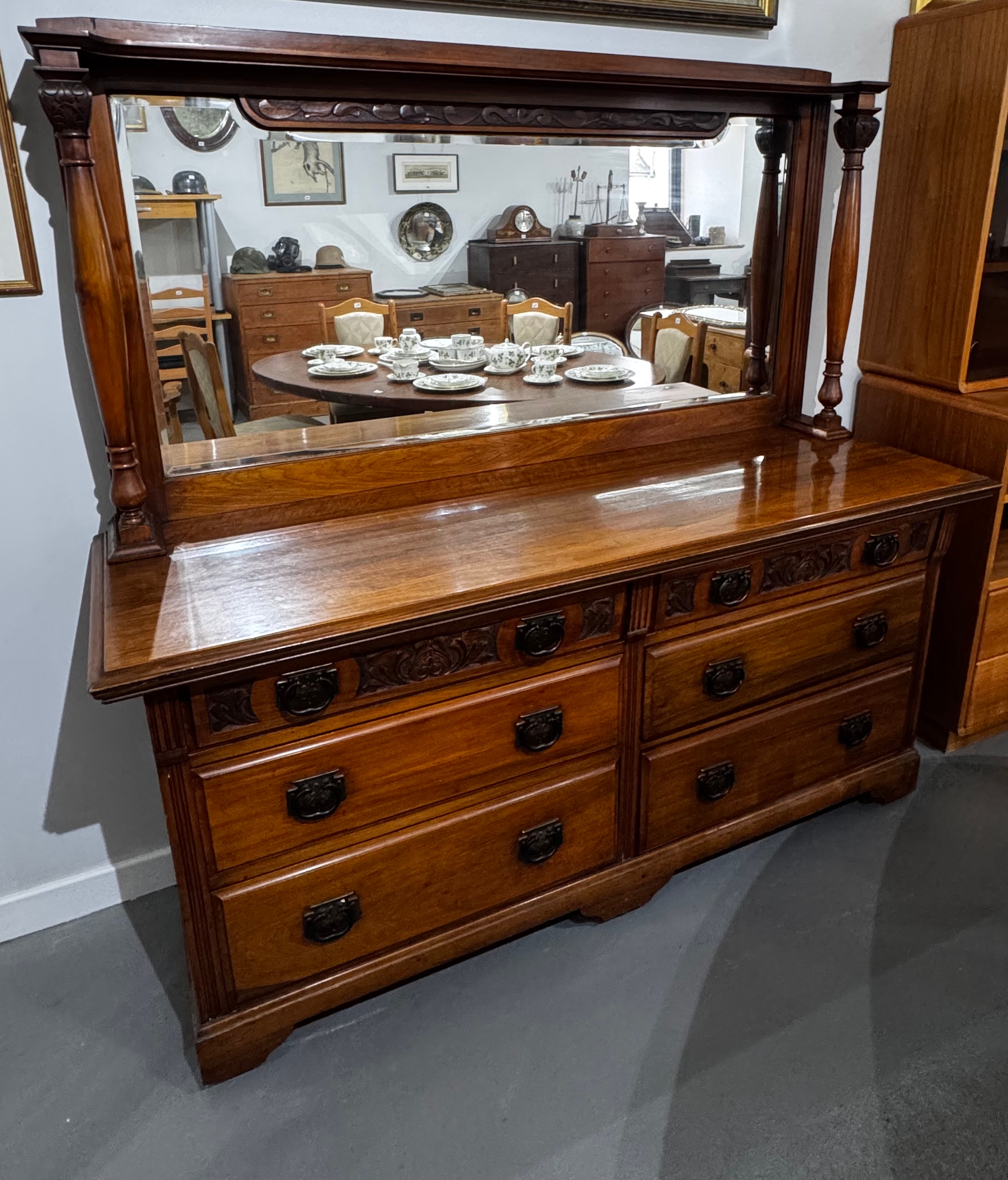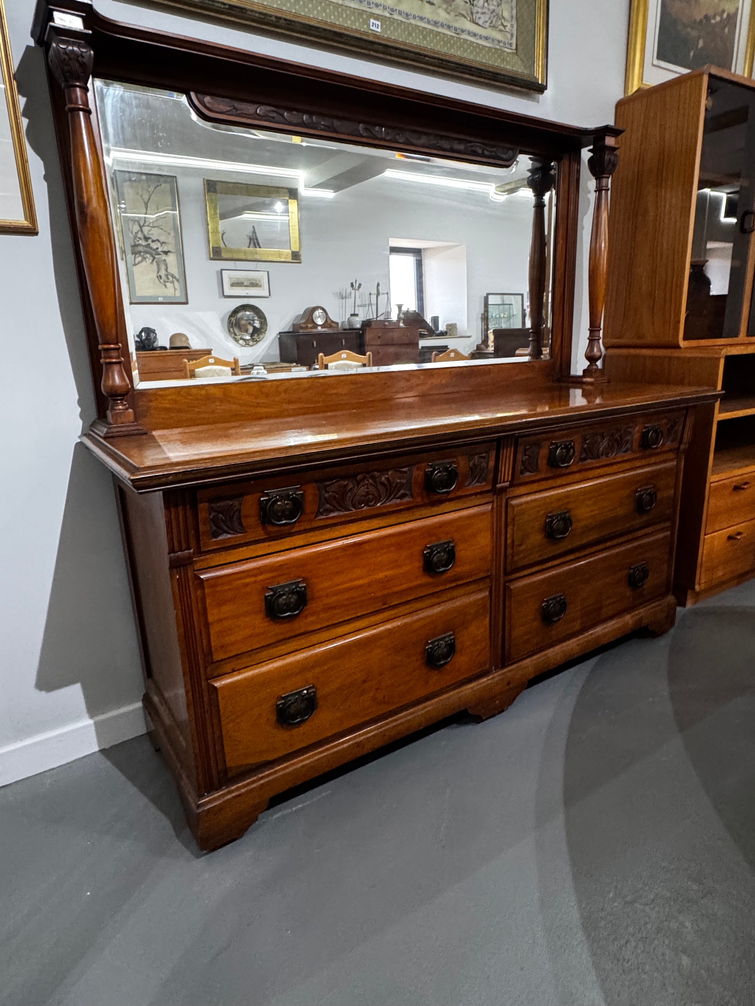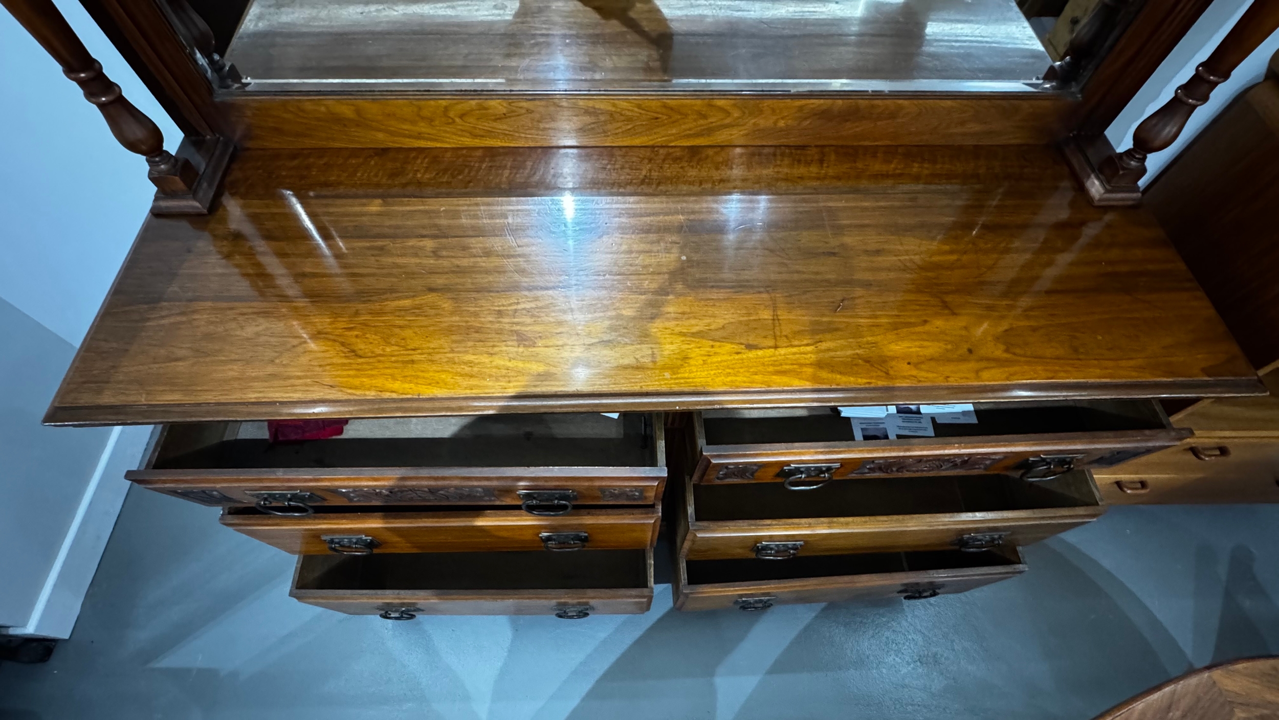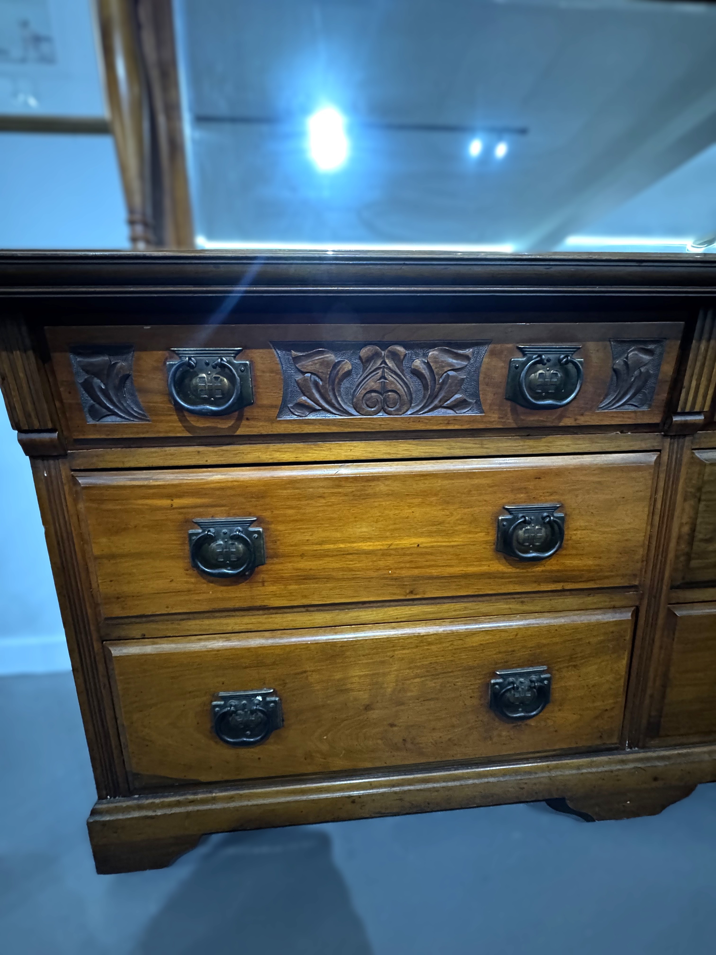 Early 20th century carved walnut dressing chest with mirror back, the rectangular bevelled plate flanked by turned supports and foliate carved frieze above a moulded top and an arrangement of drawers with decorative carved panels and original drop handles