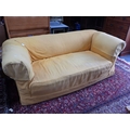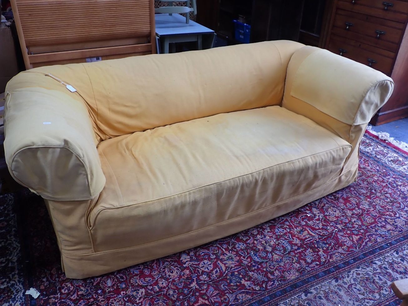 A 1920S CHESTERFIELD SETTEE, WITH DROP-END, ON BUN FEET and yellow loose covers 193cm wide (for re-upholstery). Provenance: The Estate of the late John Rollo Somerset-Paddon, formerly of Chalk Newton House, Maiden Newton, Dorset, thence by descent.