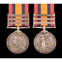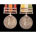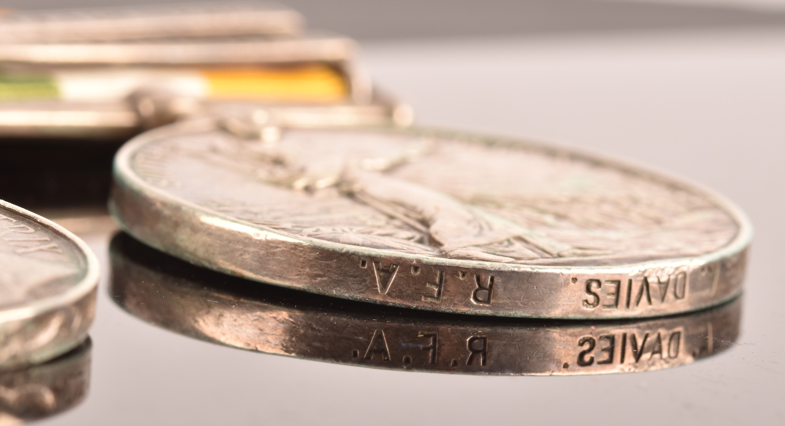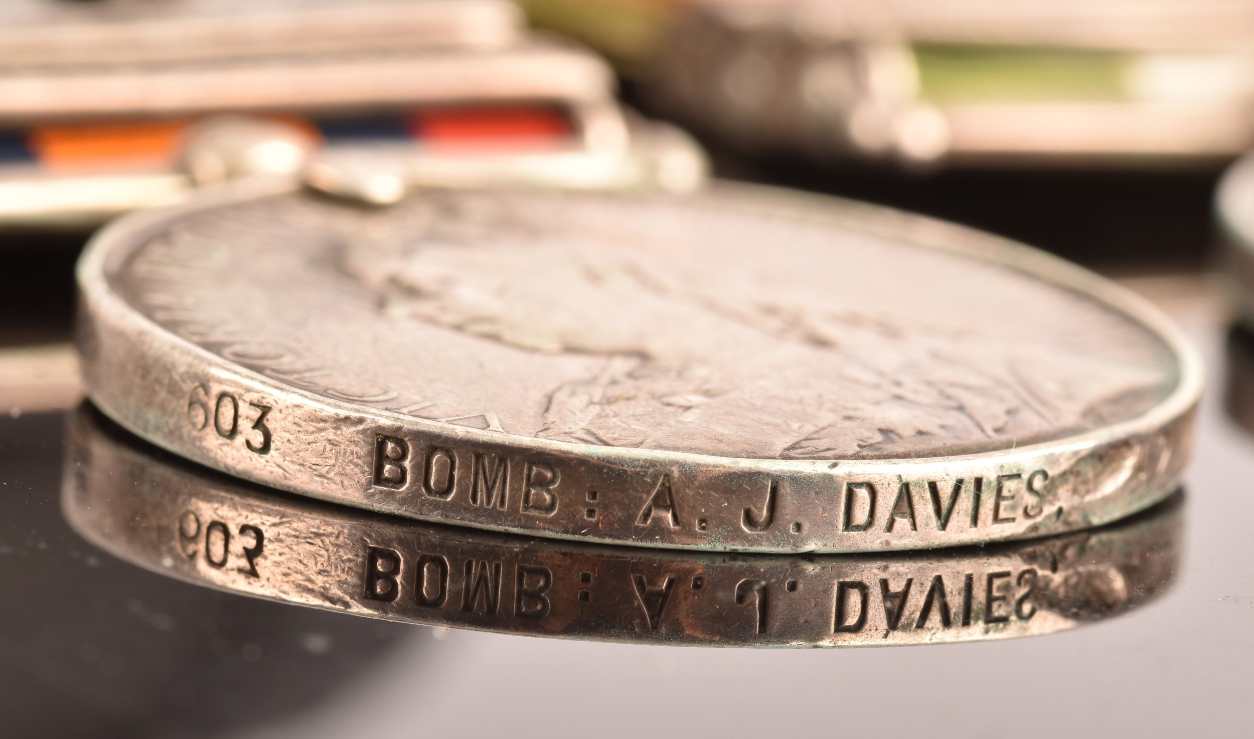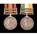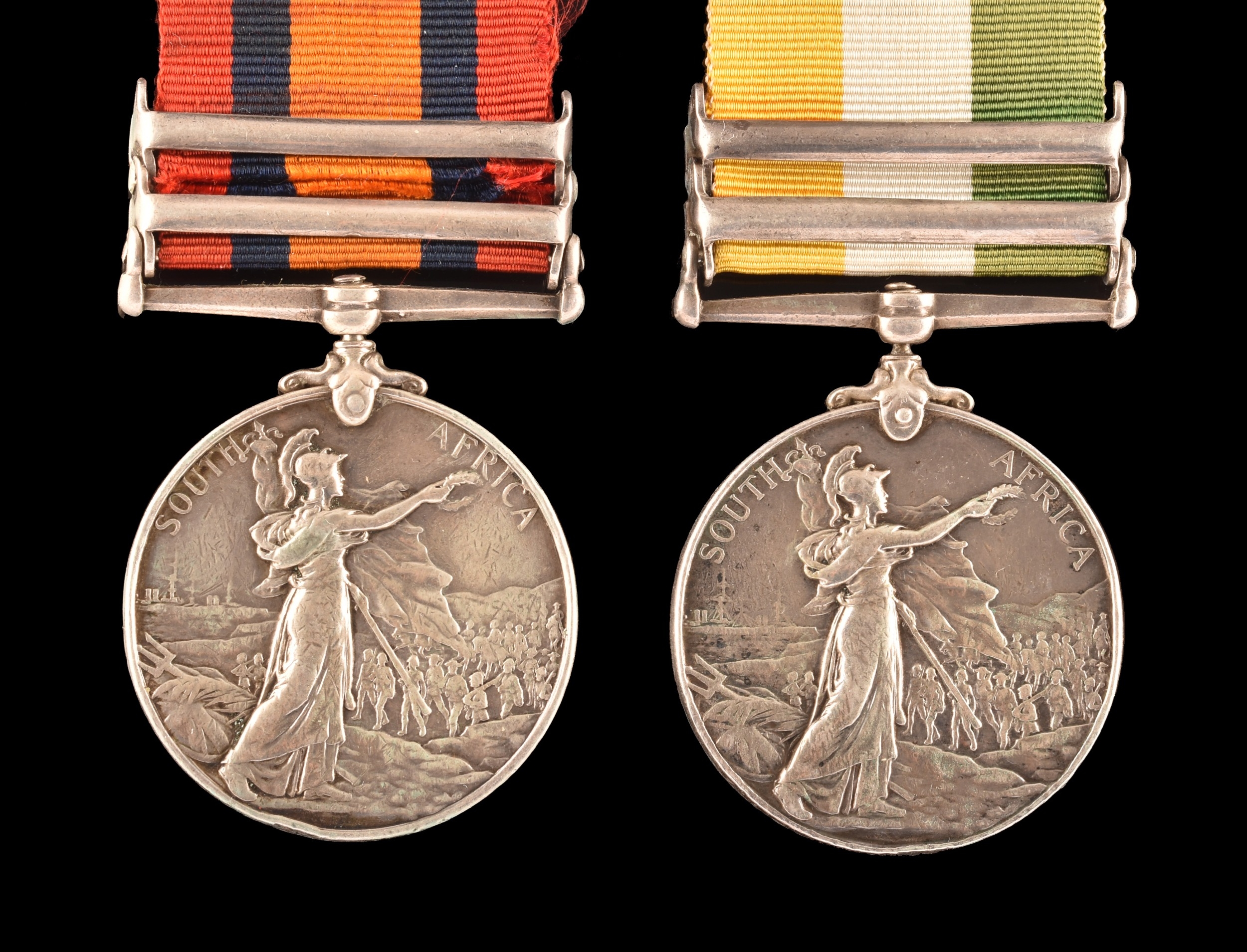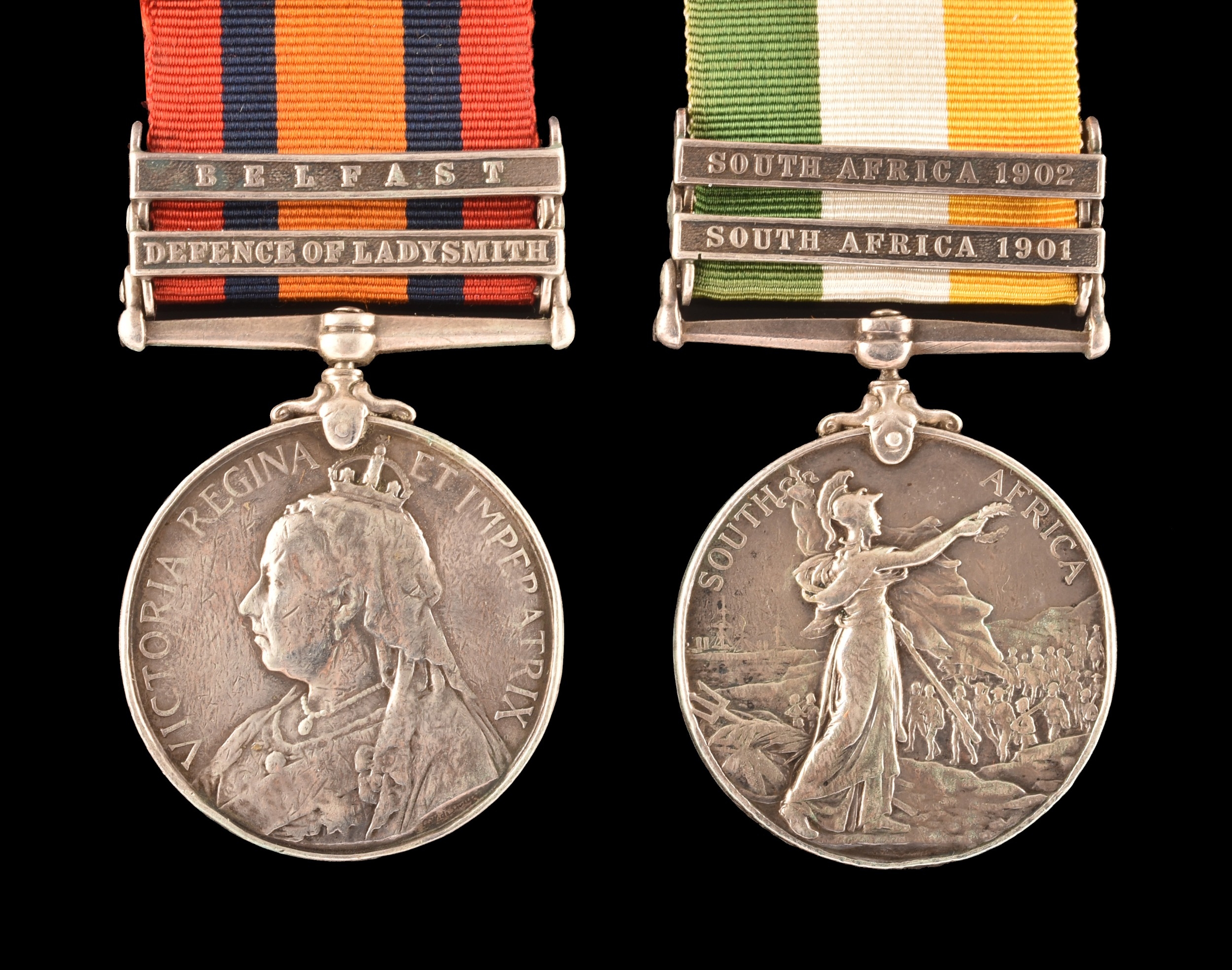 A Boer War medal pair awarded to: 95603 Bombadier A. J. Davies 42nd Battery, Royal Field Artillery. Comprising: a QSA Queen’s South Africa medal with 2 clasps Defence of Ladysmith, Belfast (95603 Bomb: A. J. Davies 42nd Bty, R.F.A.); and a KSA King's South Africa medal with 2 clasps South Africa 1901 and South Africa 1902 (95603 Bomb: A. J. Davies R.F.A.).
