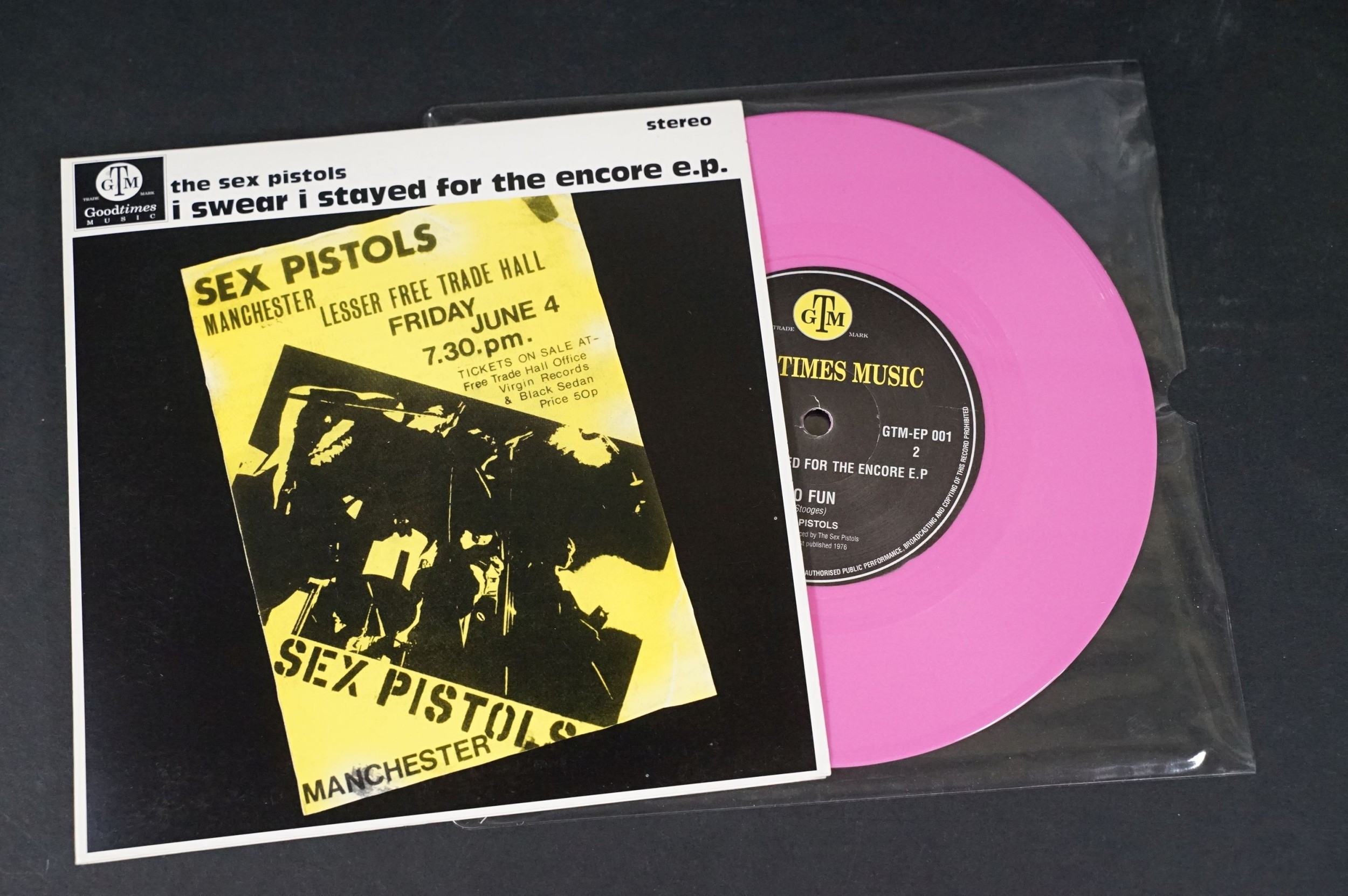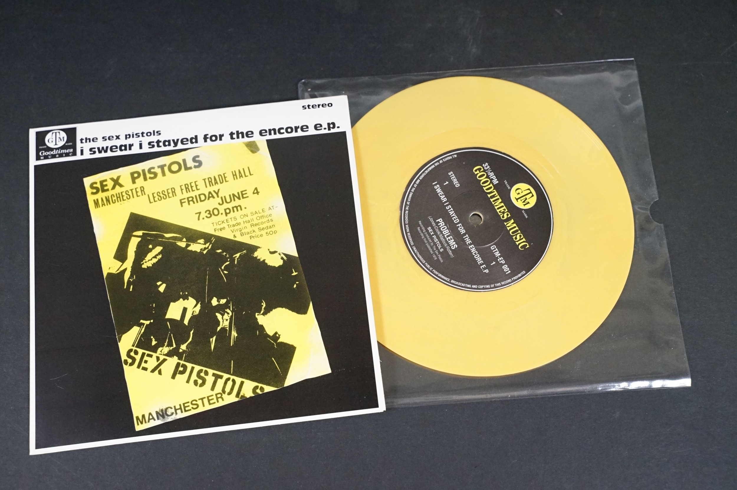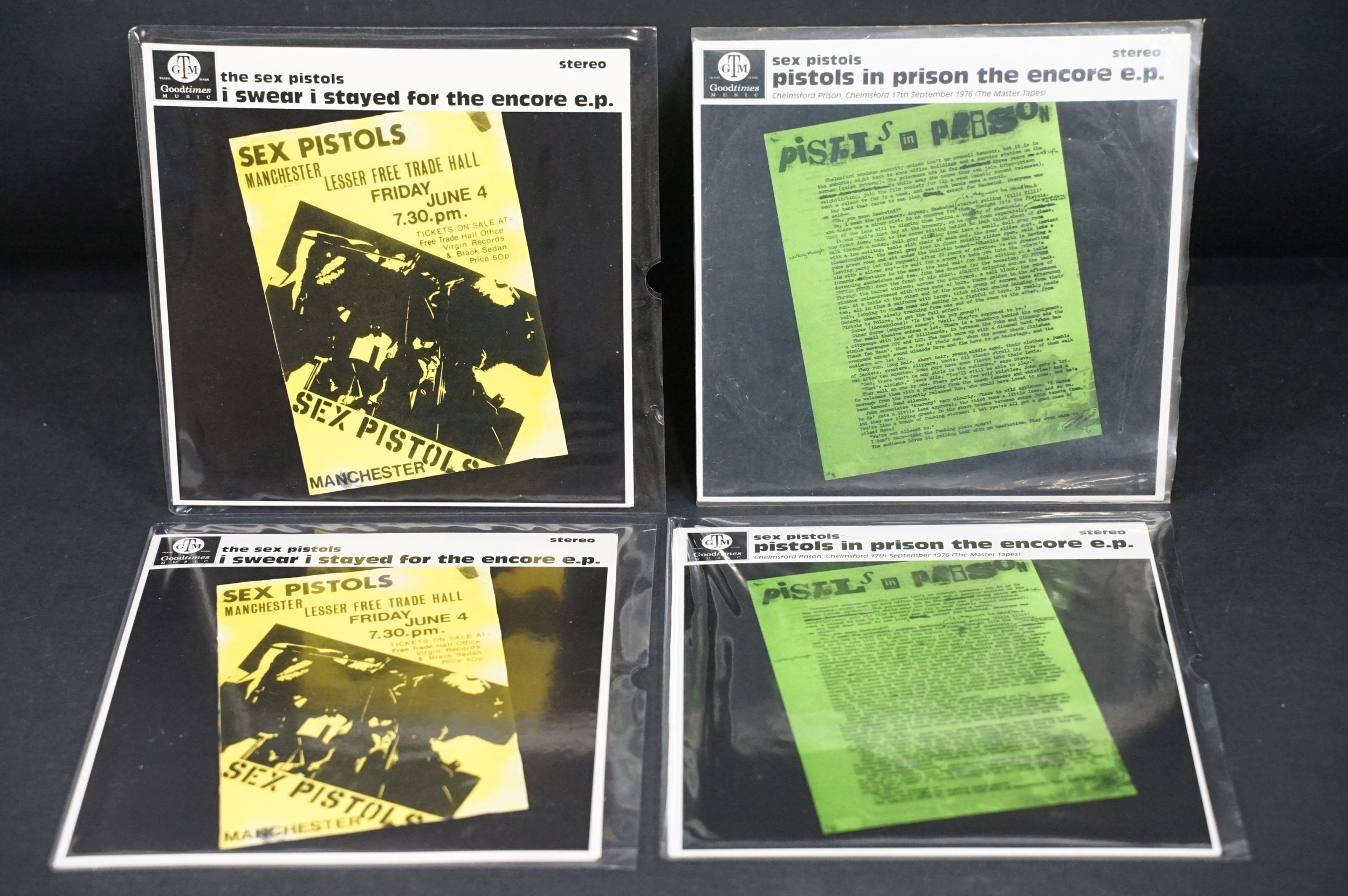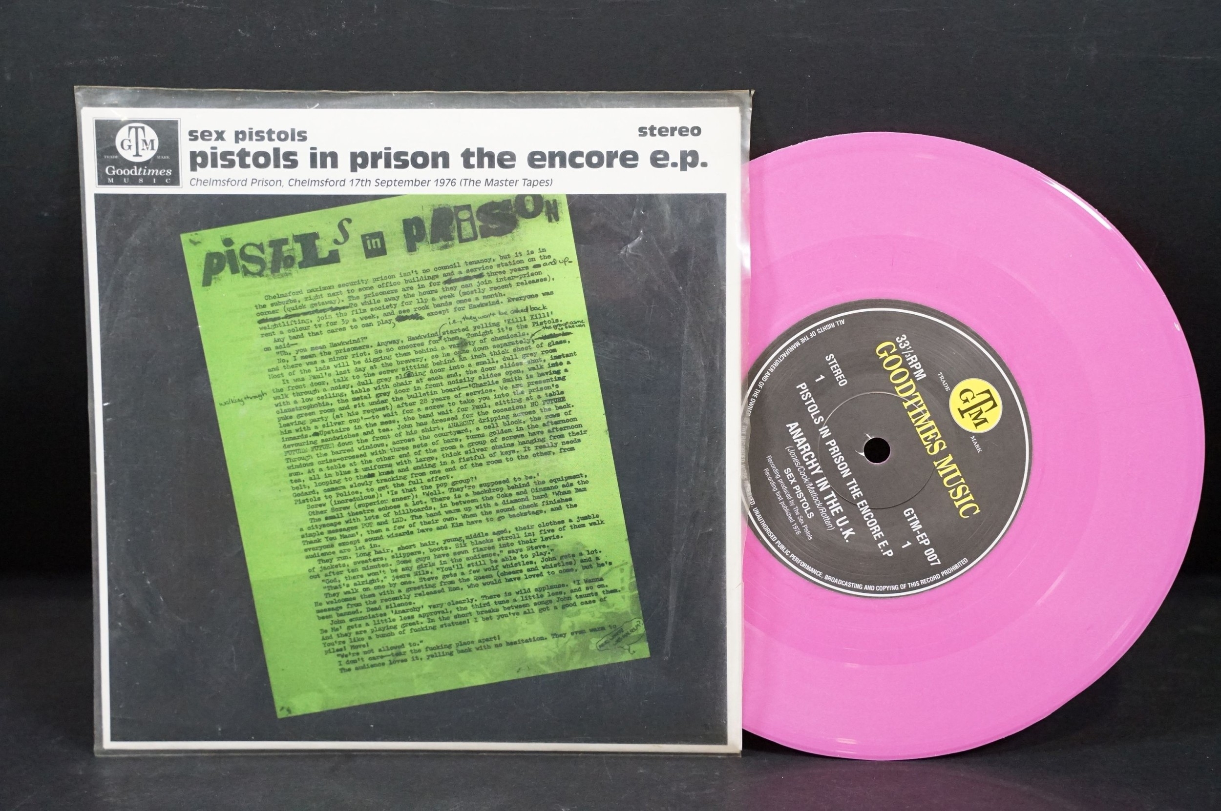 Vinyl - Punk - Sex Pistols, 4 different coloured vinyl UK 2008 7” singles to include: Pistols In Prison The Encore E.P. x 2 (clear and pink vinyl), I Swear I Stayed For The Encore E.P. x 2 (pink and YELLOW vinyl), all with picture sleeves. EX+