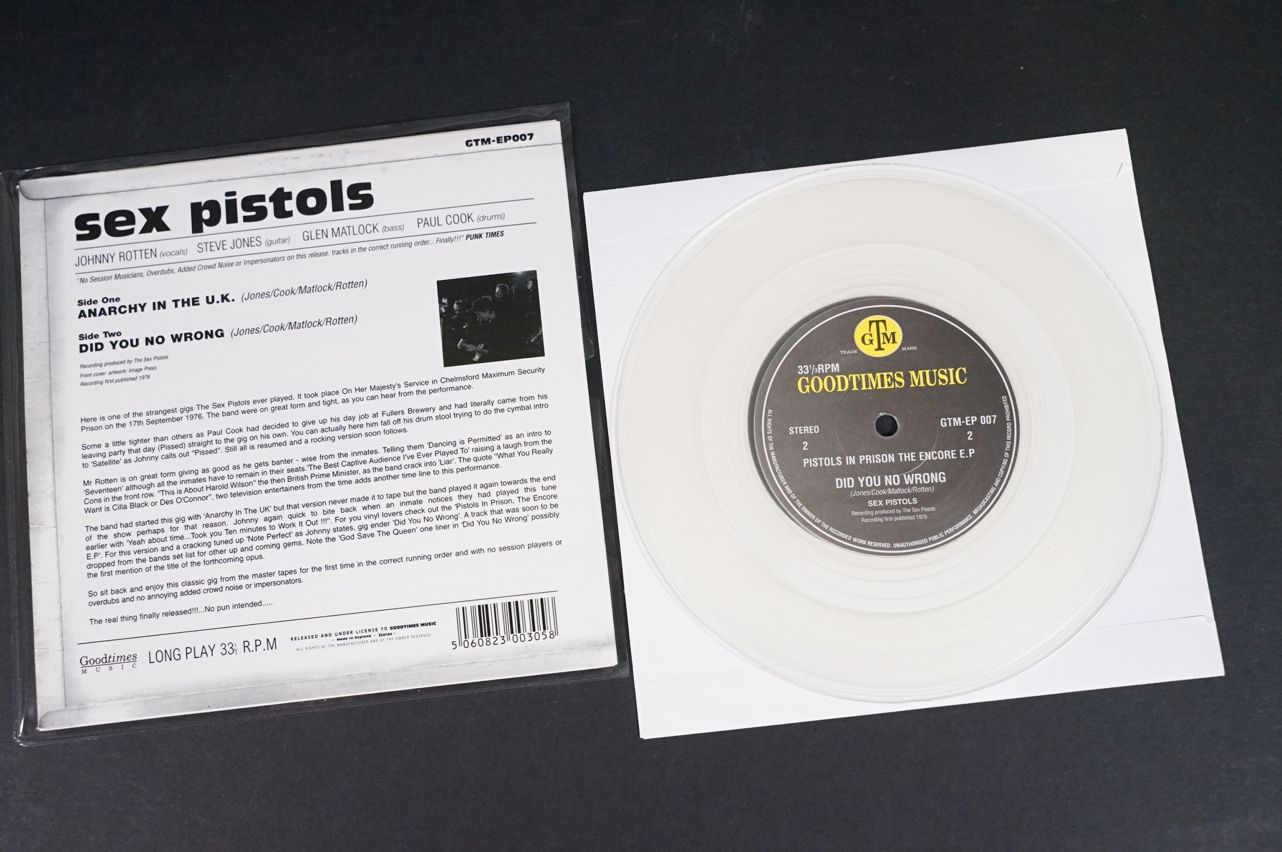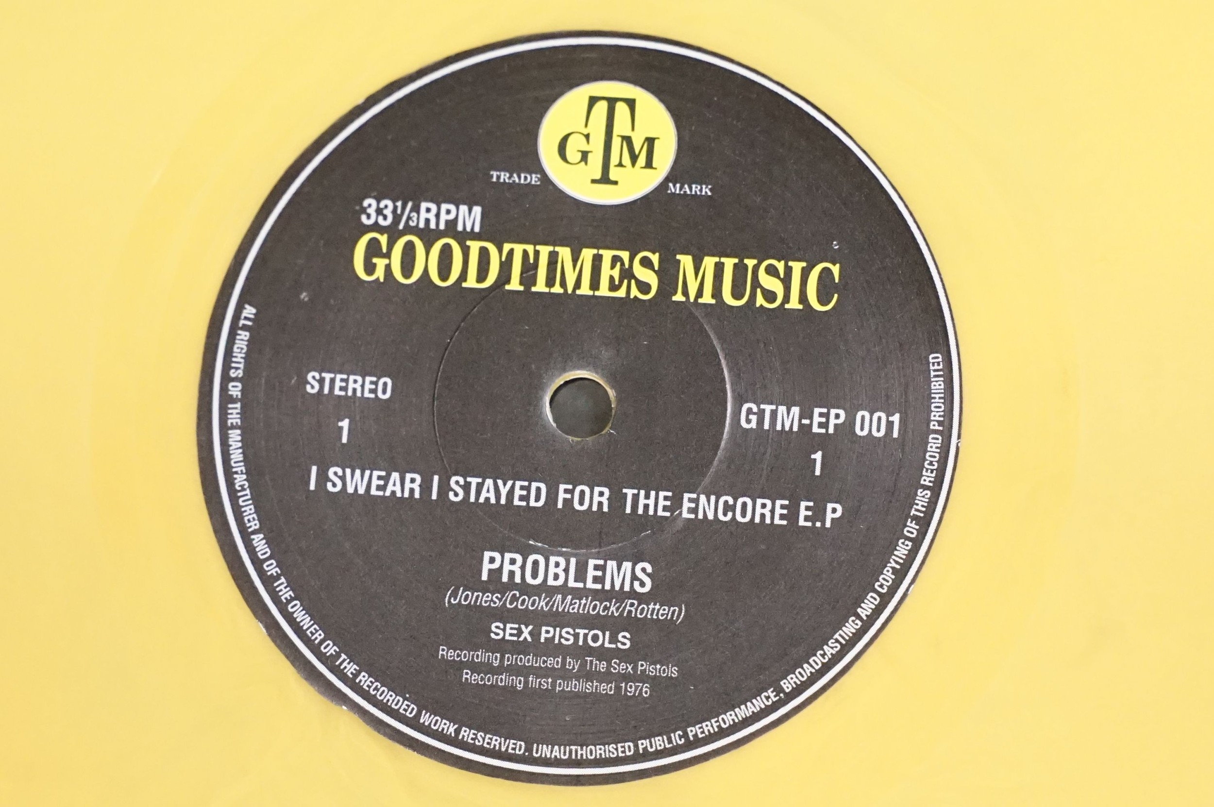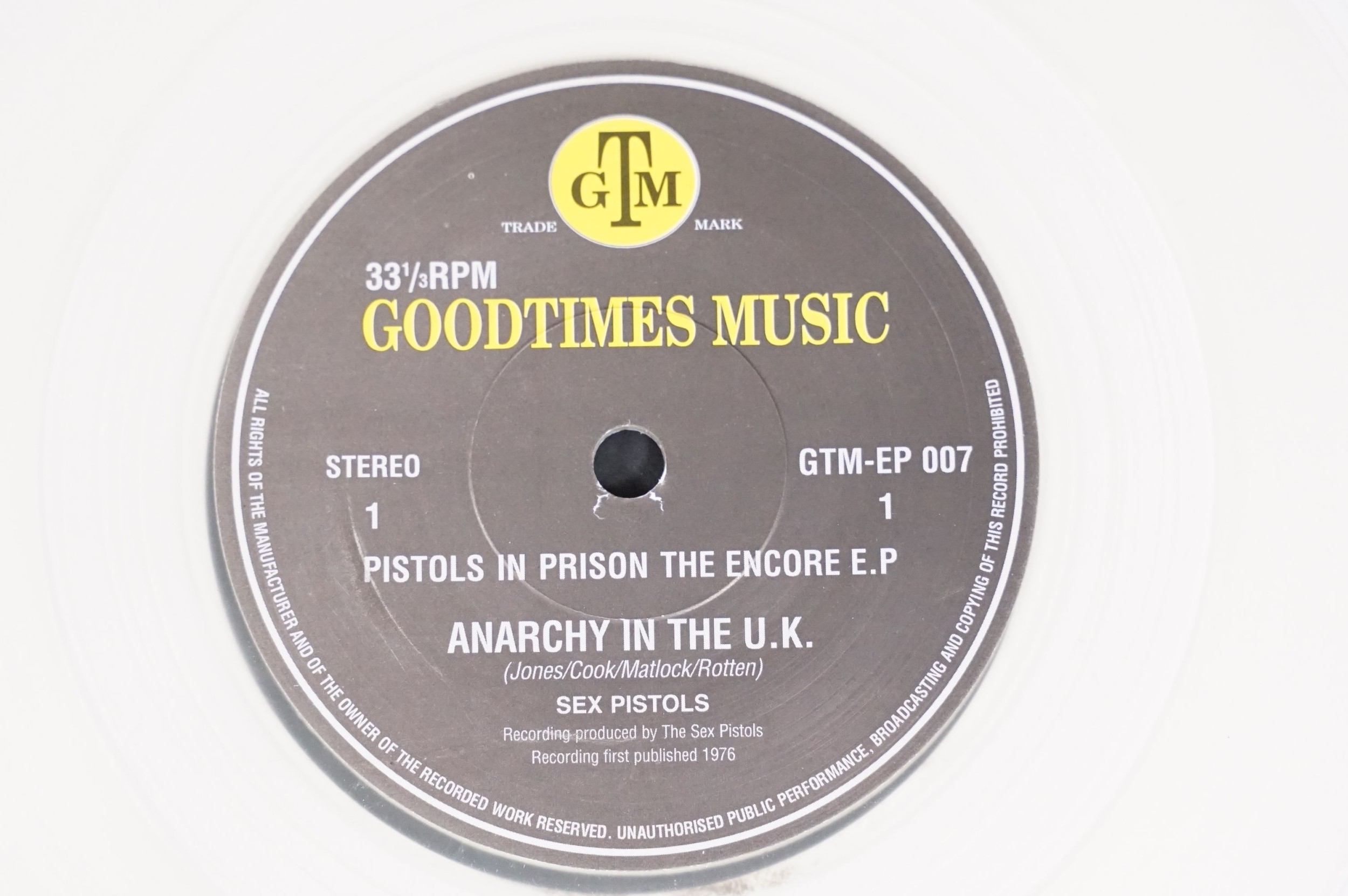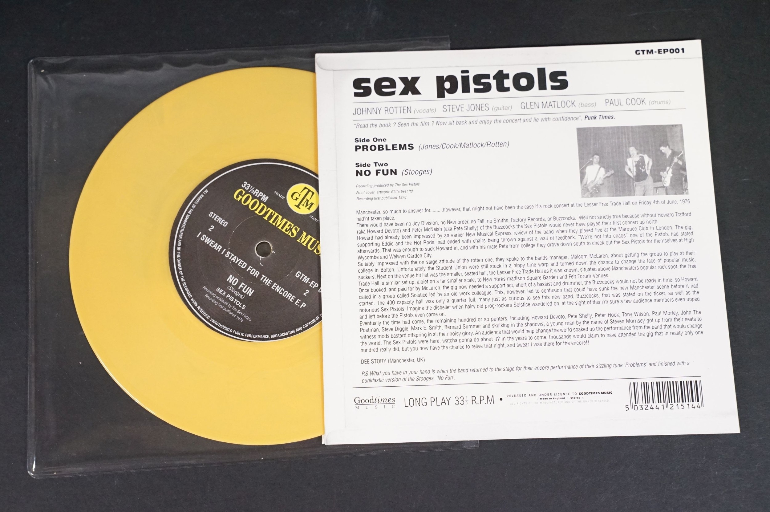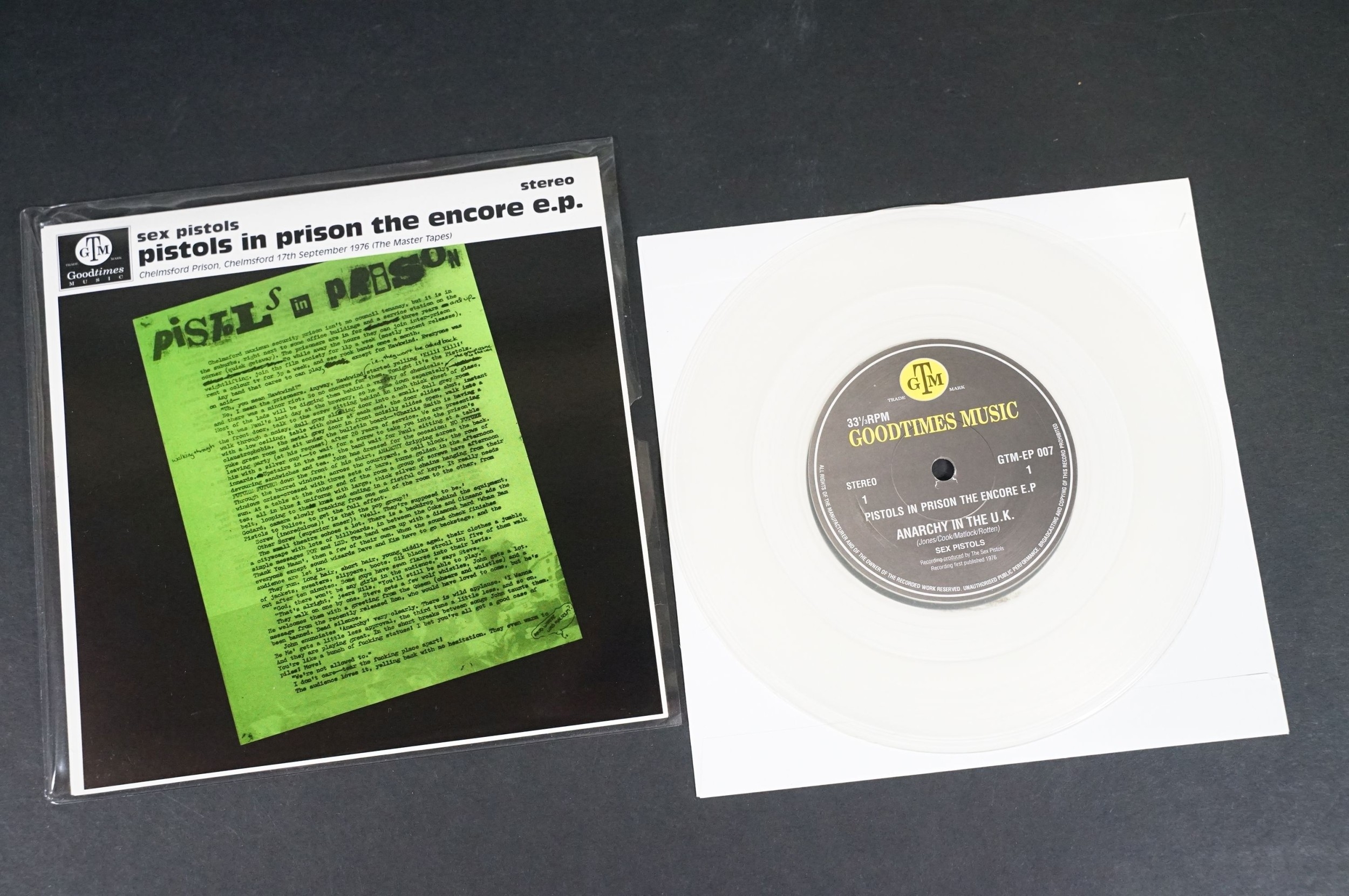Vinyl - Punk - Sex Pistols, 4 different coloured vinyl UK 2008 7” singles to include: Pistols In Prison The Encore E.P. x 2 (clear and pink vinyl), I Swear I Stayed For The Encore E.P. x 2 (pink and YELLOW vinyl), all with picture sleeves. EX+