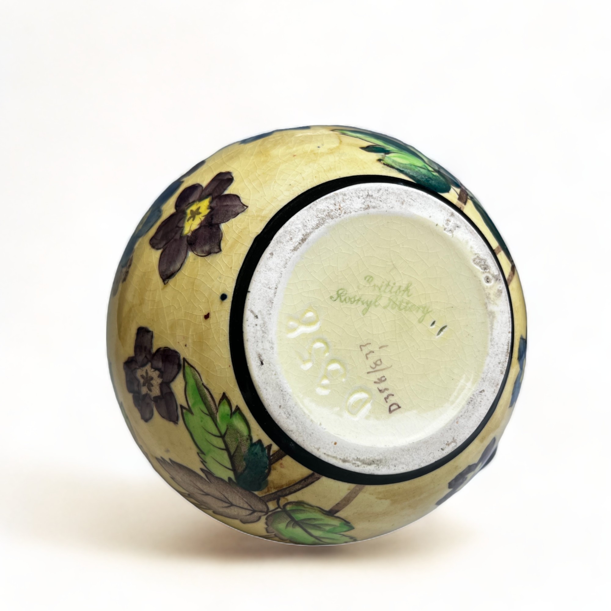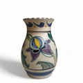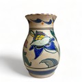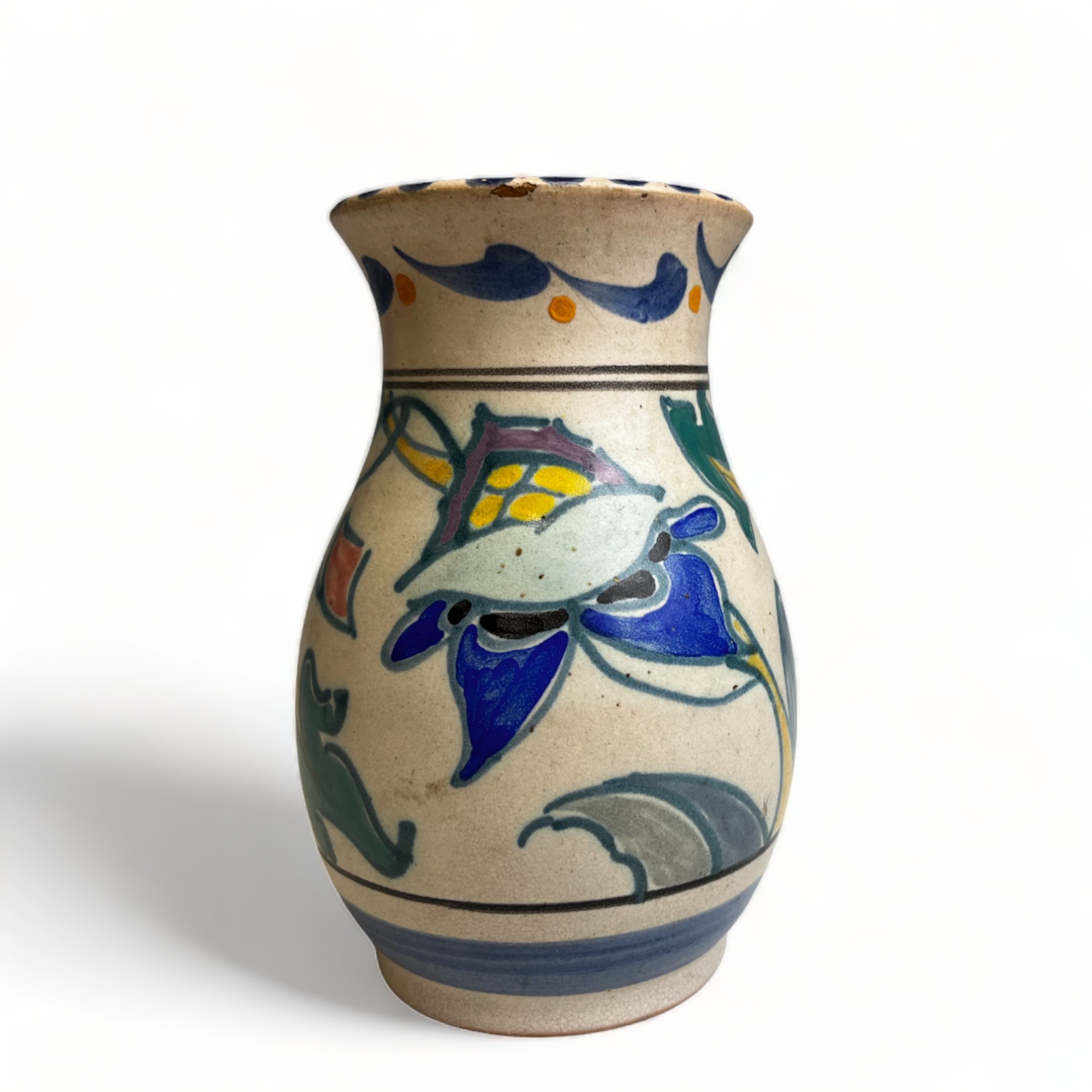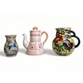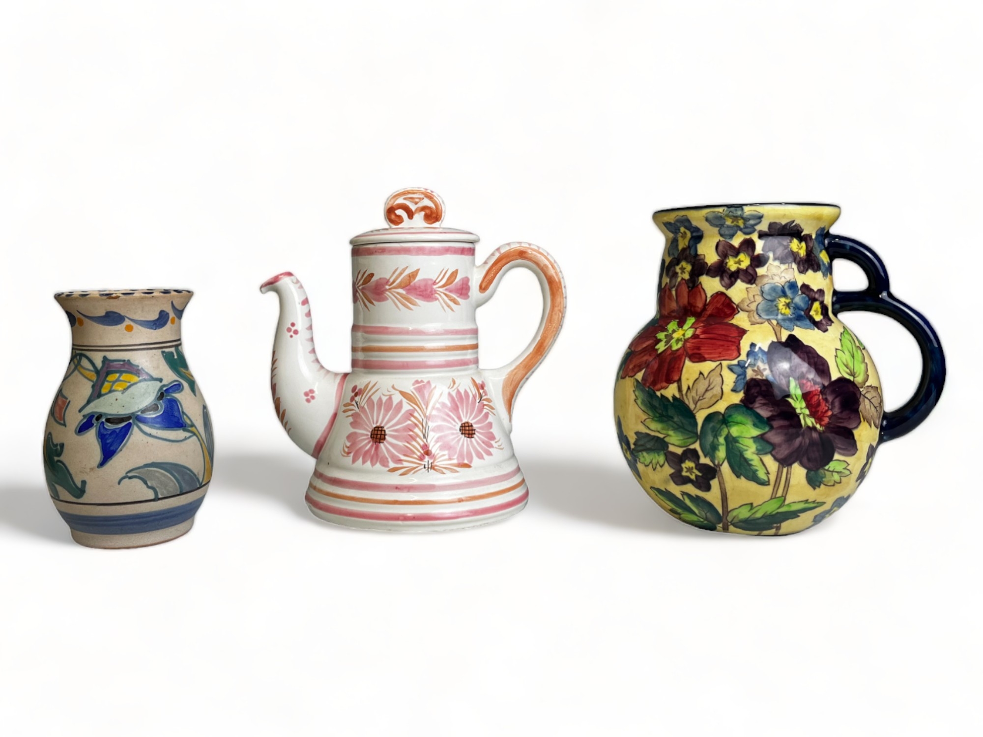 A collection of hand painted Art pottery. Including a Quimper teapot, British Roskyl pottery jug and an unmarked Poole? pottery vase.