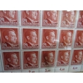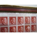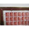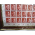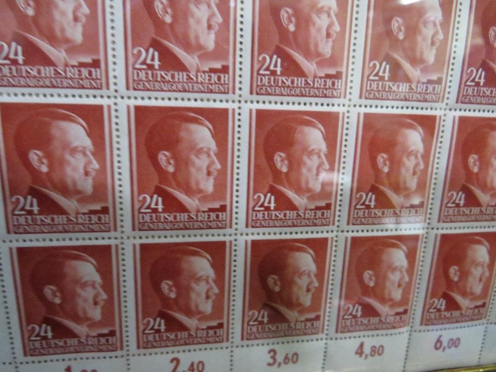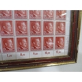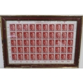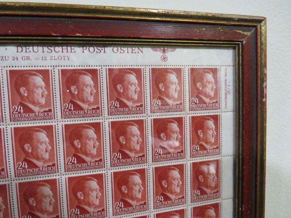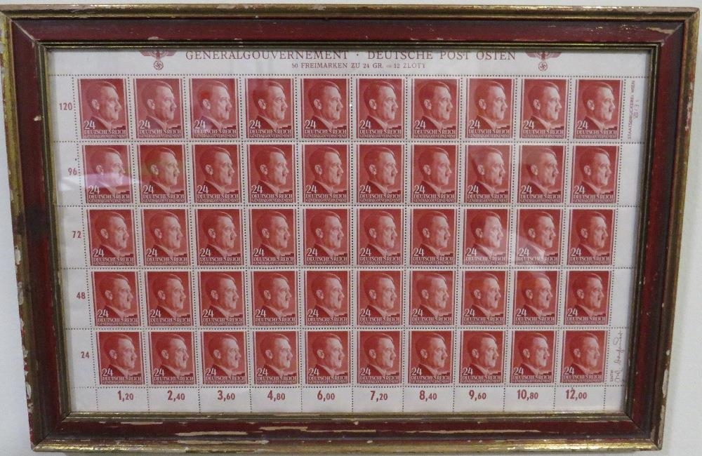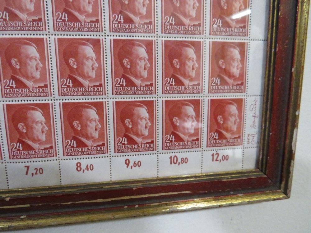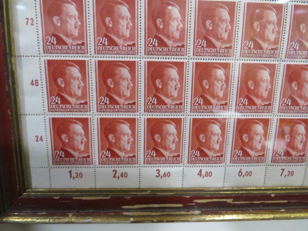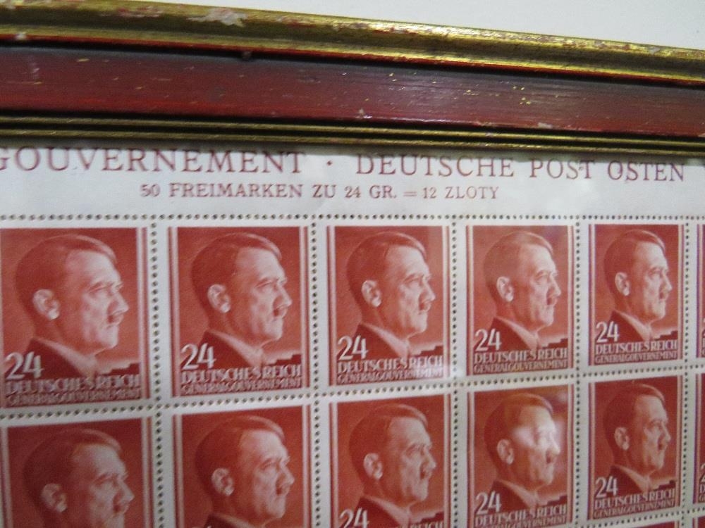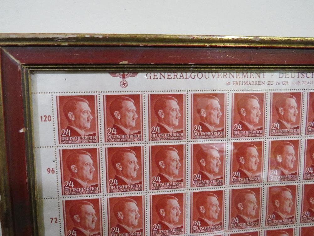 A SHEET OF 50 WW2 DEUTCHES REICH STAMPS SHOWING THE PROFILE OF ADOLF HITLER SET IN A PERIOD GLAZED FRAME