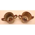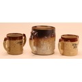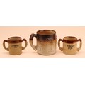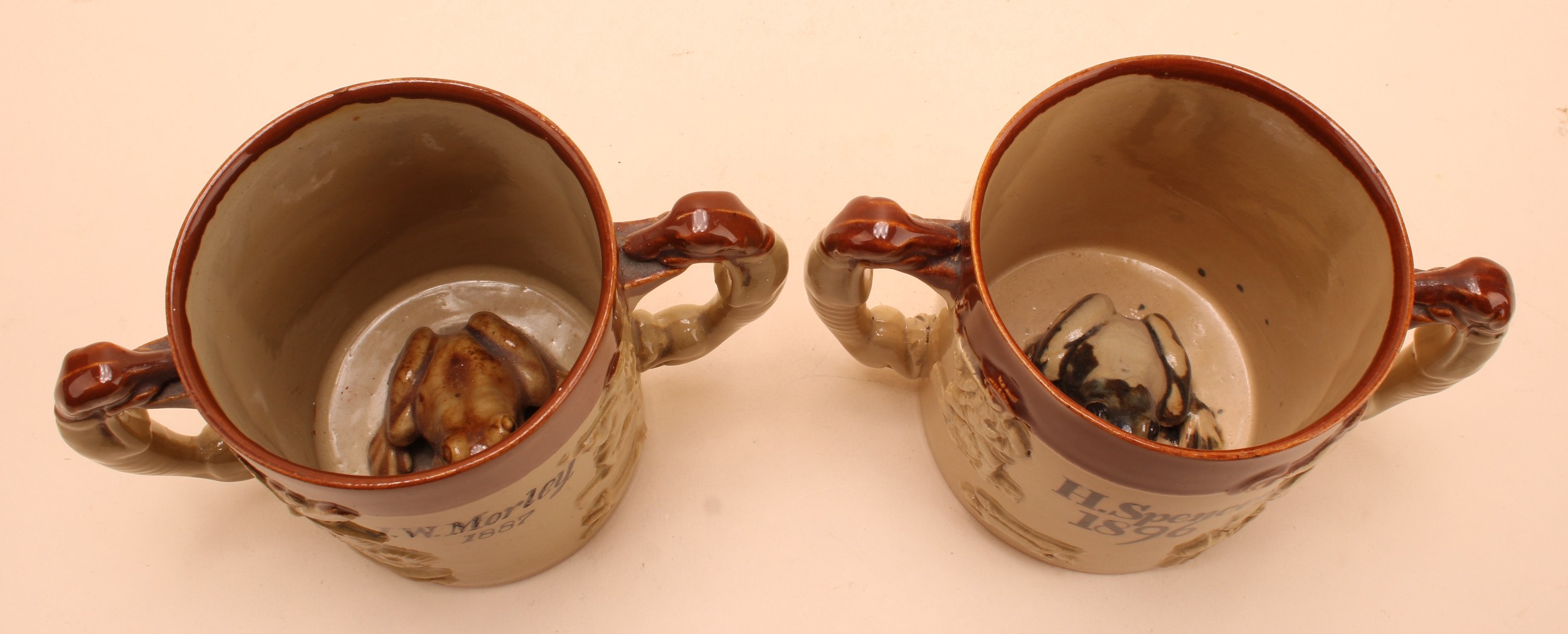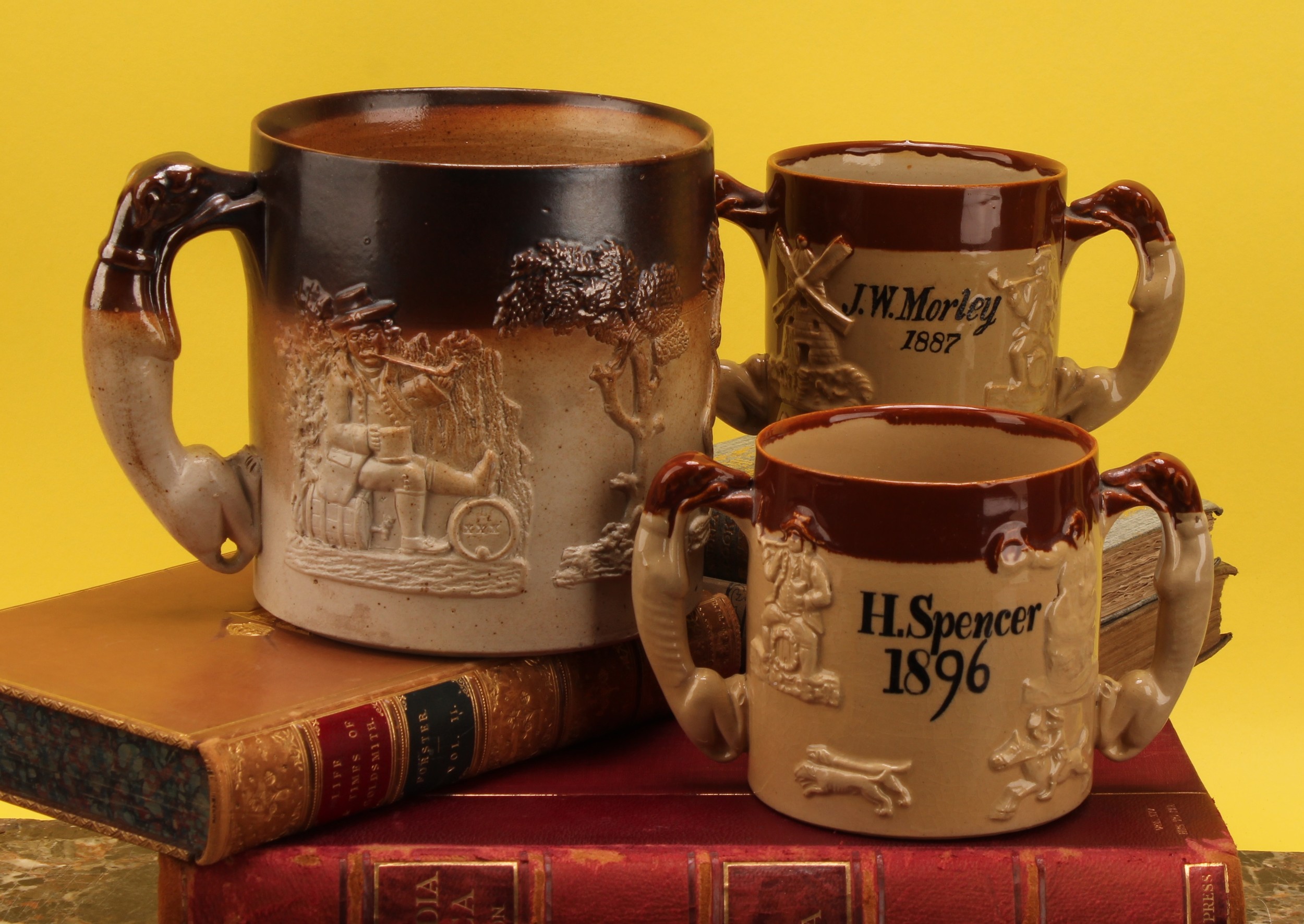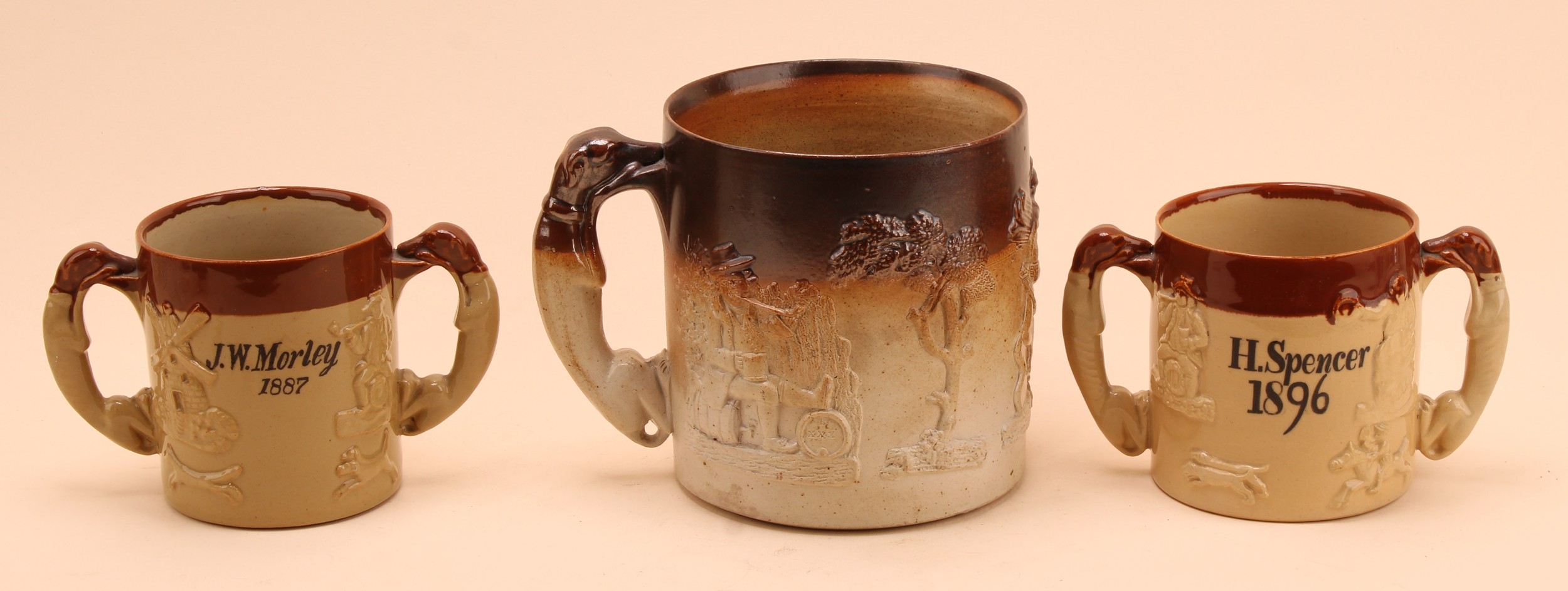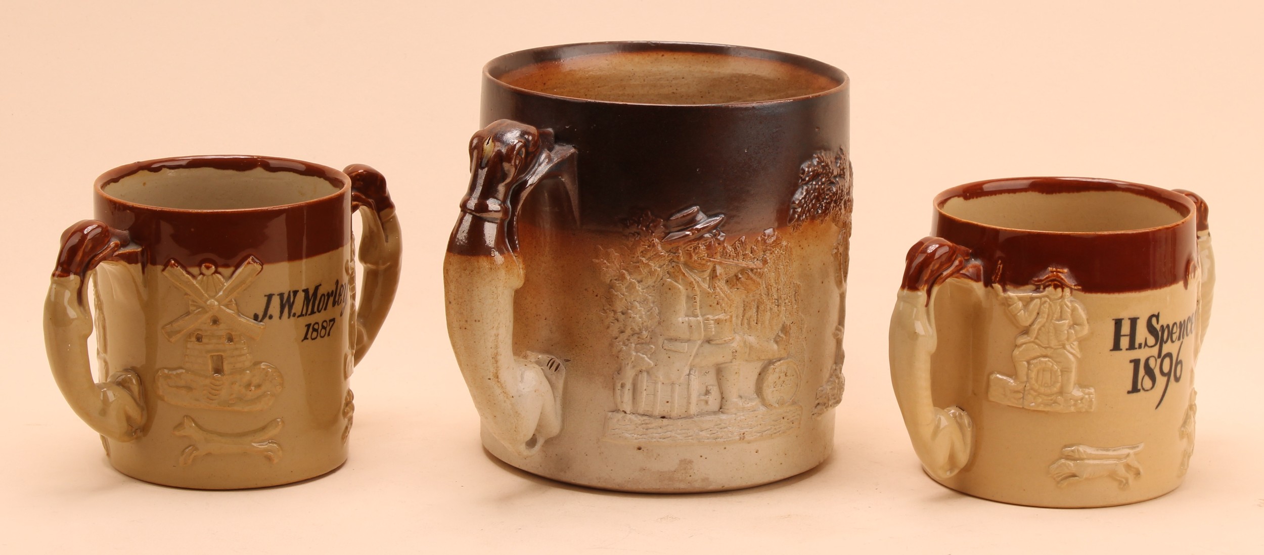 A large Denby salt glazed mug, single greyhound handle, sprigged with George and the Dragon, Windmill, Toper and Tree, 15cm, early 19th century; a Denby two-handled christening frog mug, J.W. Morley 1887, pair of greyhound handles, frog inclusion, 11cm; another, H. Spencer 1896, frog inclusion, 10.5cm (3)
