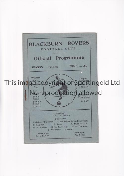 ARSENAL Programme for the away League match v Blackburn Rovers 15/11/1947, rusty staple. Arsenal Championship season. Generally good
