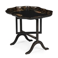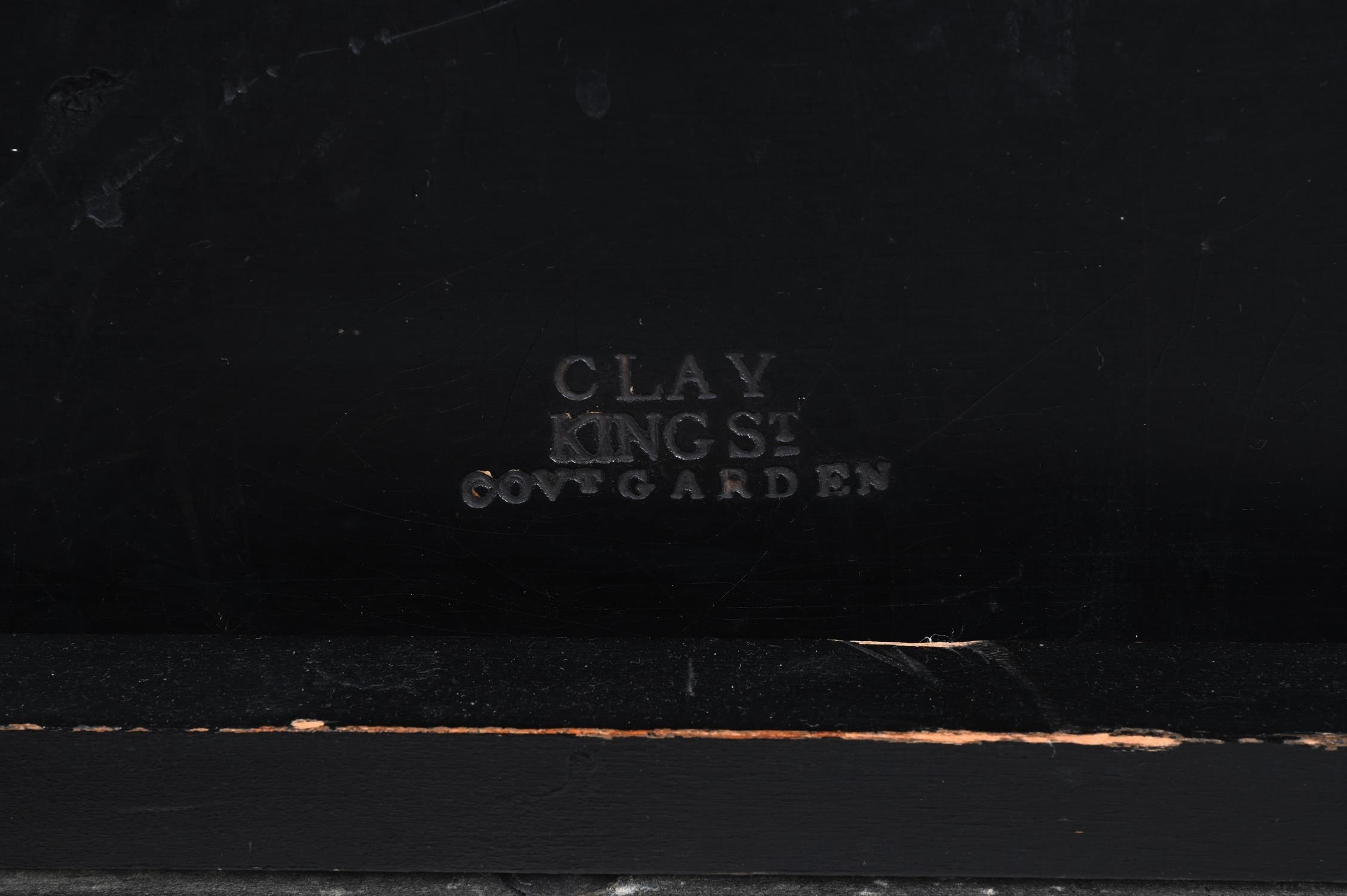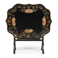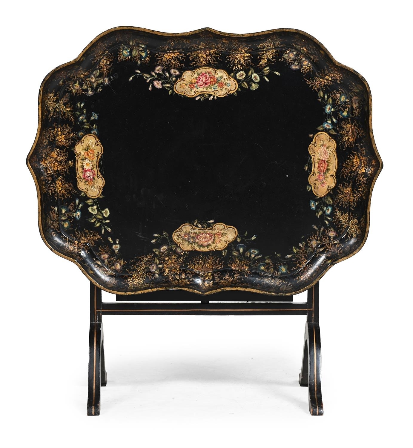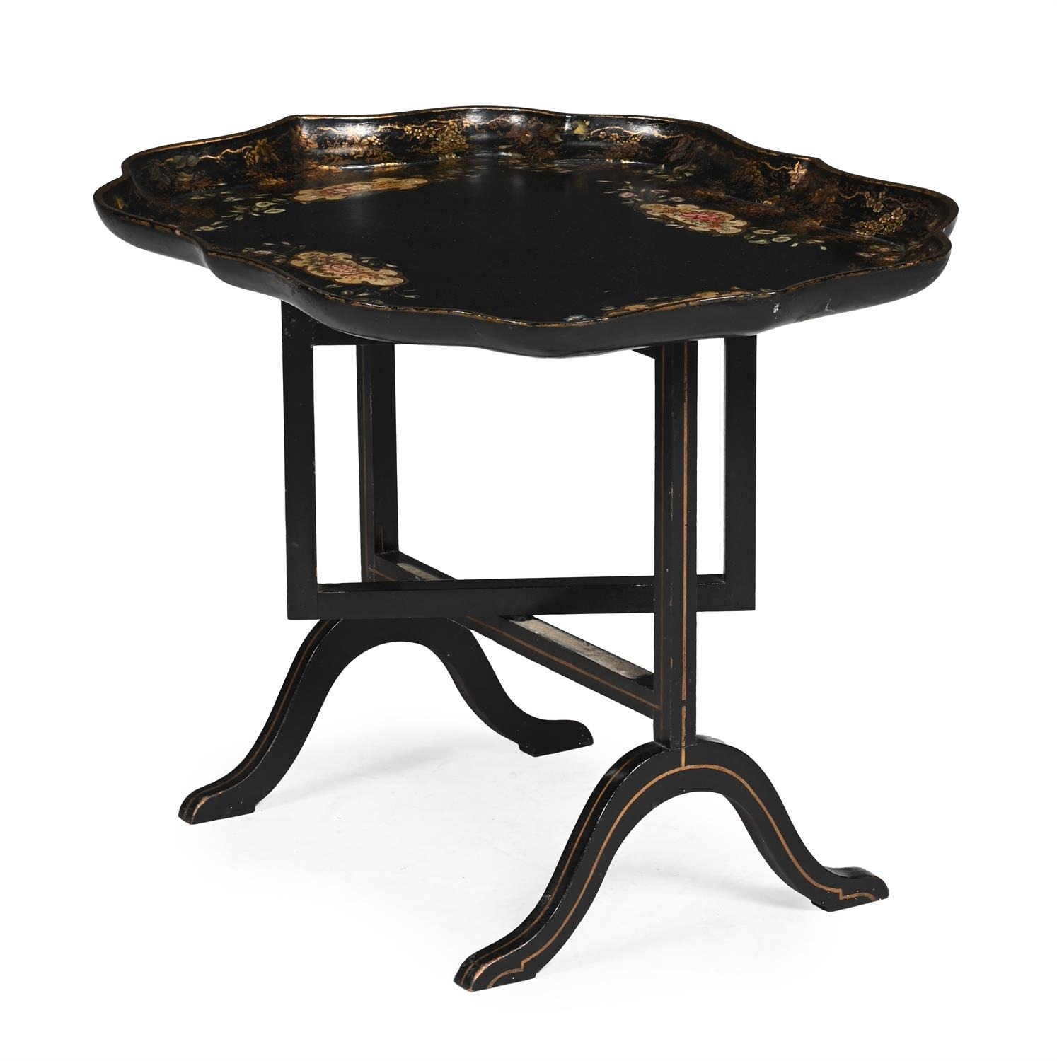 A HENRY CLAY PAPIER MÂCHÉ TRAY ON STANDEARLY 19TH CENTURY AND LATERStamped to underside 'CLAY KING ST. COVT GARDEN'The later base with tilt top action57.5cm high, the tray 78 x 59cm