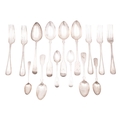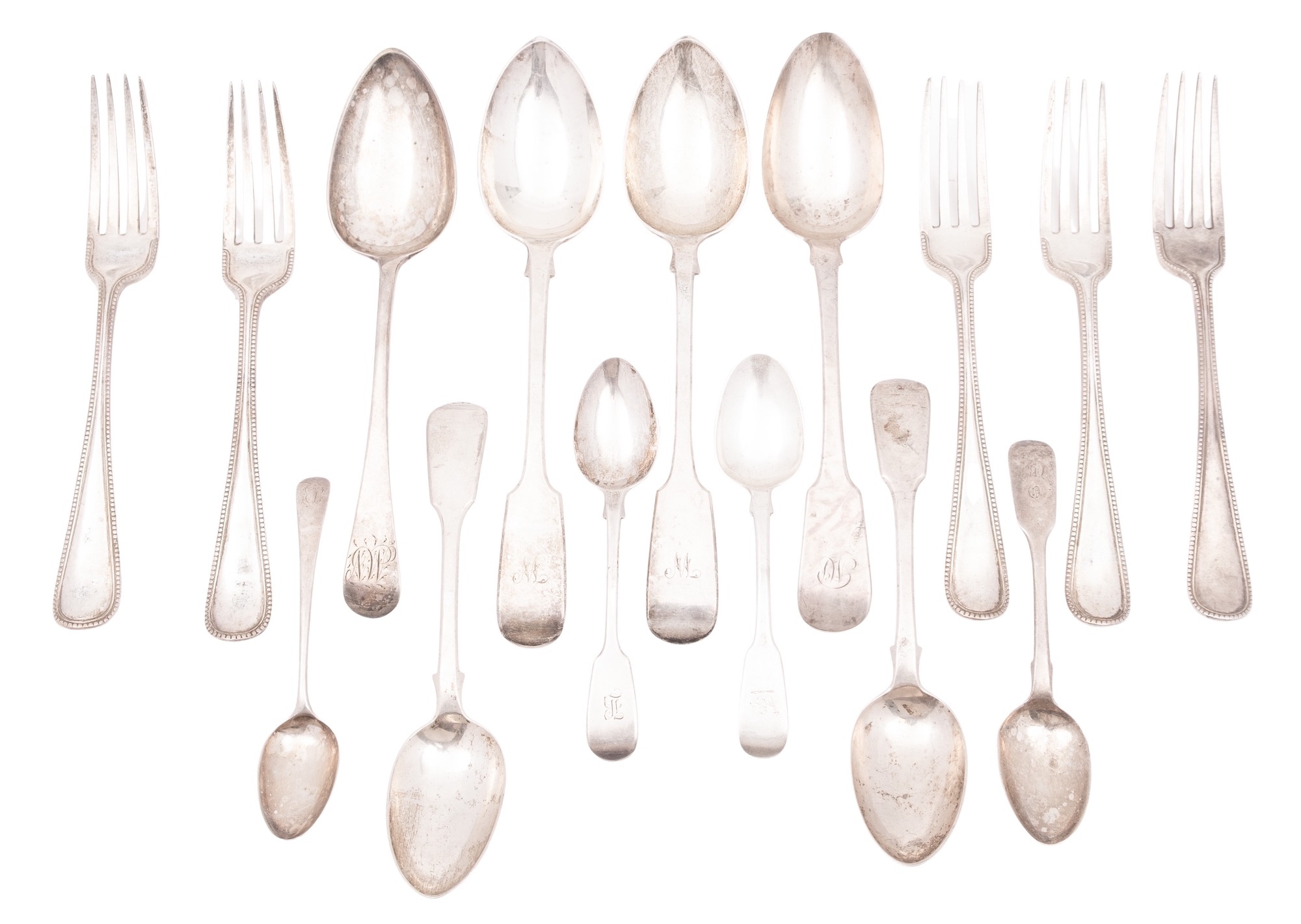 Mixed silver flatware, to include a set of 5 Victorian Old English Bead pattern table forks, by Chawner & Co., London 1865/66, an Old English pattern table spoon & teaspoon and the following in Fiddle pattern; 3 tablespoons, 2 dessert spoons and 3 teaspoons, some of the above crested or initialled, mixed makers & dates; 31ozt (15)