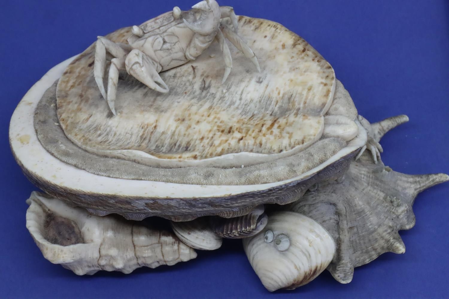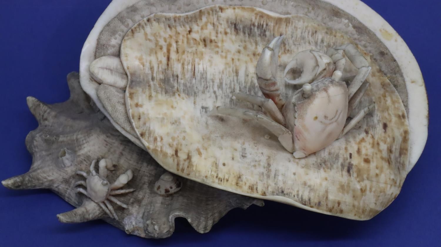 Carved ivory of a crab on a shell with small crab and seashells below. Large crab is missing a leg, L: 150 mm. P&P Group 1 (£14+VAT for the first lot and £1+VAT for subsequent lots)