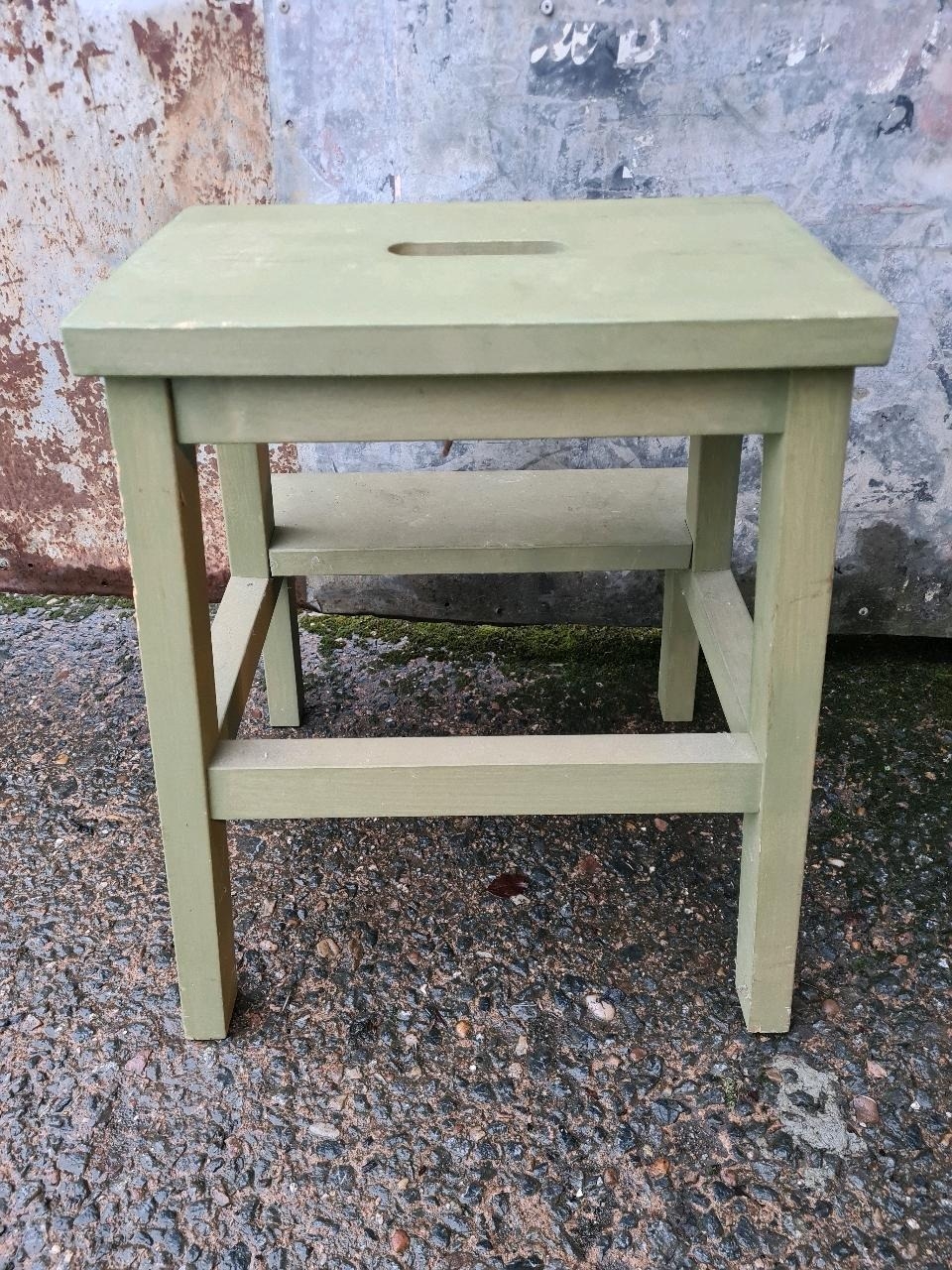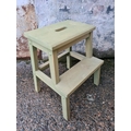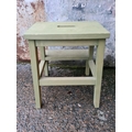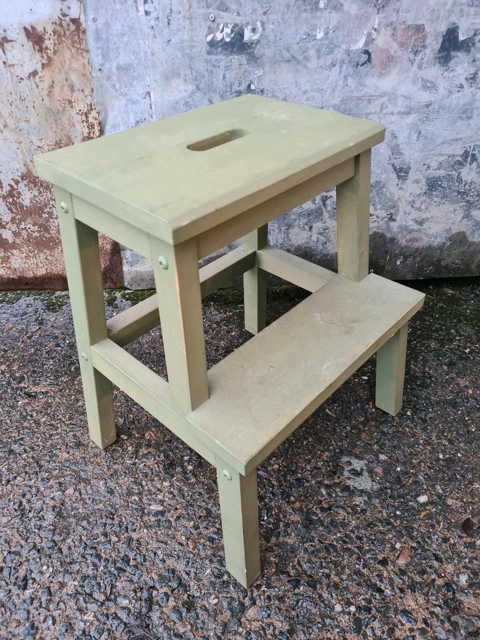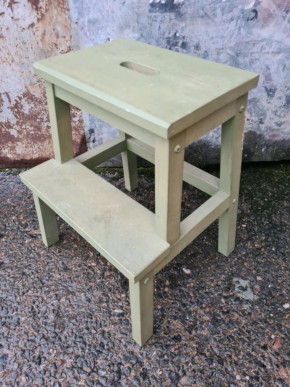 Wooden two-step stool painted pale sage green. Approx H53cm.
