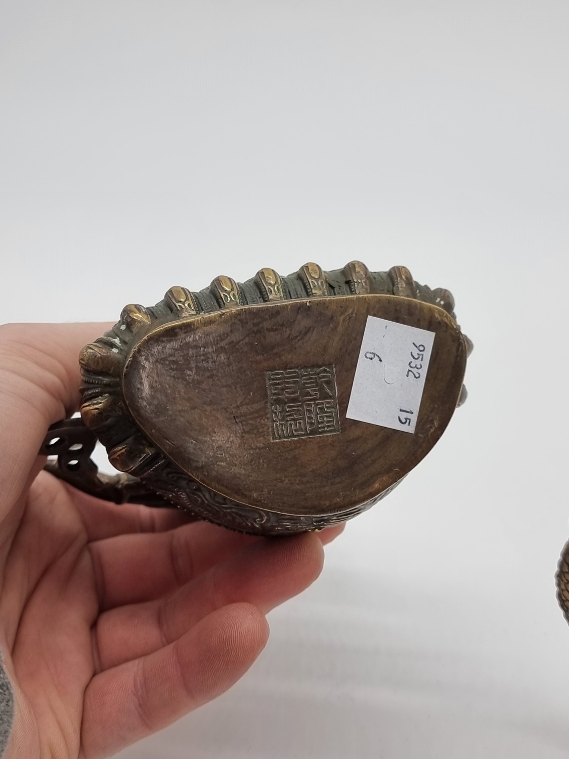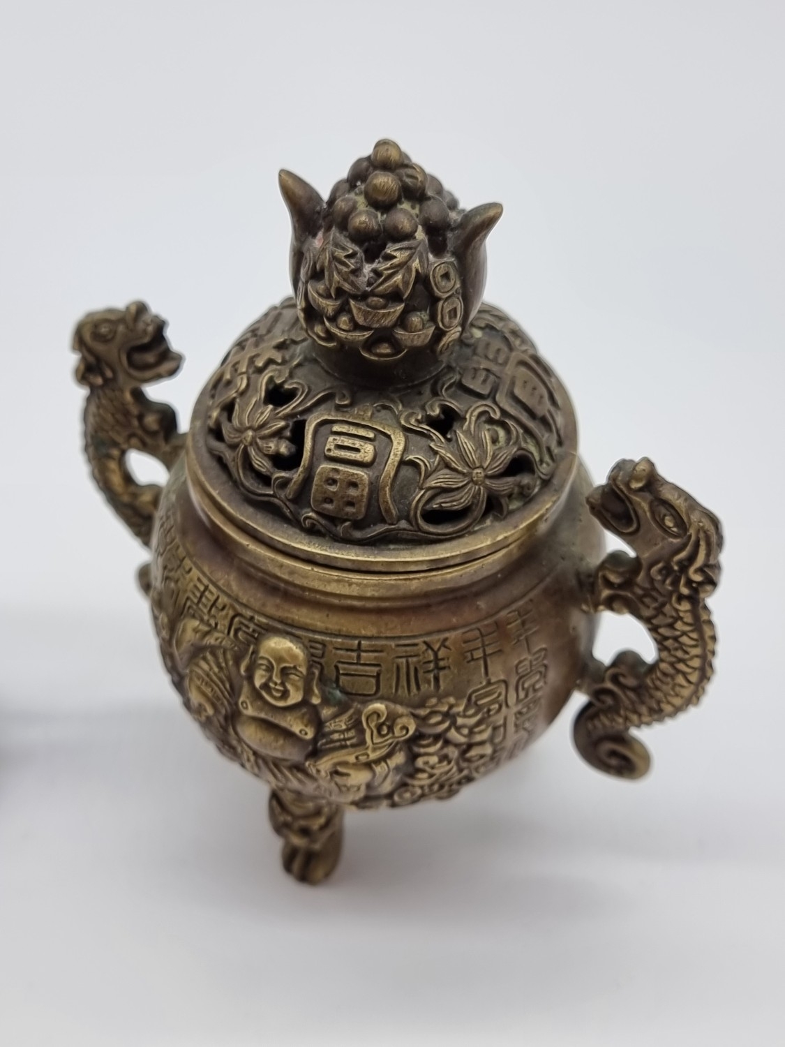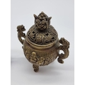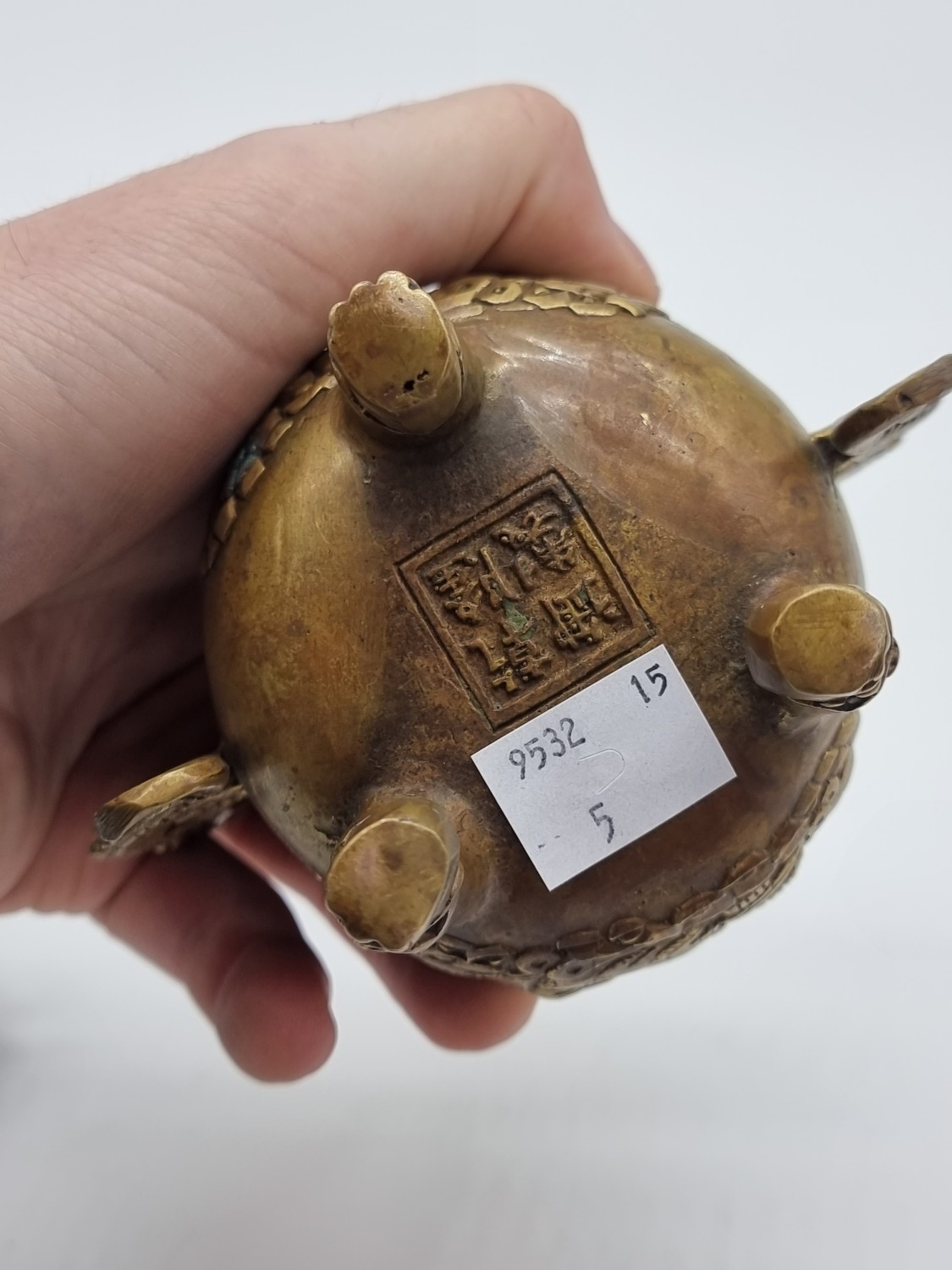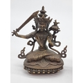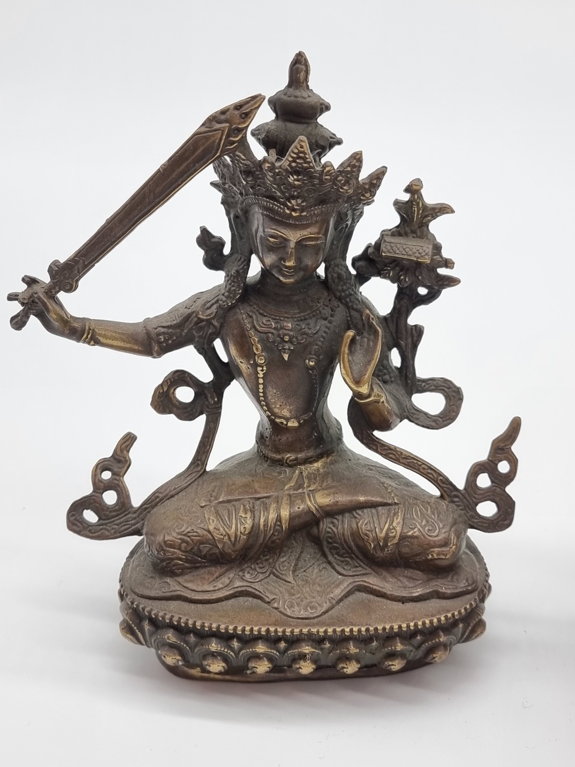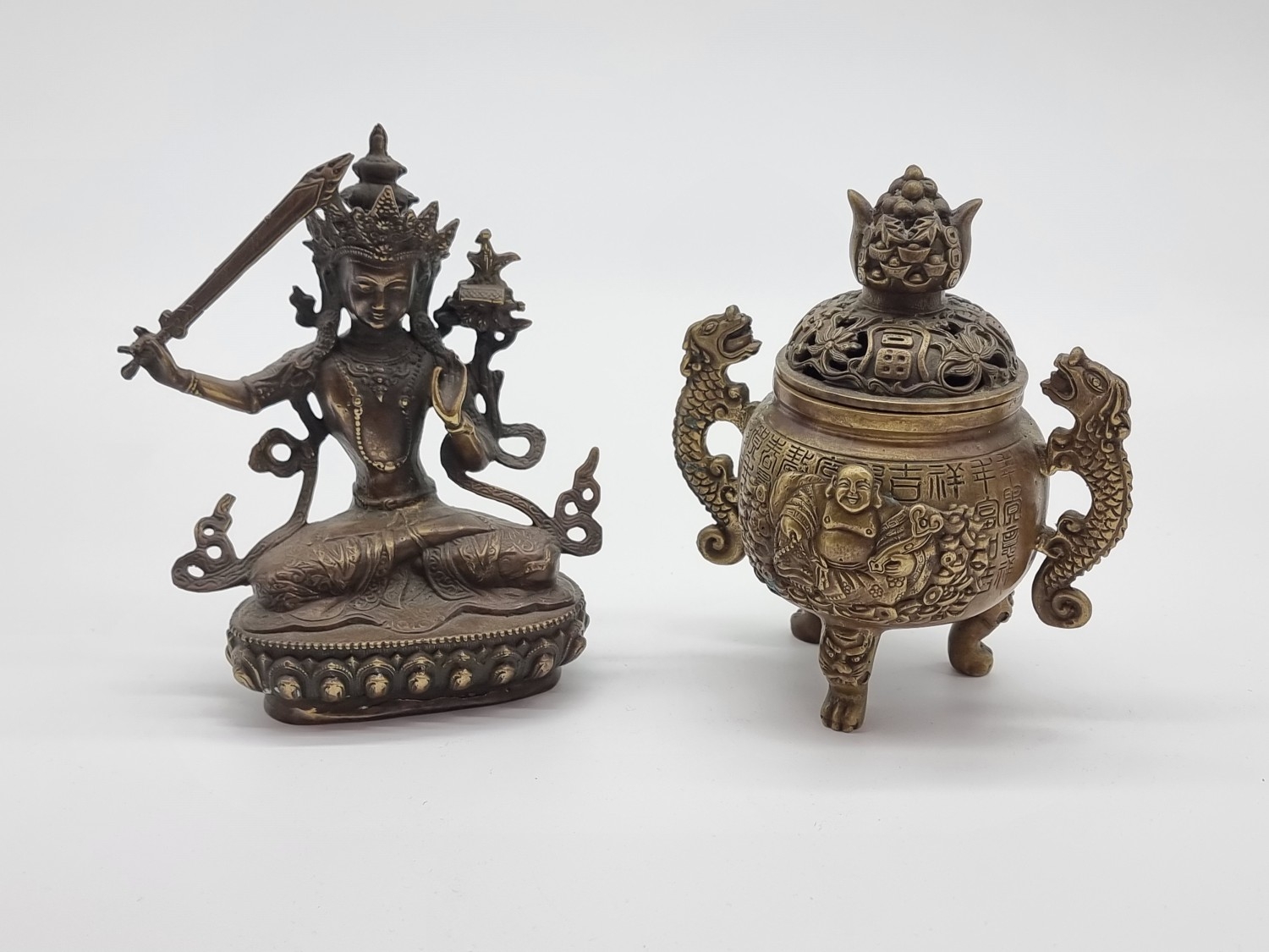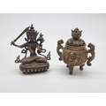A Sino-Tibetan bronze figure of Manjushree, 14cm high; together with another bronze tripod censer and cover, 13.5cm high. (2)