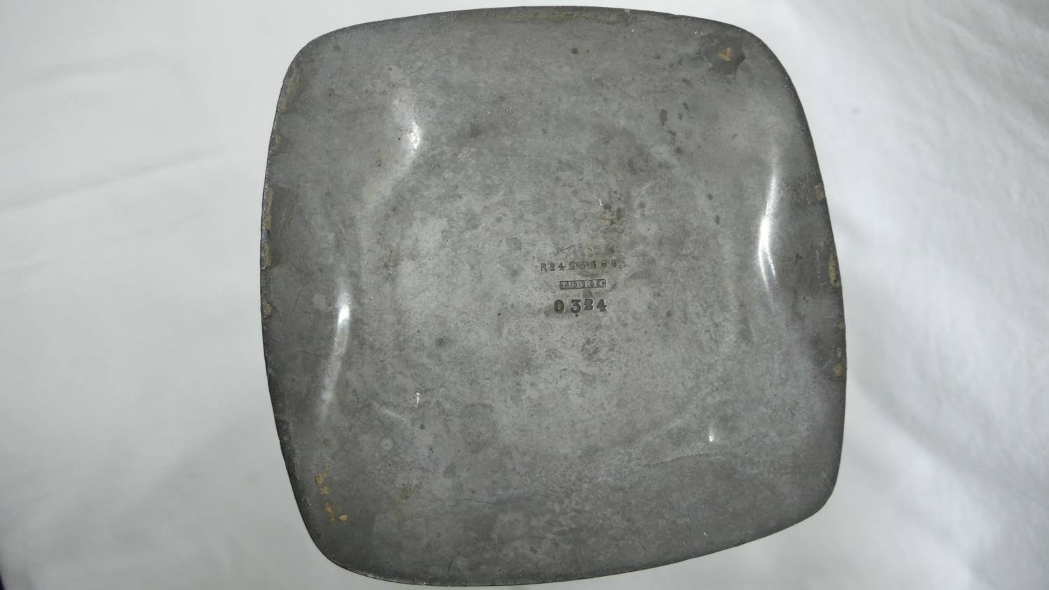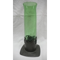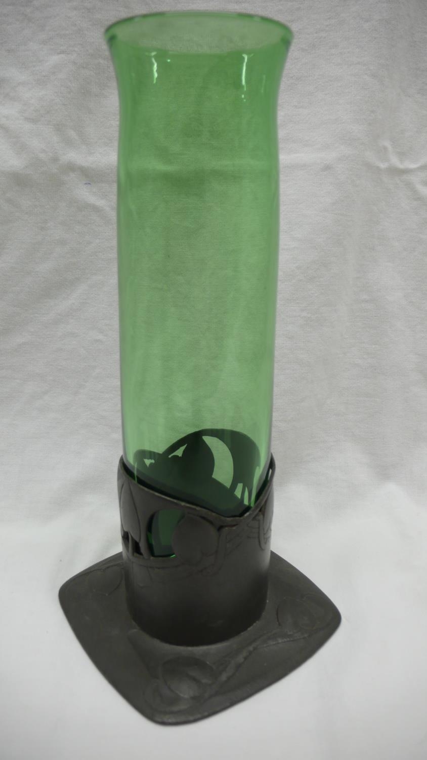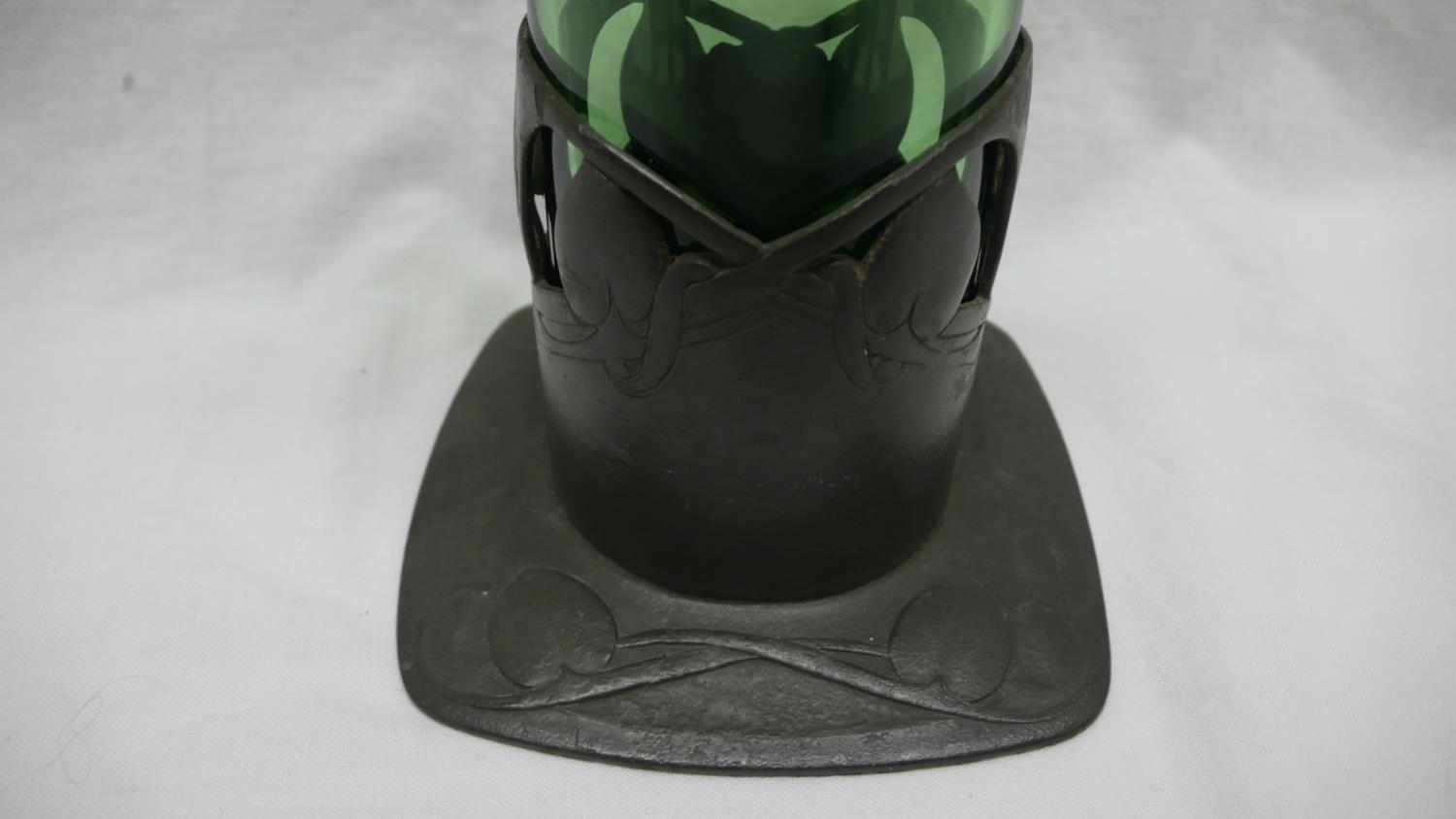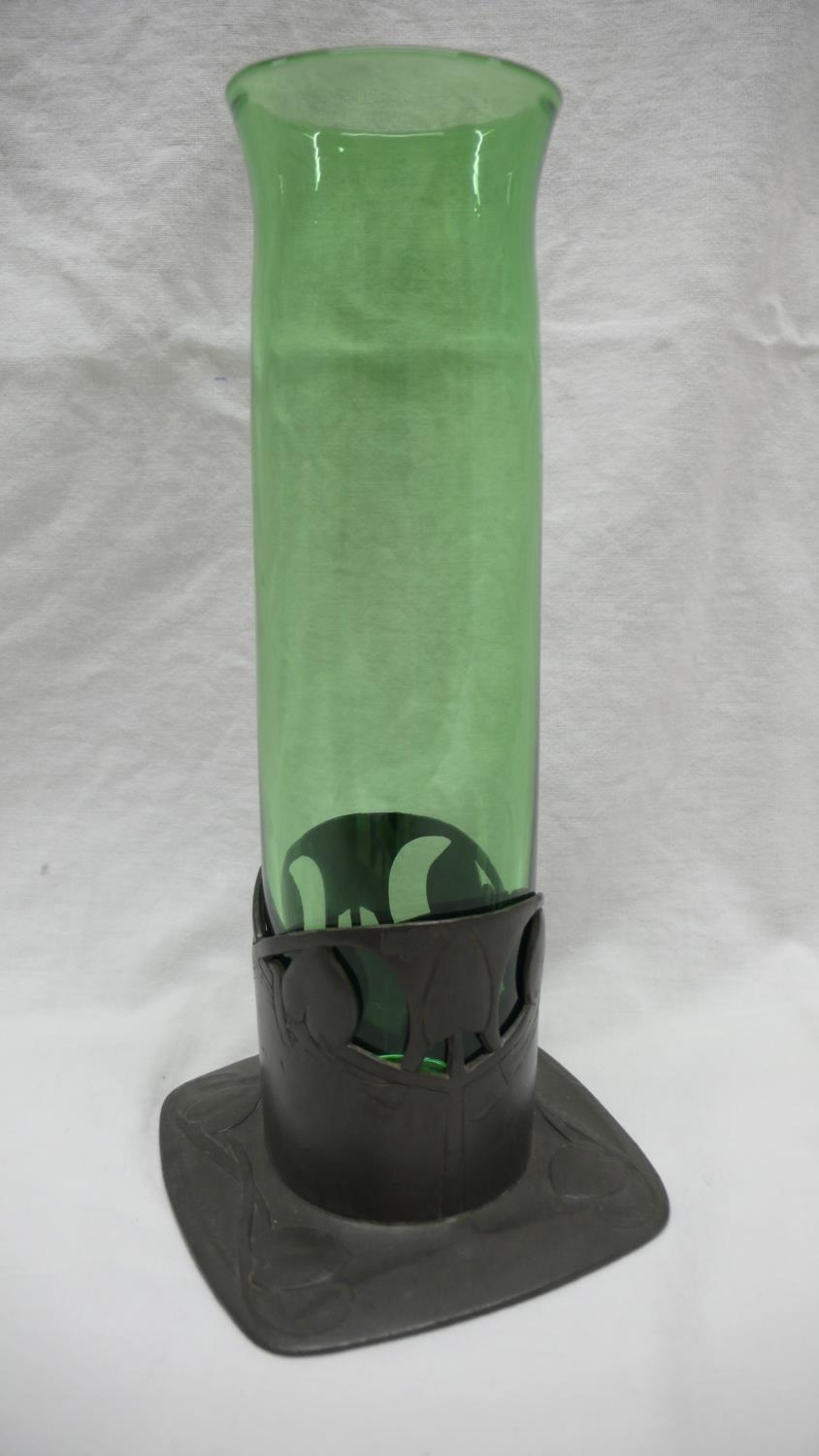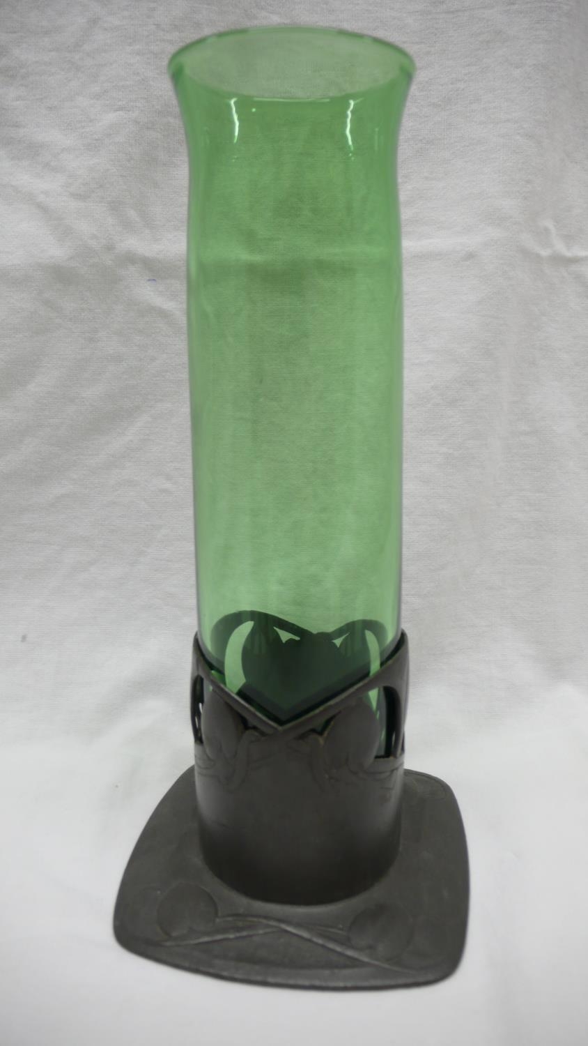 Archibald Knox for Liberty & Co. Tudric Pewter and green glass vase with stylized leaf decoration, circa 1902-05, Ht. 20.5 cms