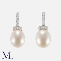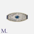 A Sapphire Pearl and Diamond Brooch in yellow gold and platinum, of openwork design, set with a central oval shaped sapphire, accented by round cut diamonds, flanked either side by a row of pearls and terminating at each end with a pair of French cut sapphires. Unmarked, tests indicate 18 carat gold and platinum.