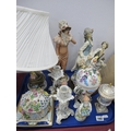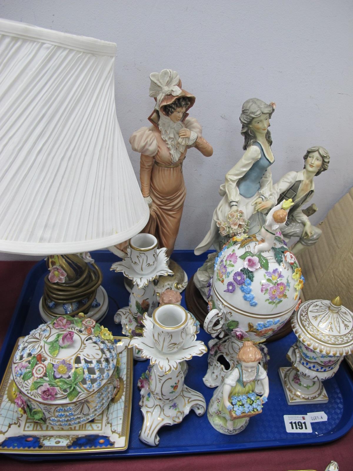 Dresden Bowl and Cover, with floral decoration, pair of Dresden candlesticks with scroll bases, a pair of Dresden figures, Dresden vase and cover:- One Tray.