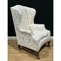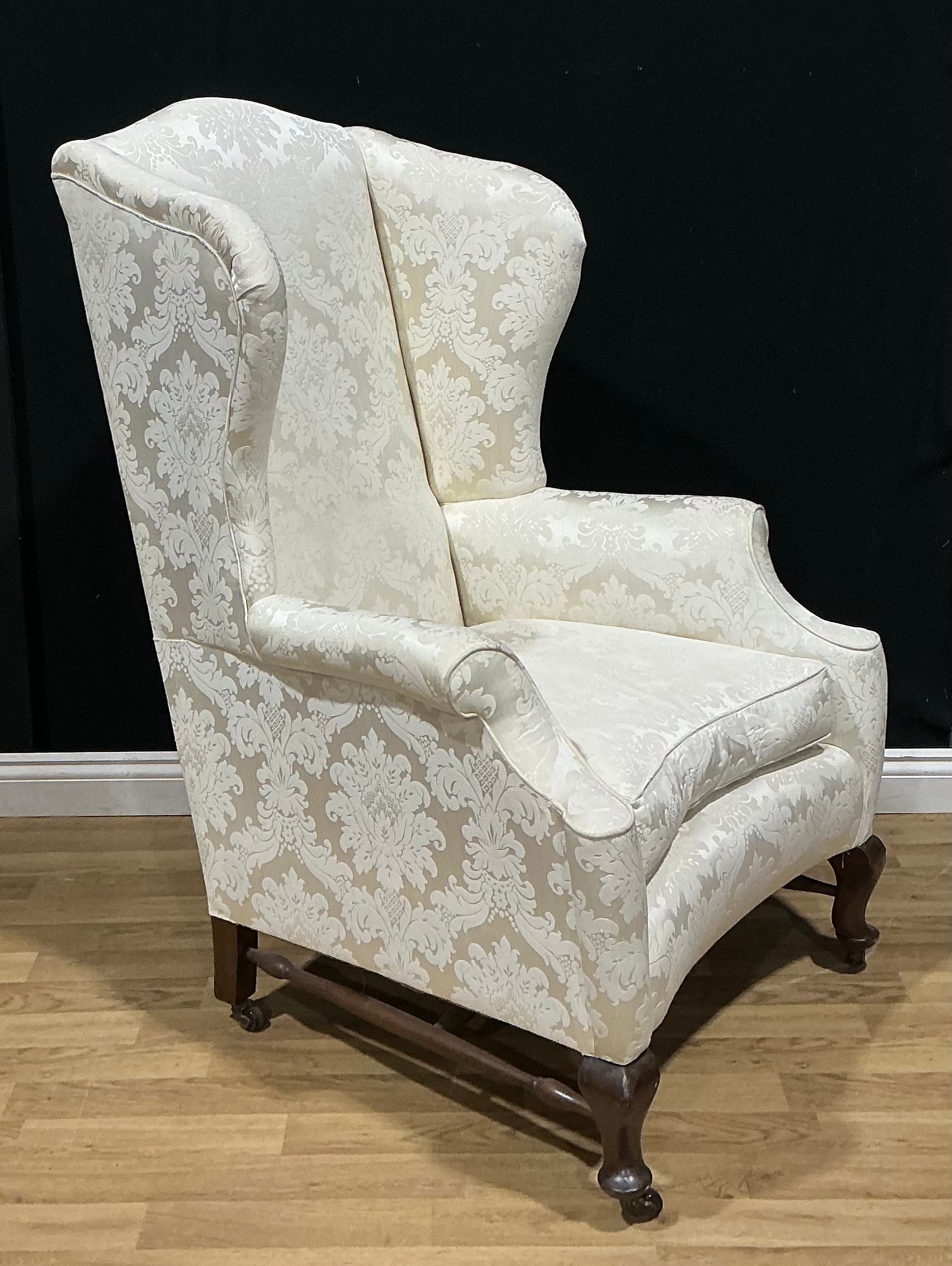 A George II Revival wingback armchair, traditionally upholstered in an ivory coloured damask, concave sea, turned H-stretcher, cabriole legs, brass castors, 20th century