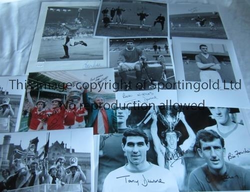 MANCHESTER UNITED AUTOGRAPHS Eight signed photos: A 10" X 8" b/w photo of Manchester United on their open top bus parade after winning the 1977 FA Cup signed by Alex Stepney in black pen and signed 10" X 8" B/W photo in action for United away at Liverpool in their 4-1 win on 13/12/1969. A 13" X 10" b/w Legend Series picture autographed in blue pen by Brian Kidd. Signed 10" X 8" b/w photo of Dunne posing beside the European Cup. A 10" X 8" b/w photo of Kidd and Stepney lifting weights in training, signed by both. A signed 10" X 8" b/w photo of Bill Foulkes posing in training. A 10" X 8" colour photo on the lap of honour after the 1977 FA Cup Final signed by Sammy McIlroy, Stuart Pearson and Tommy Docherty. A 16" X 12" B/W montage of the 1968 European Cup winners signed by Aston, Sadler, Foulkes, Dunne and Stepney. Very good