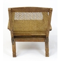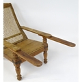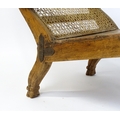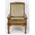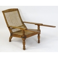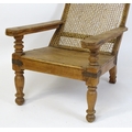 A late 19thC teak plantation chair with a caned backrest, planked seat and raised on turned tapering front legs. 25" wide x 36" deep x 35" high.