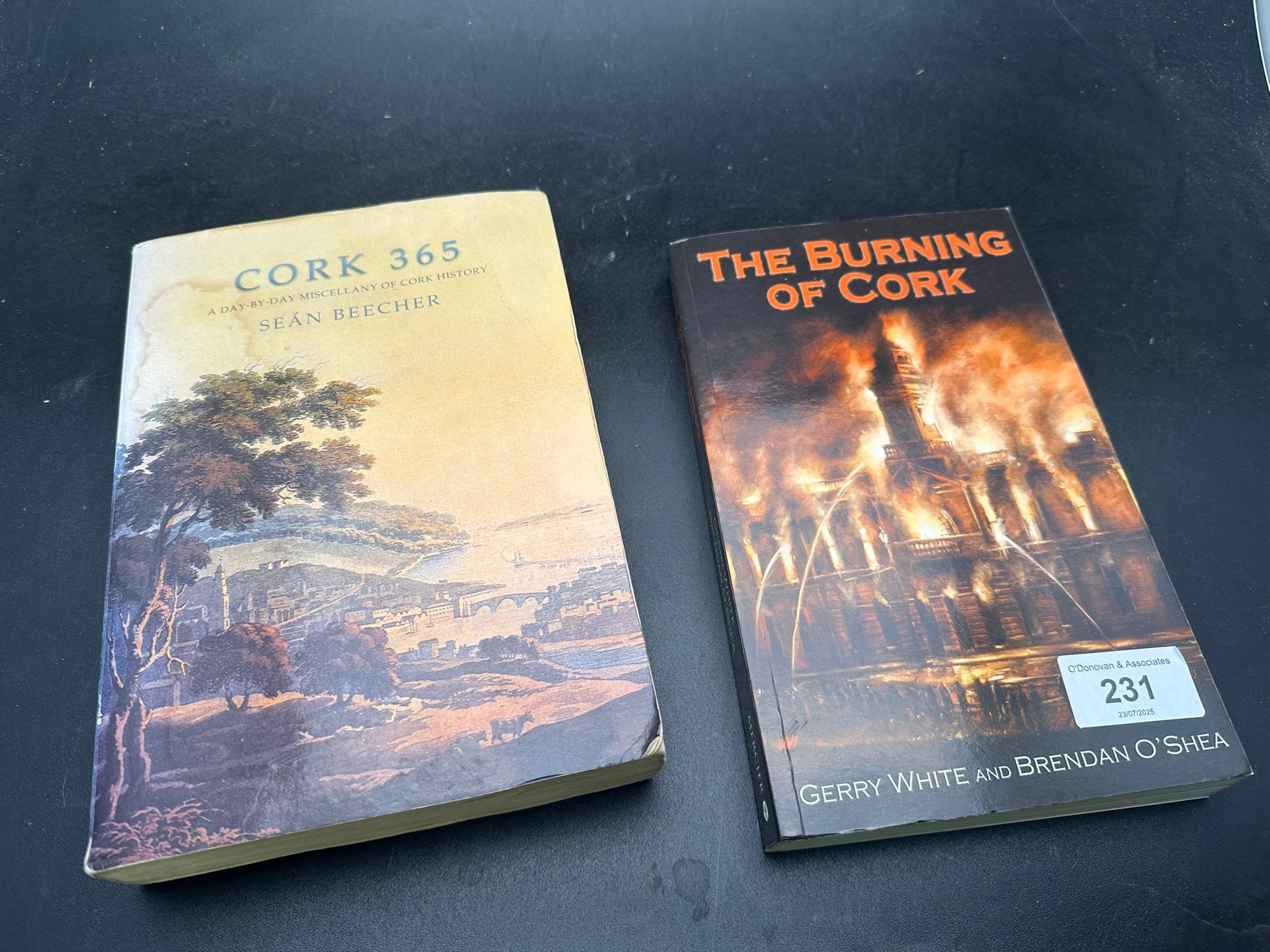 Cork 365: A Day-by-Day Miscellany of Cork History — Sean Beecher. Collins, 2005. Paperback, fair condition; some creasing, discolouration, possible notes/highlighting & The Burning of Cork — Gerry White & Brendan O’Shea. Mercier Press, 2006. First edition.