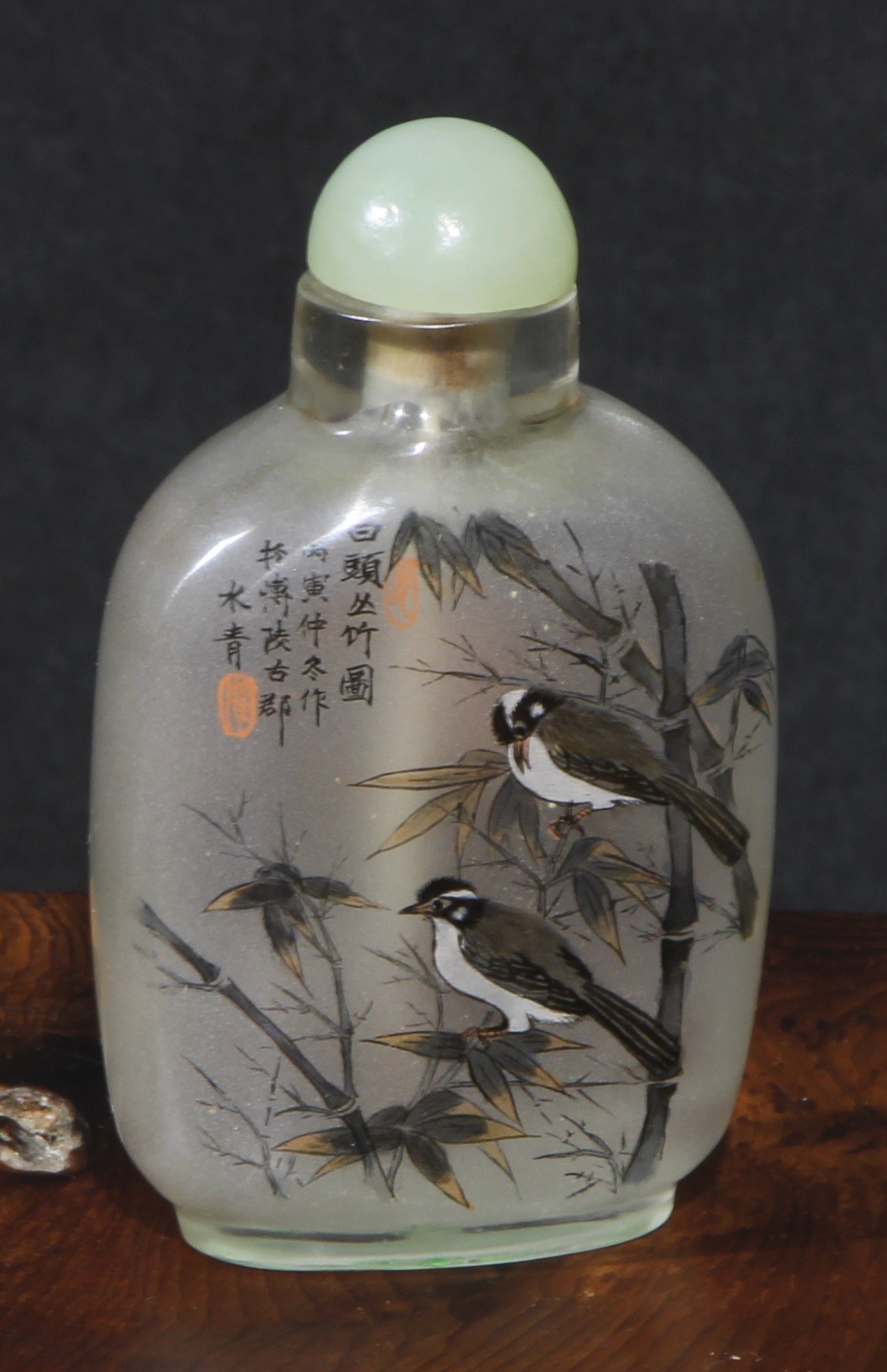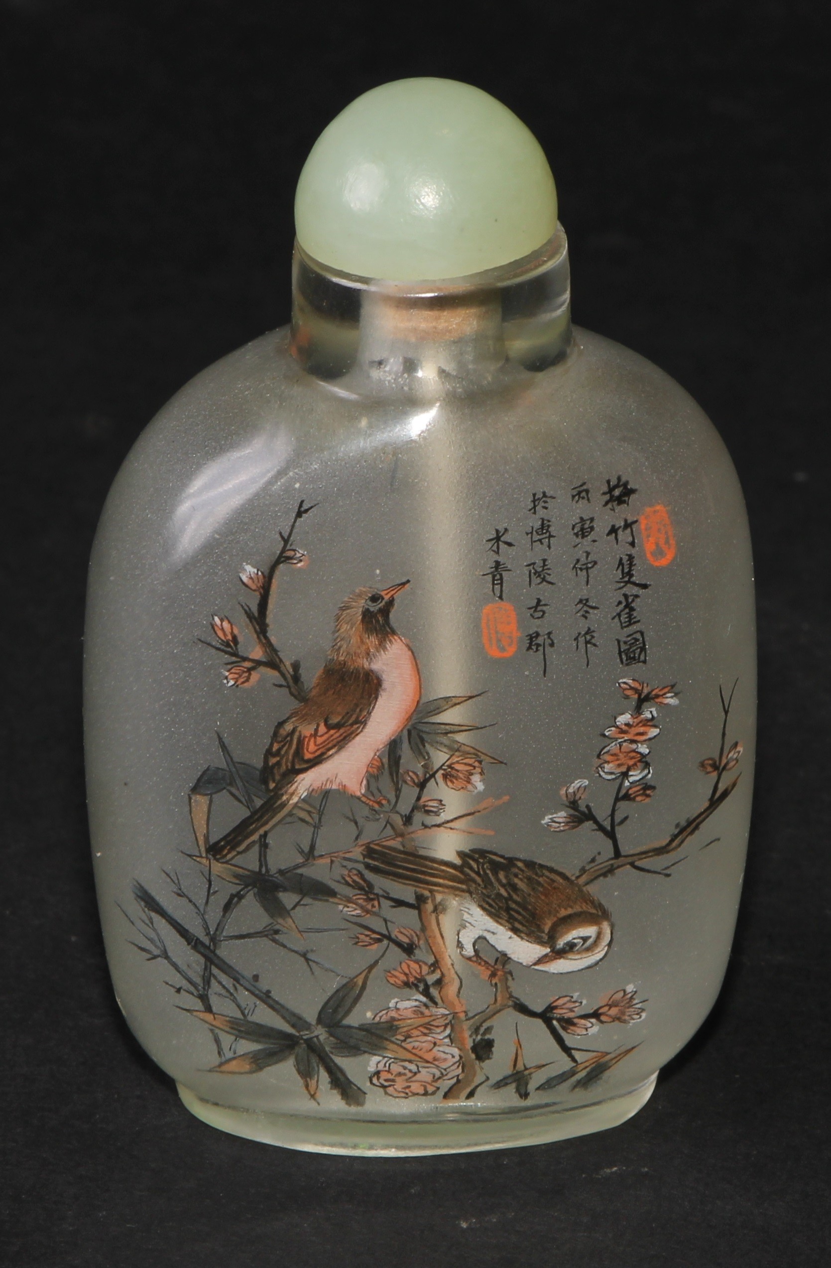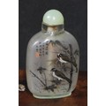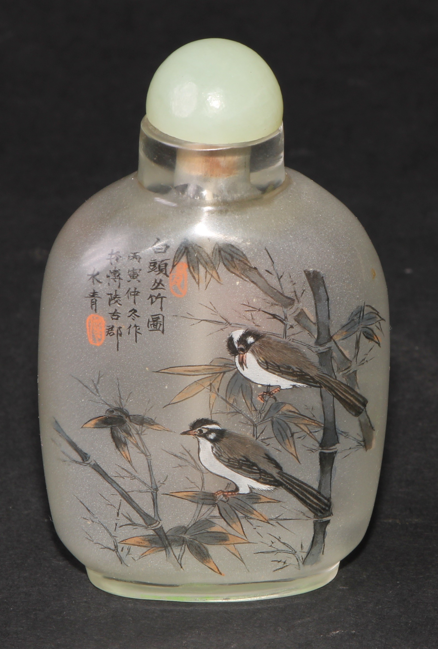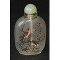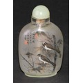 A Chinese inside painted flattened ovoid snuff bottle, decorated with verse, and birds amongst bamboo, 8cm high