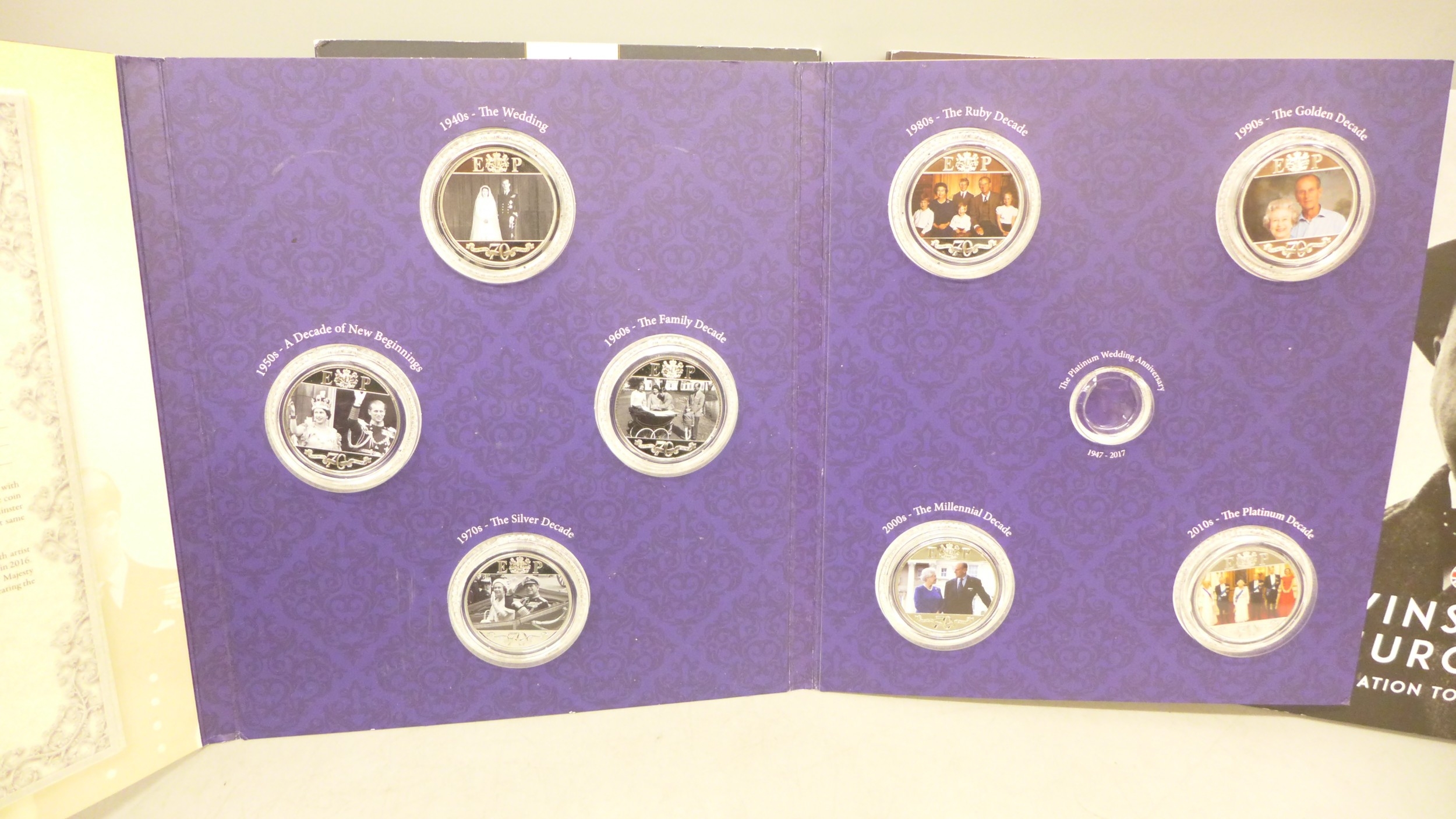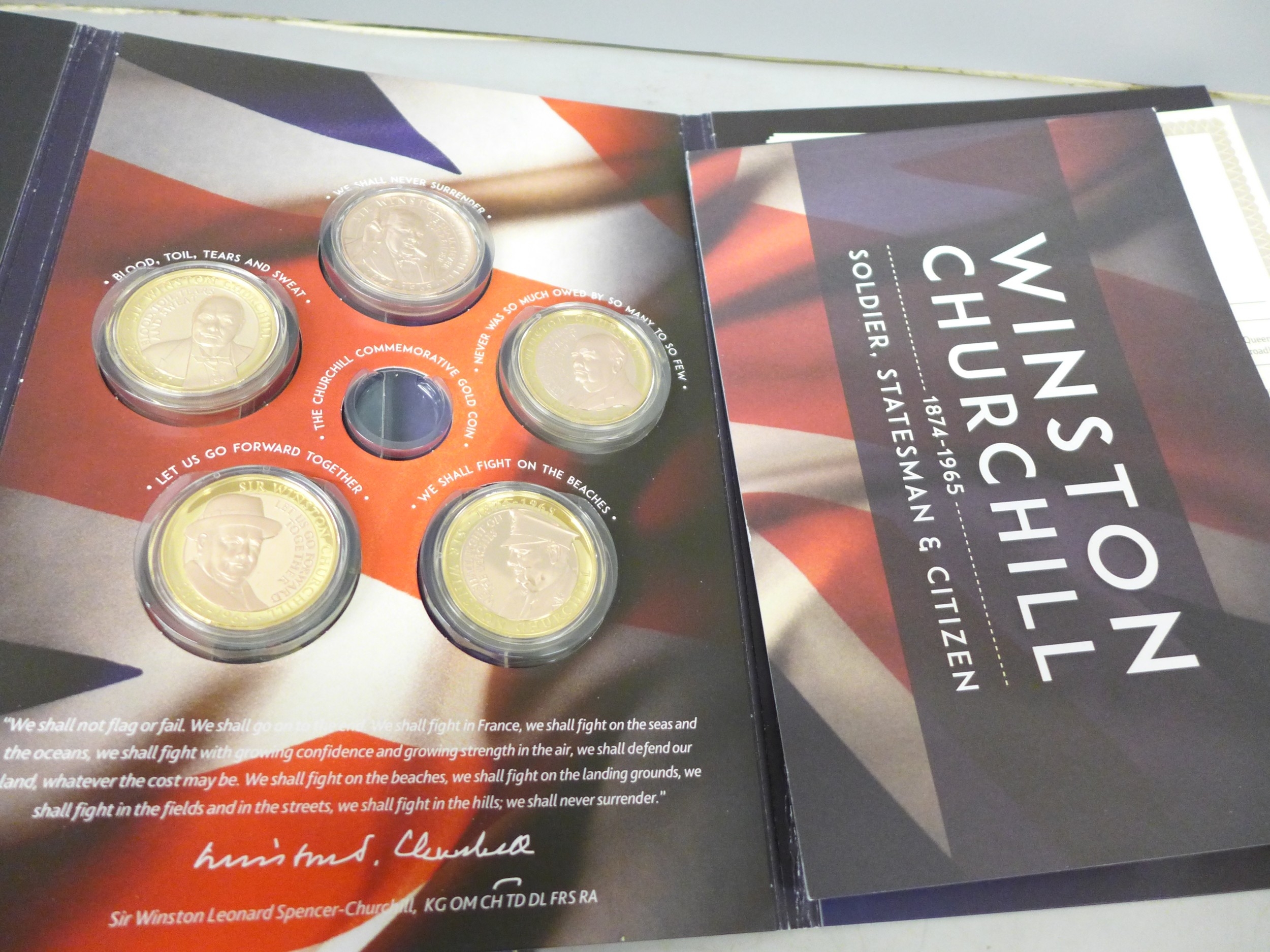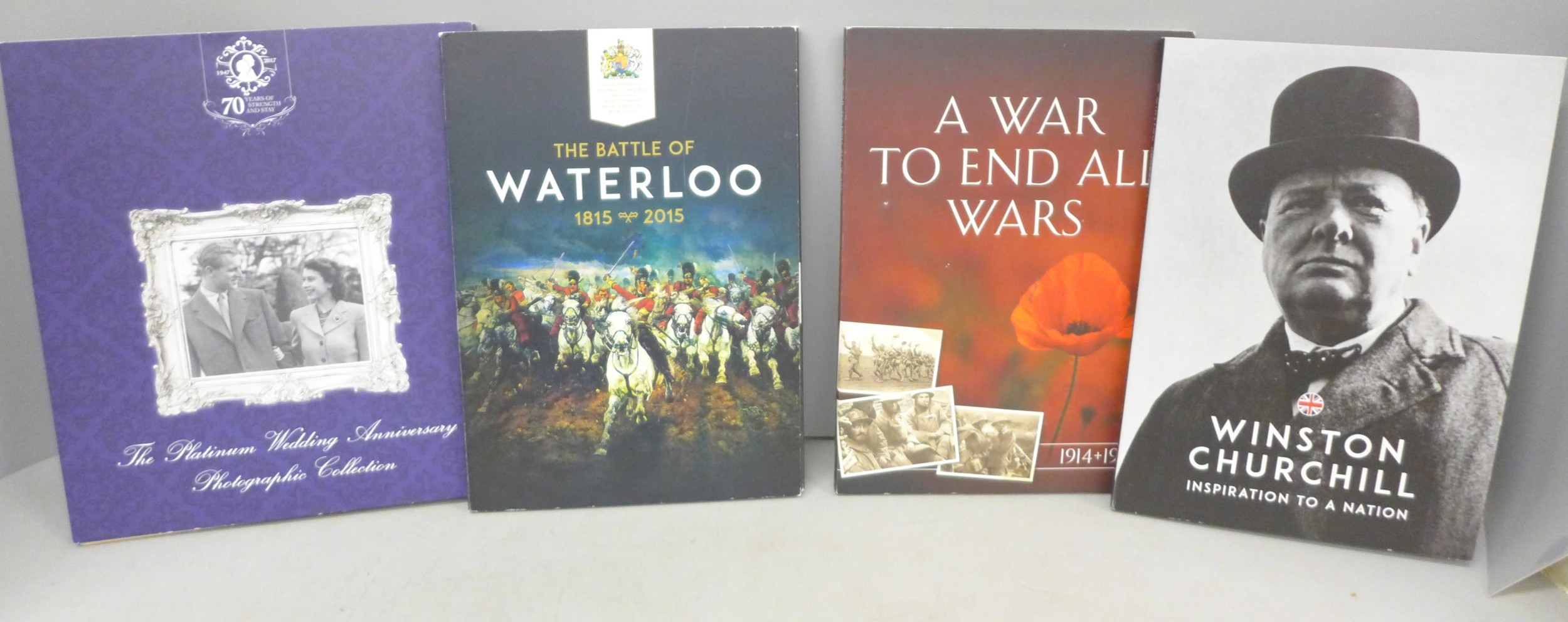 Four coin sets in folders - Winston Churchill, A War To End All Wars, The Battle of Waterloo, and The Platinum Wedding Anniversary Photographic Collection, all lacking the smallest coin