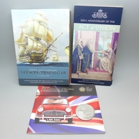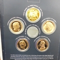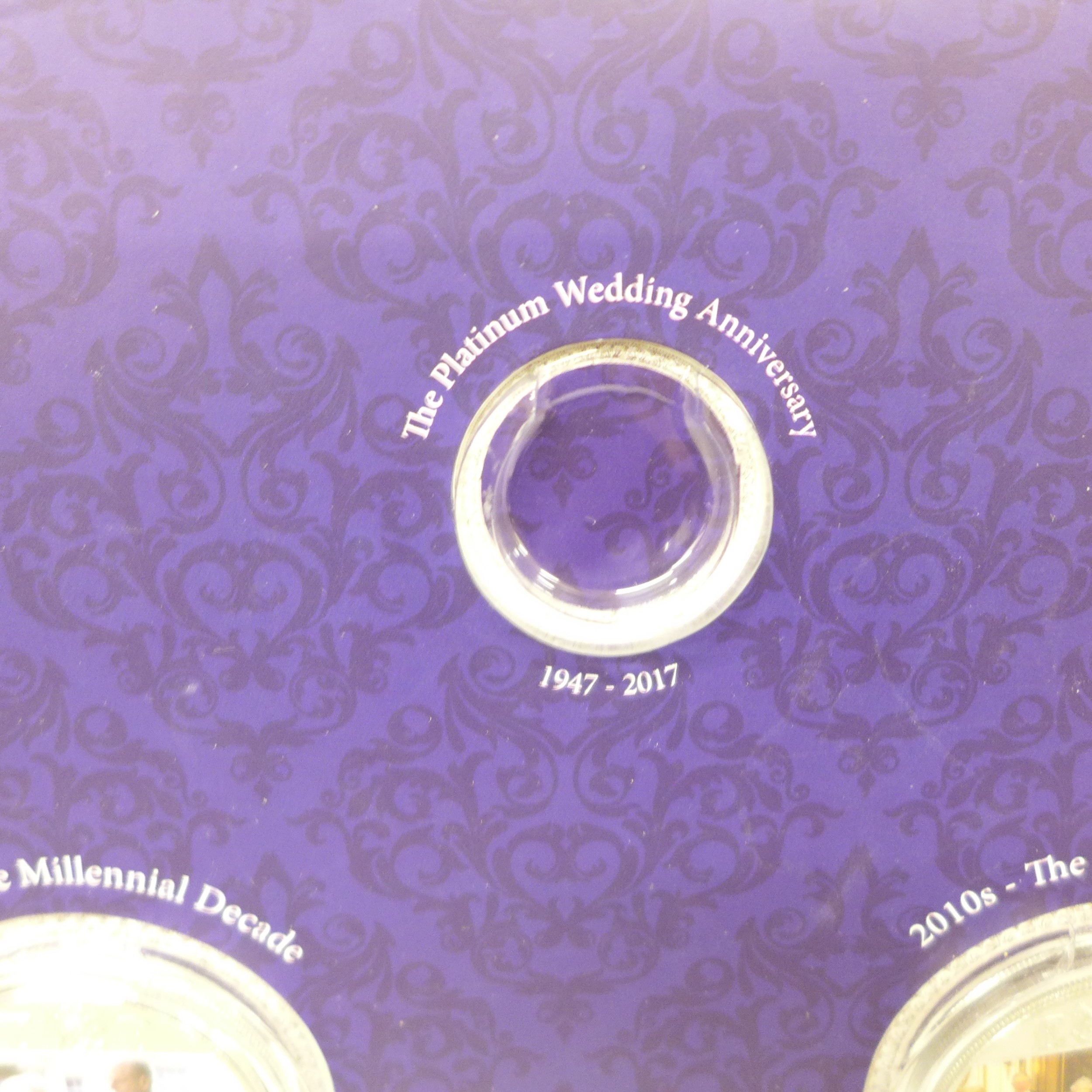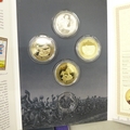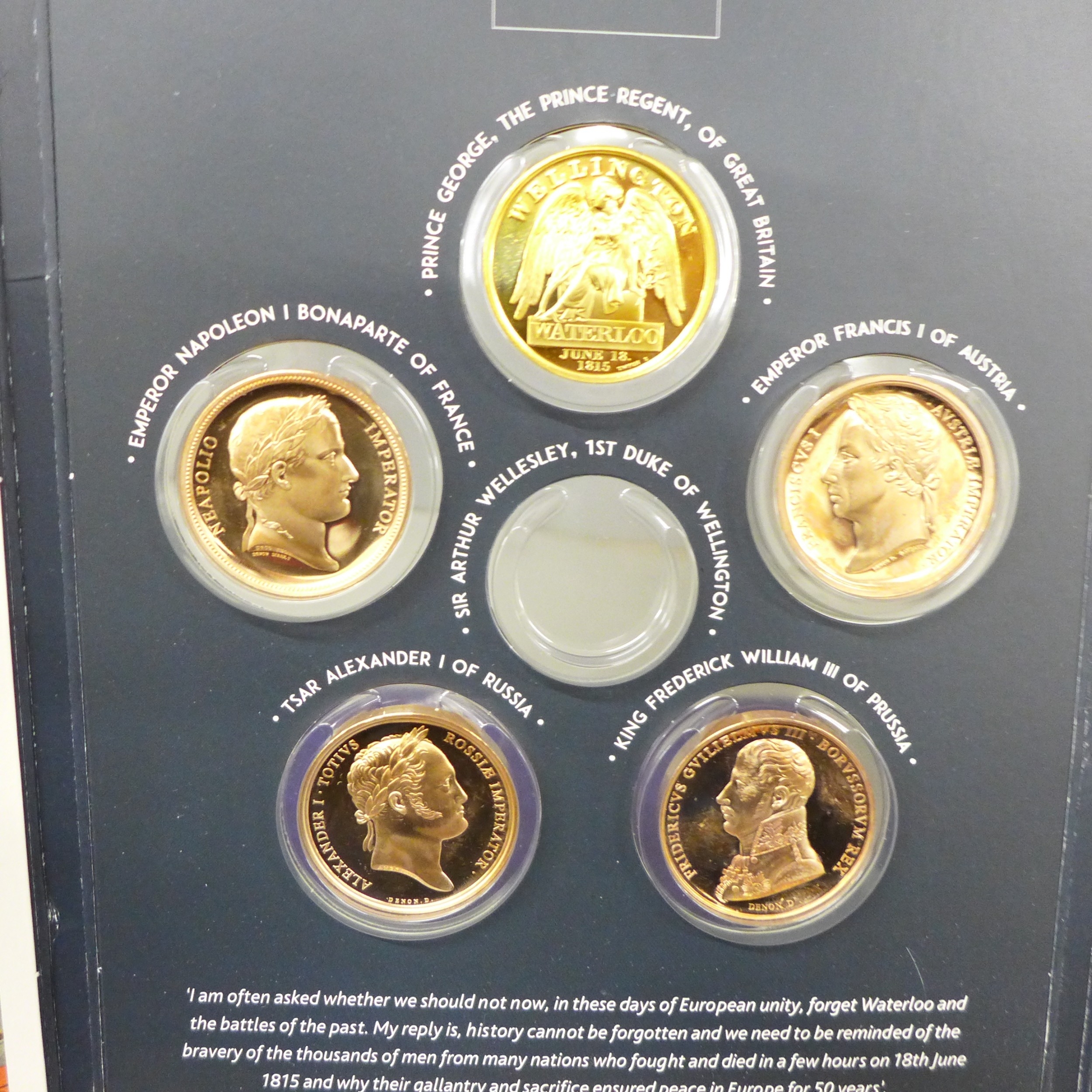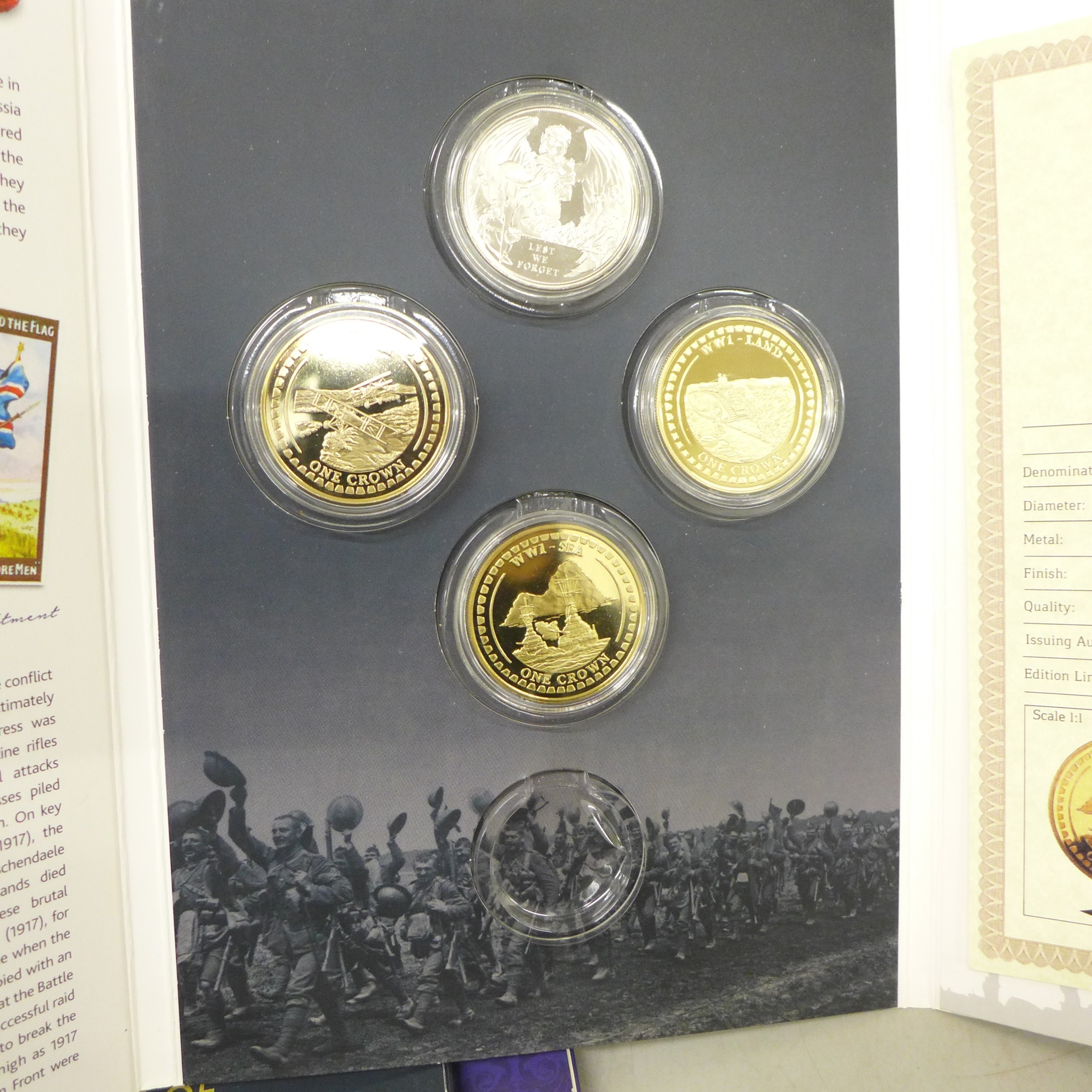 Four coin sets in folders - Winston Churchill, A War To End All Wars, The Battle of Waterloo, and The Platinum Wedding Anniversary Photographic Collection, all lacking the smallest coin