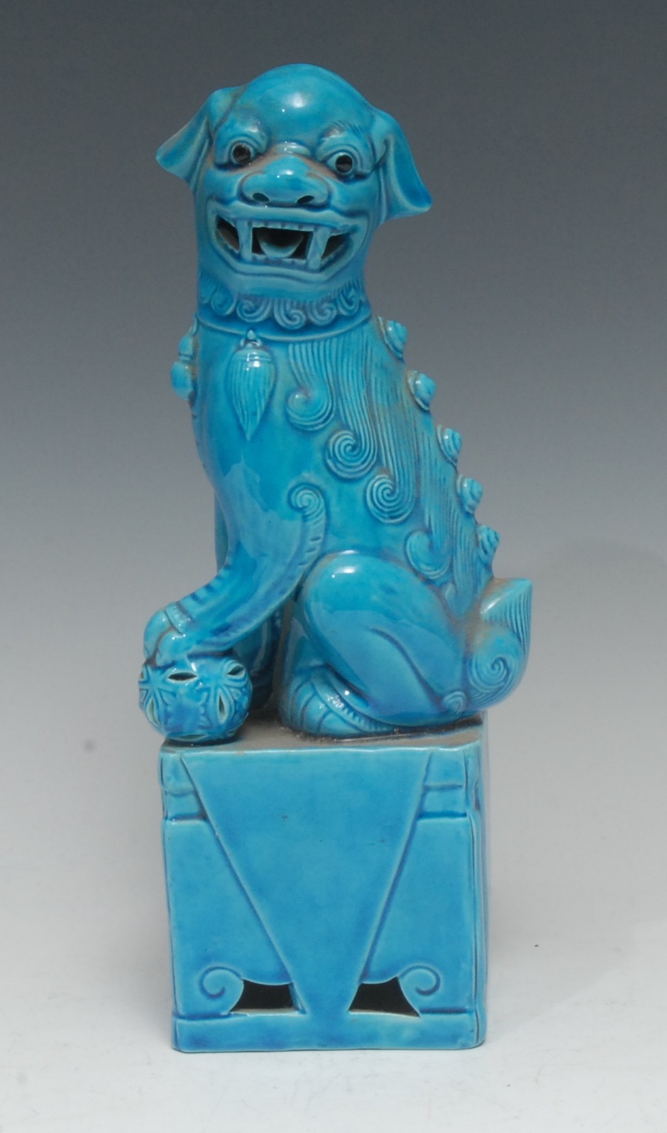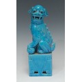 A Chinese turquoise monochrome model, of a temple lion, its paw resting on a ball, square base, 26cm high, impressed marks, 20th century