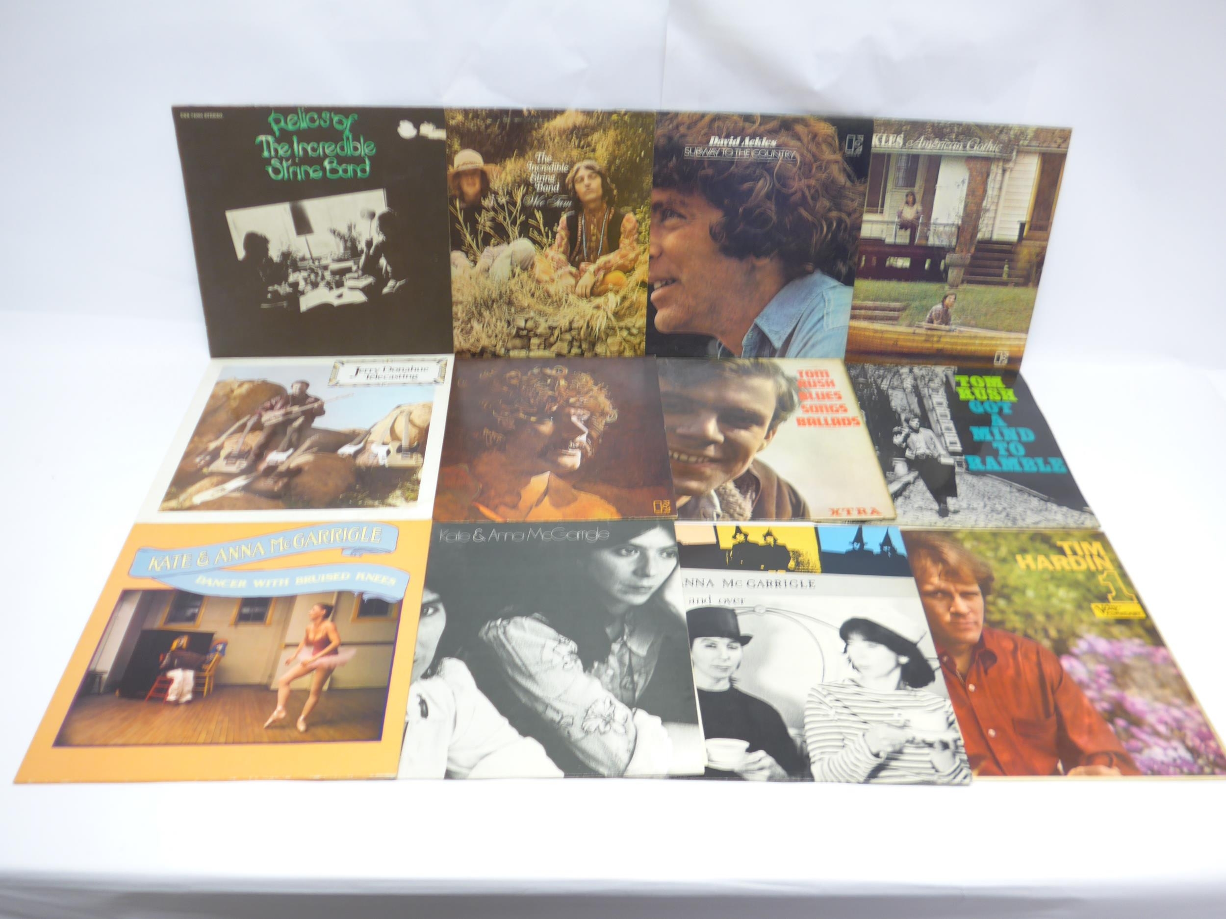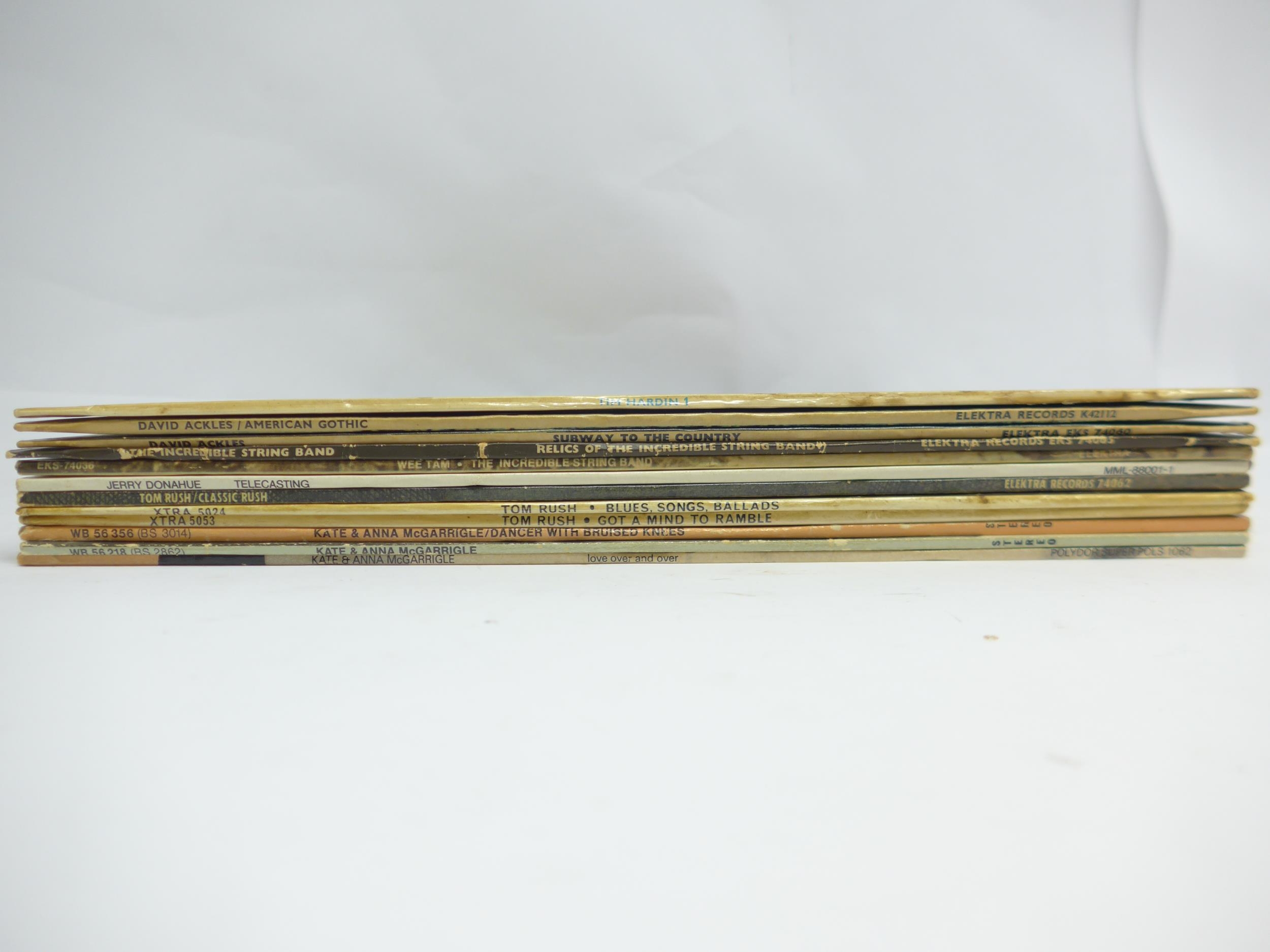 Folk / Folk Rock - A collection of twelve LPs to include TIM HARDIN: 'Tim Hardin 1' (Verve Forecast VLP 5018), THE INCREDIBLE STRING BAND: 'Wee Tam' (Elektra EKS-74036) and 'Relics Of The Incredicble String Band' (Elektra EKS 74065), KATE & ANNA McGARRIGLE: 'Kate & Anna McGarrigle' (WB 56 218), 'Dancer With Bruised Knees' (K 56356) and 'Love Over And Over' (POLS 1062), TOM RUSH: 'Got A Mind To Ramble' (XTRA 5053), 'Classic Rush' (Elektra EKS 74062) and 'Blues, Songs, Ballads' (XTRA 5024), DAVID ACKLES: 'Subway To The Country' (Elektra EKS 74060) and 'American Gothic' (Elektra K 42112), JERRY DONAHUE: 'Telecasting' (MML-88001-1) (12, vinyl and sleeves VG-EX)
