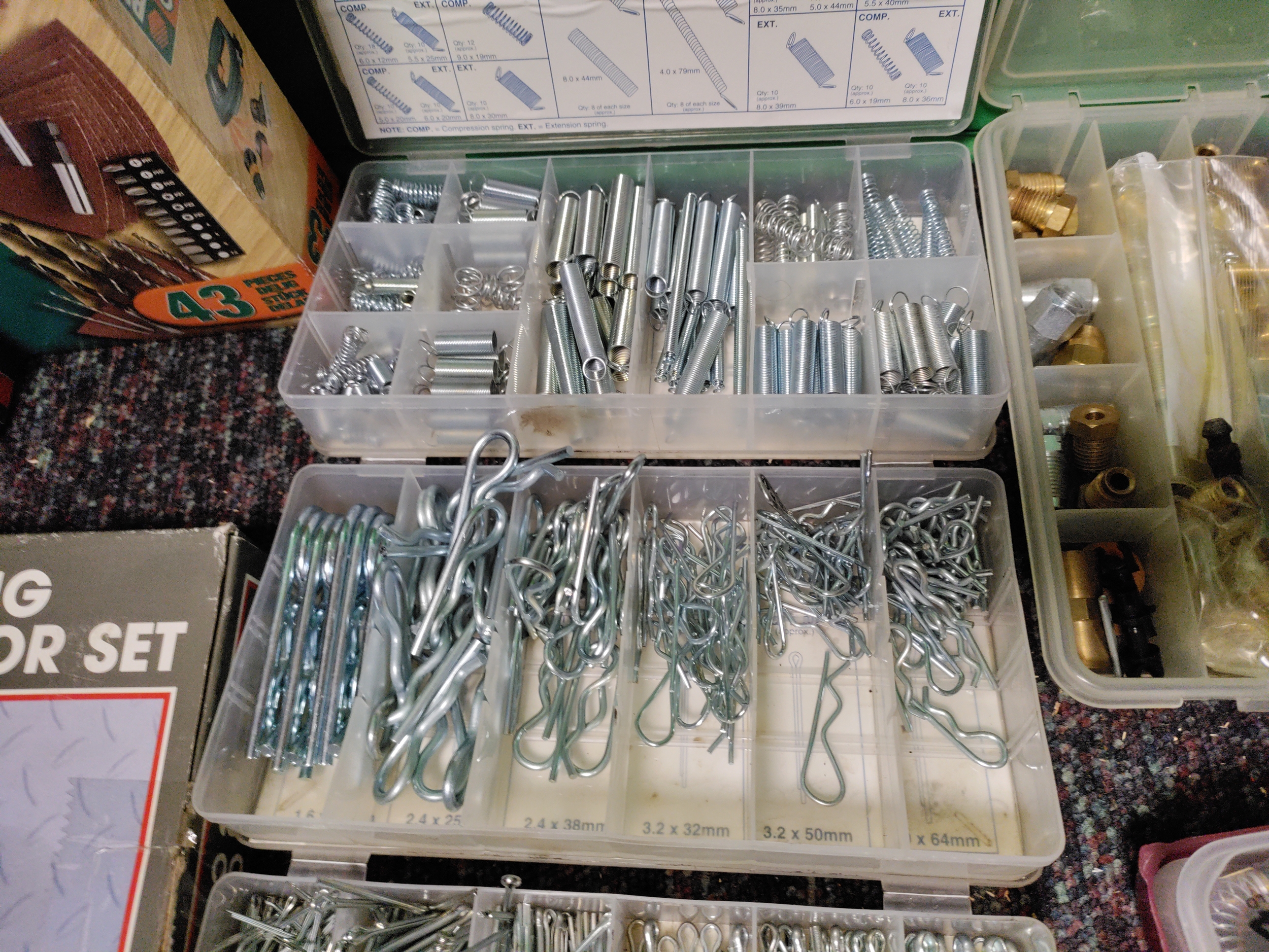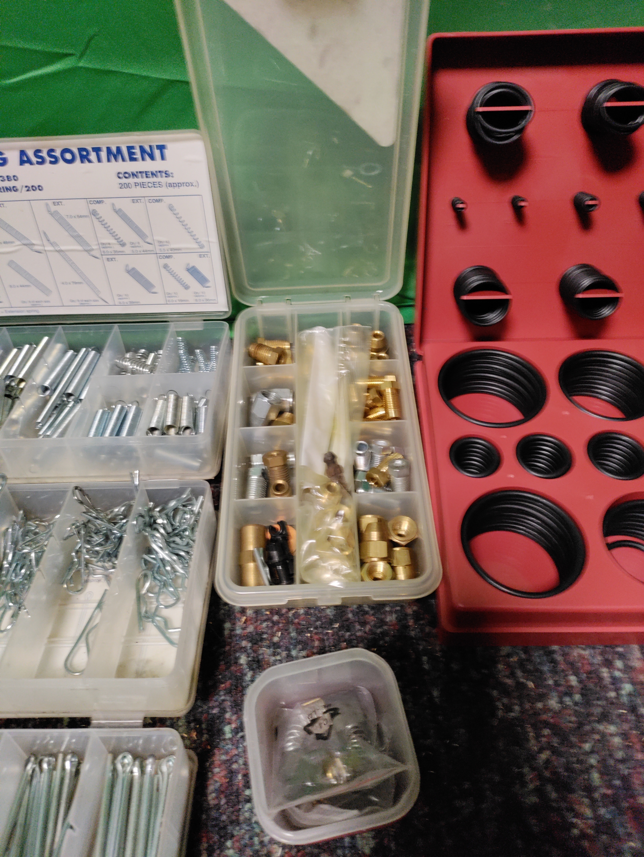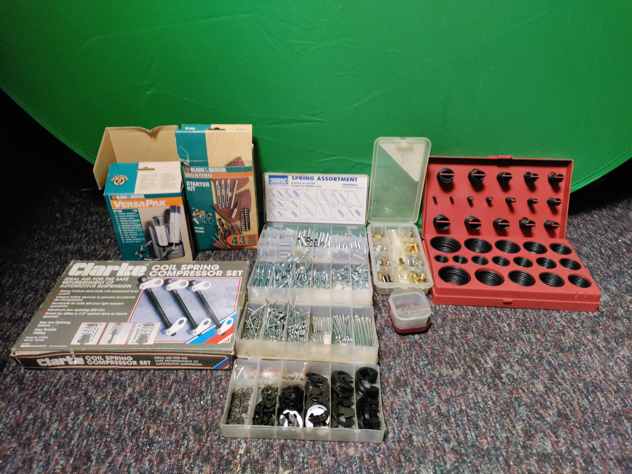A collection of various DIY items. To include assortments of springs, cotter pins , R-clips, & E-clips, coil spring compressors, metric o-ring kit, etc....