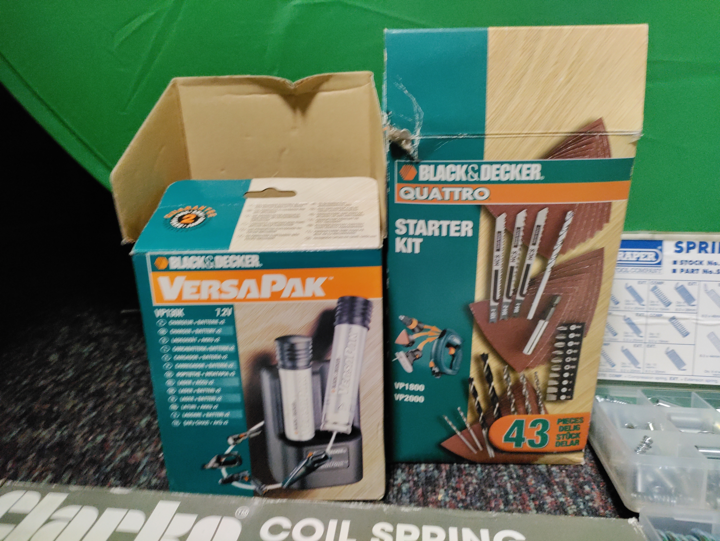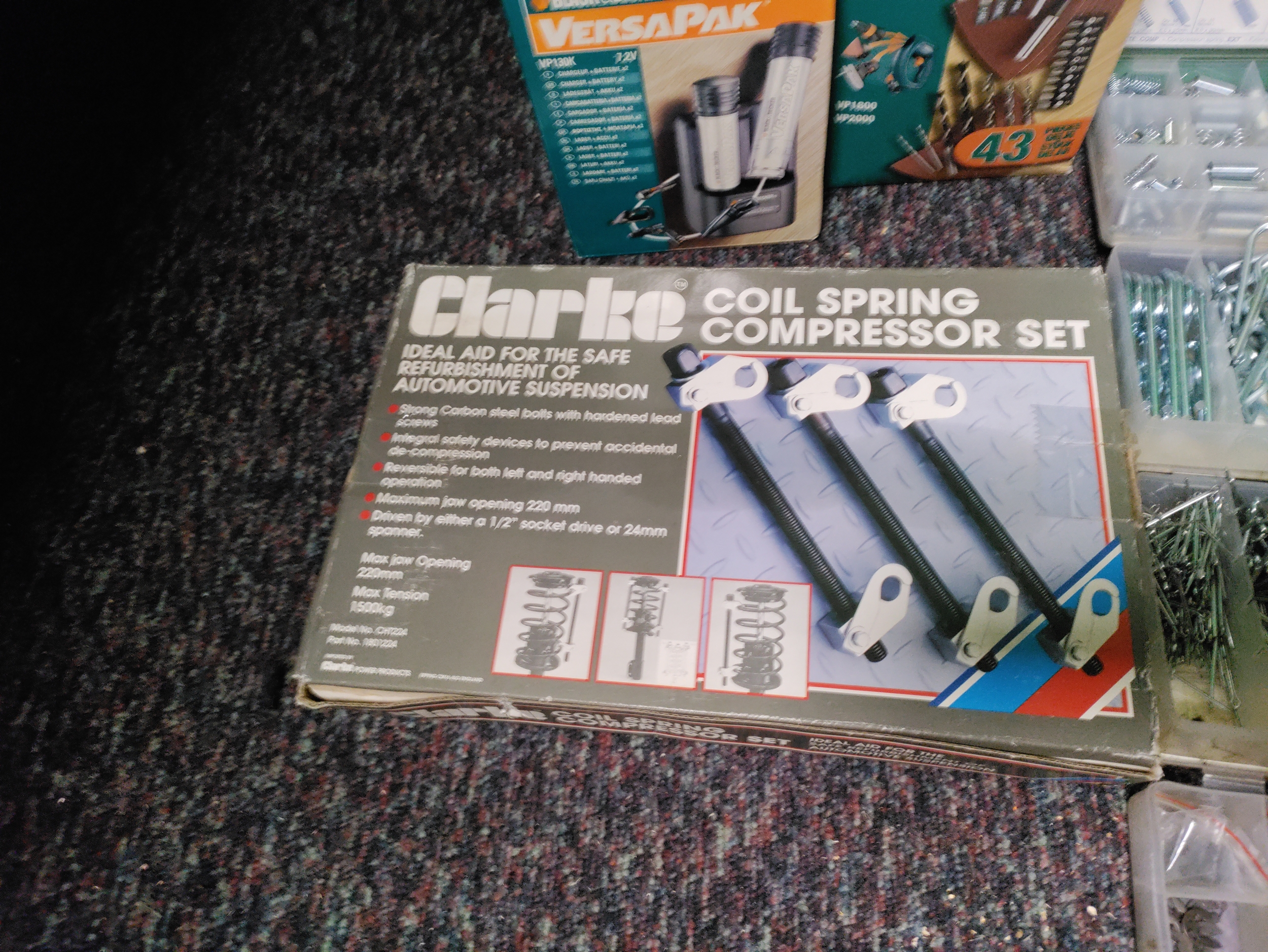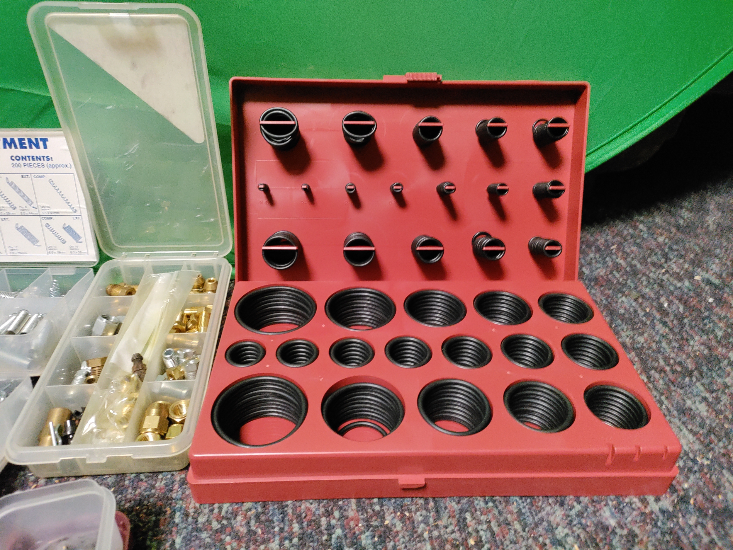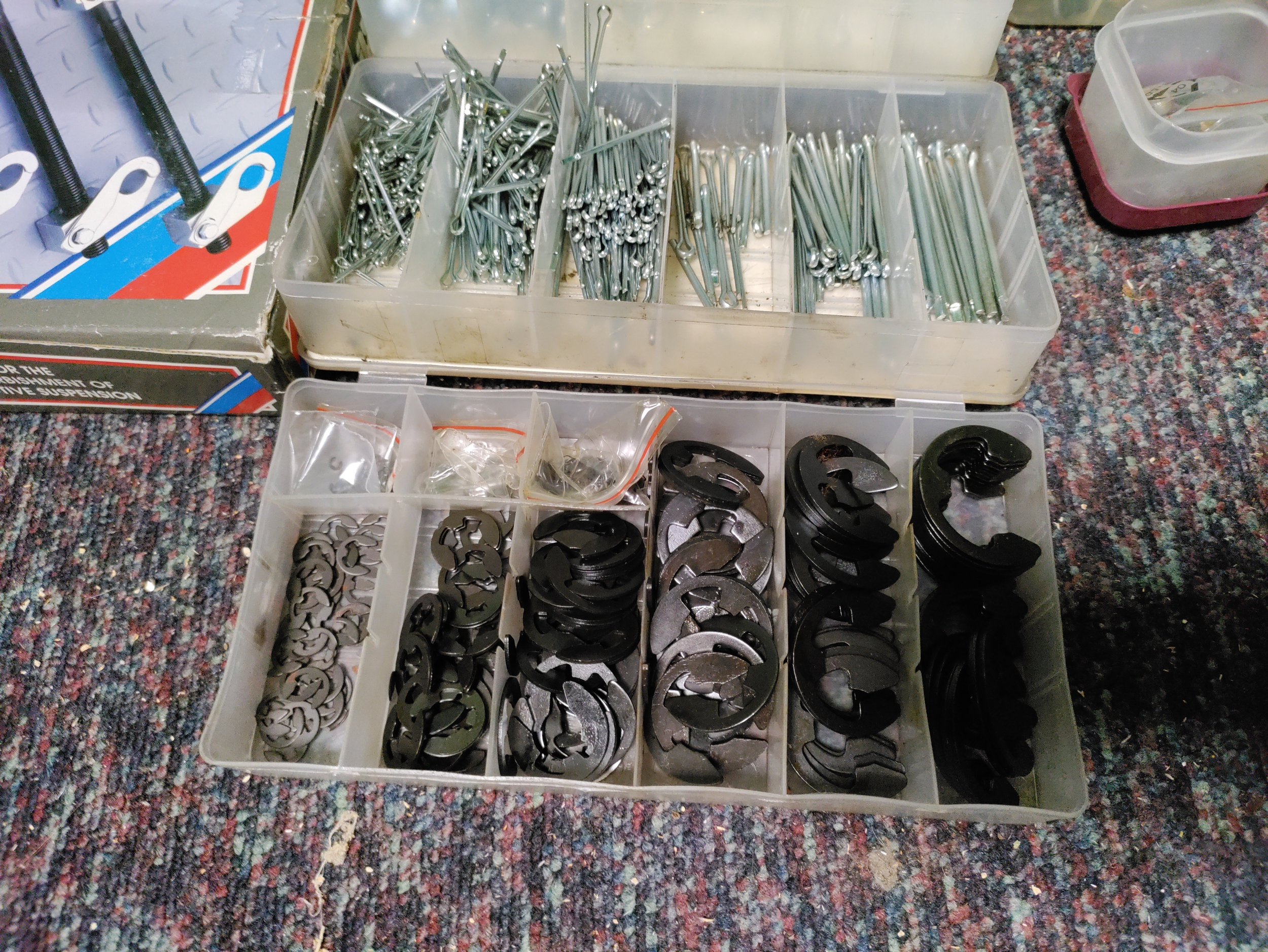 A collection of various DIY items. To include assortments of springs, cotter pins , R-clips, & E-clips, coil spring compressors, metric o-ring kit, etc....