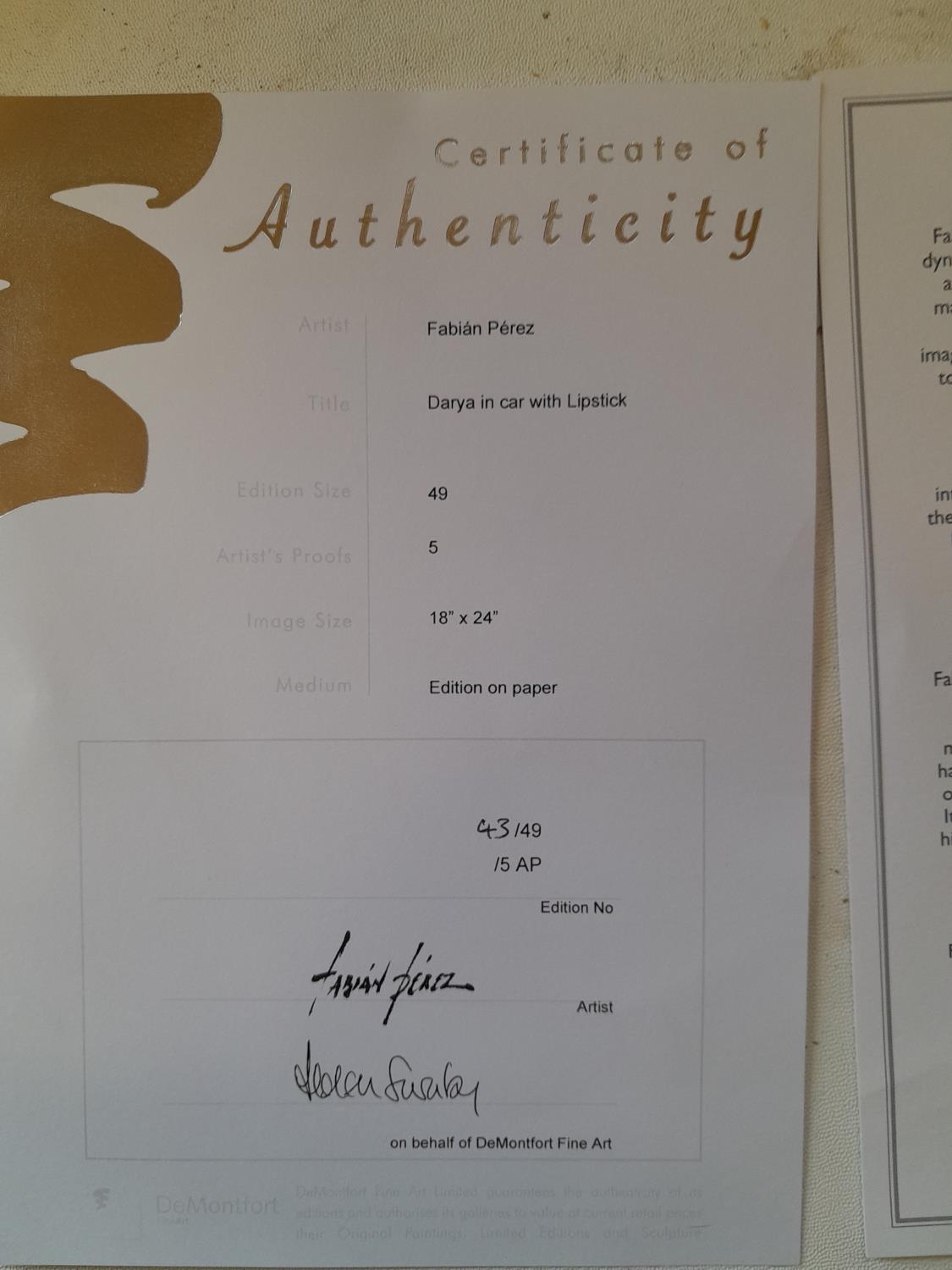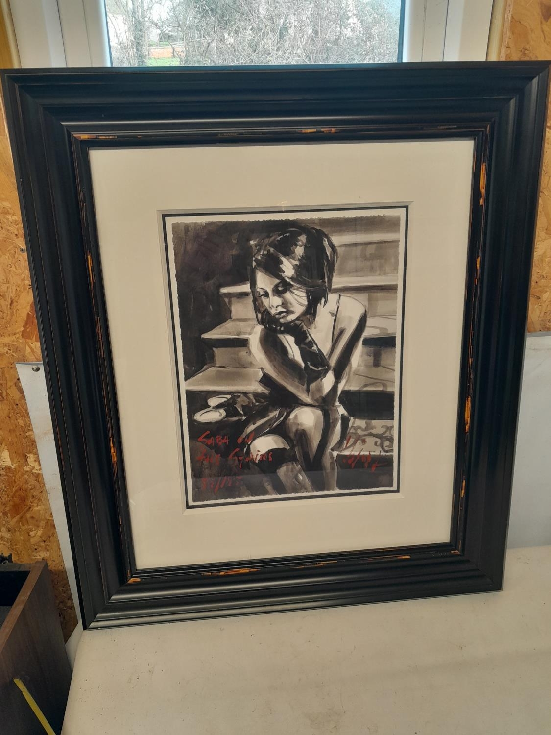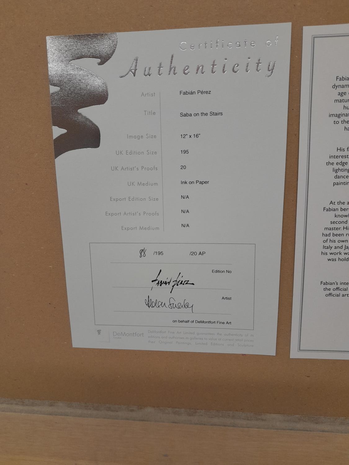 Fabian Perez, Saba on the Stairs, limited edition giclée black and white print 88/195, signed and COA verso, distributed by DeMontfort Fine Art, framed and glazed overall measurements including frame 78 cms x 67 cms, print measures 41 cms x 31 cms