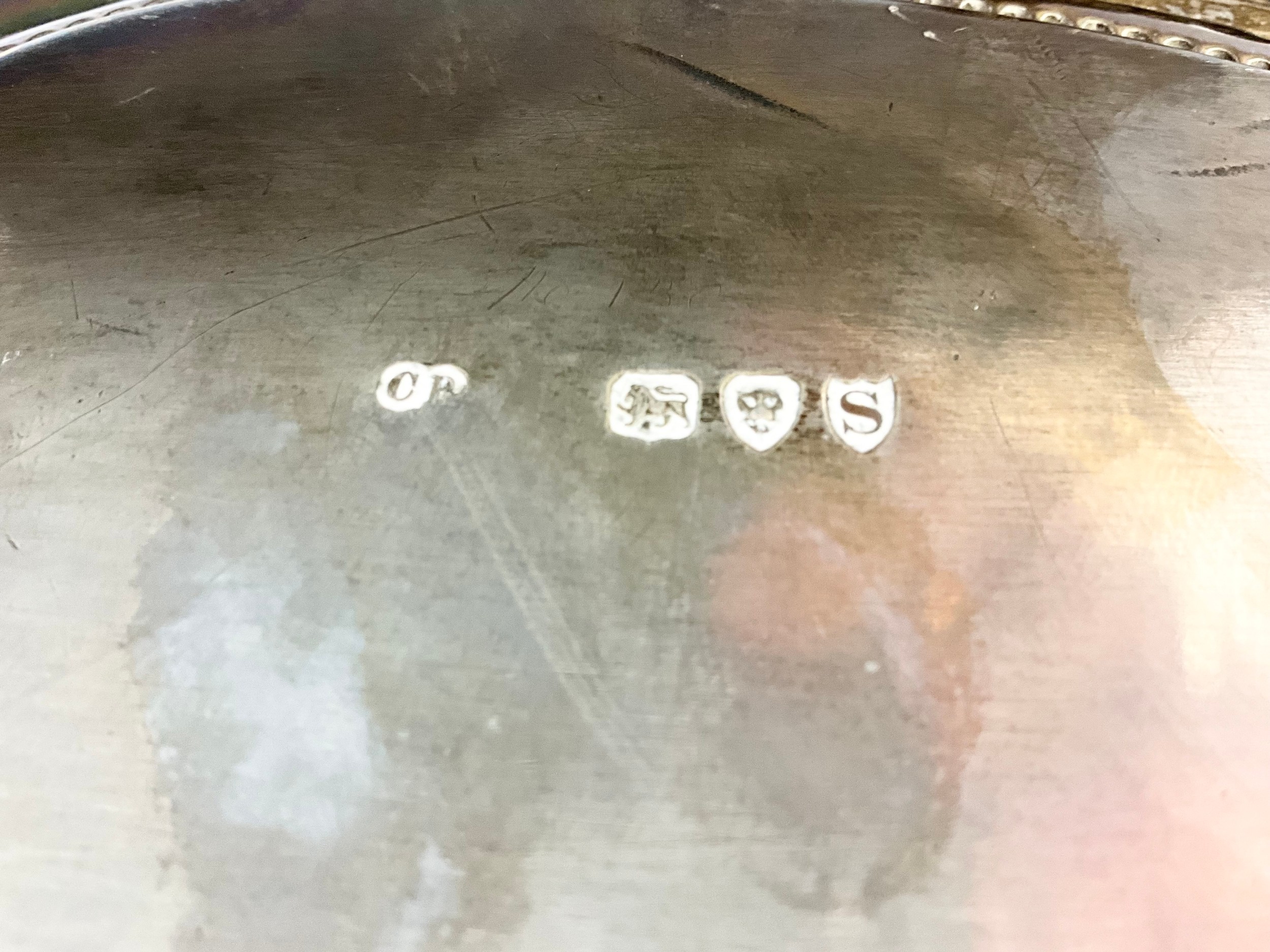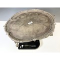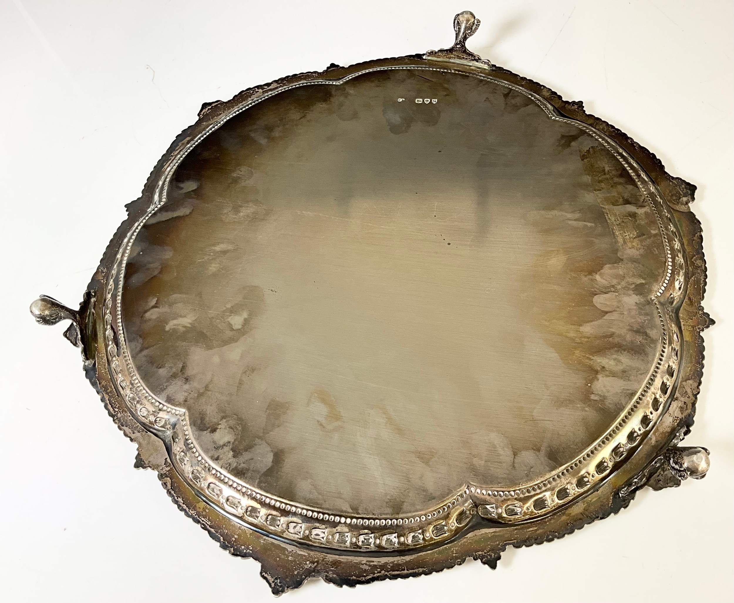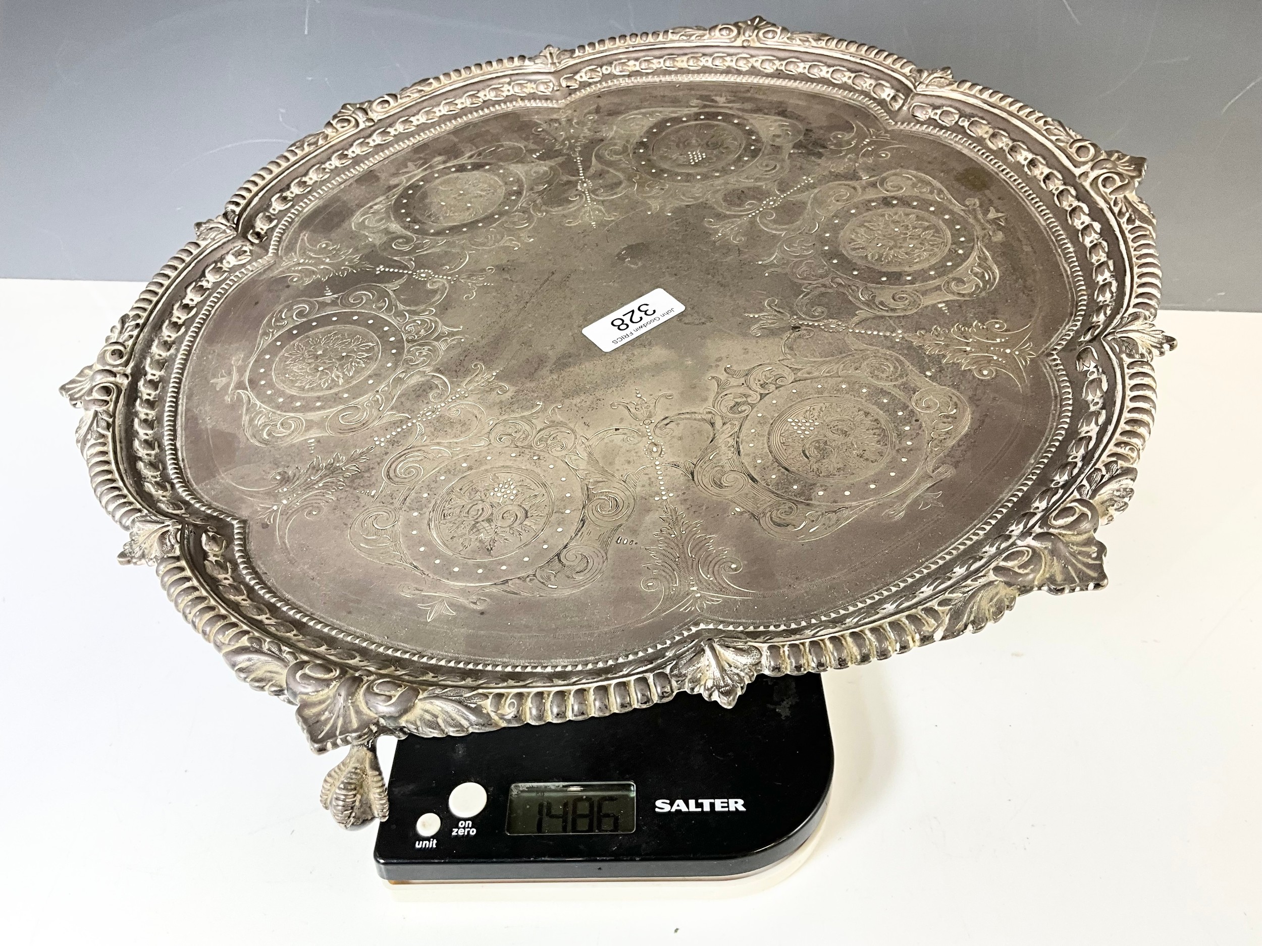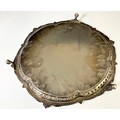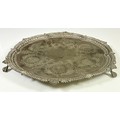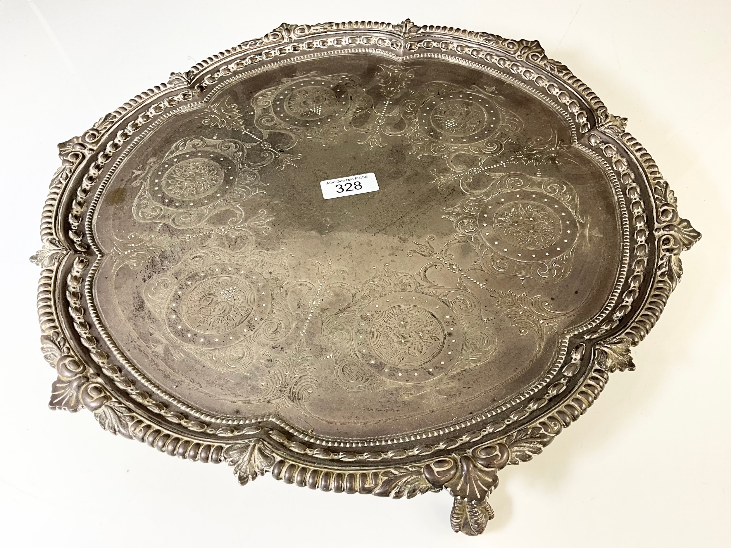 VICTORIAN SILVER TRAY, CHARLES BOYTON, LONDON 1893 OF SHAPED CIRCULAR FORM, ENGRAVED WITH CIRCULAR FLORAL CARTOUCHES, WITHIN BORDERS OF SCROLLS, EMBOSSED AND CAST RIM ON THREE CLAW AND BALL FEET, APPROX. 1490g