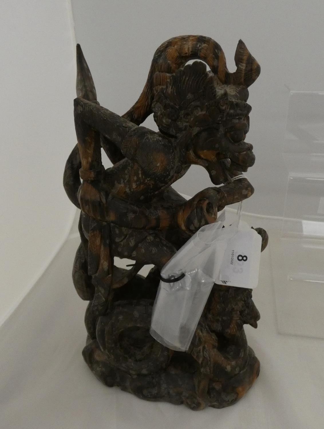 Eastern carved hardwood figure of the Hindu monkey god Hanuman slaying a serpent, 28cm high.