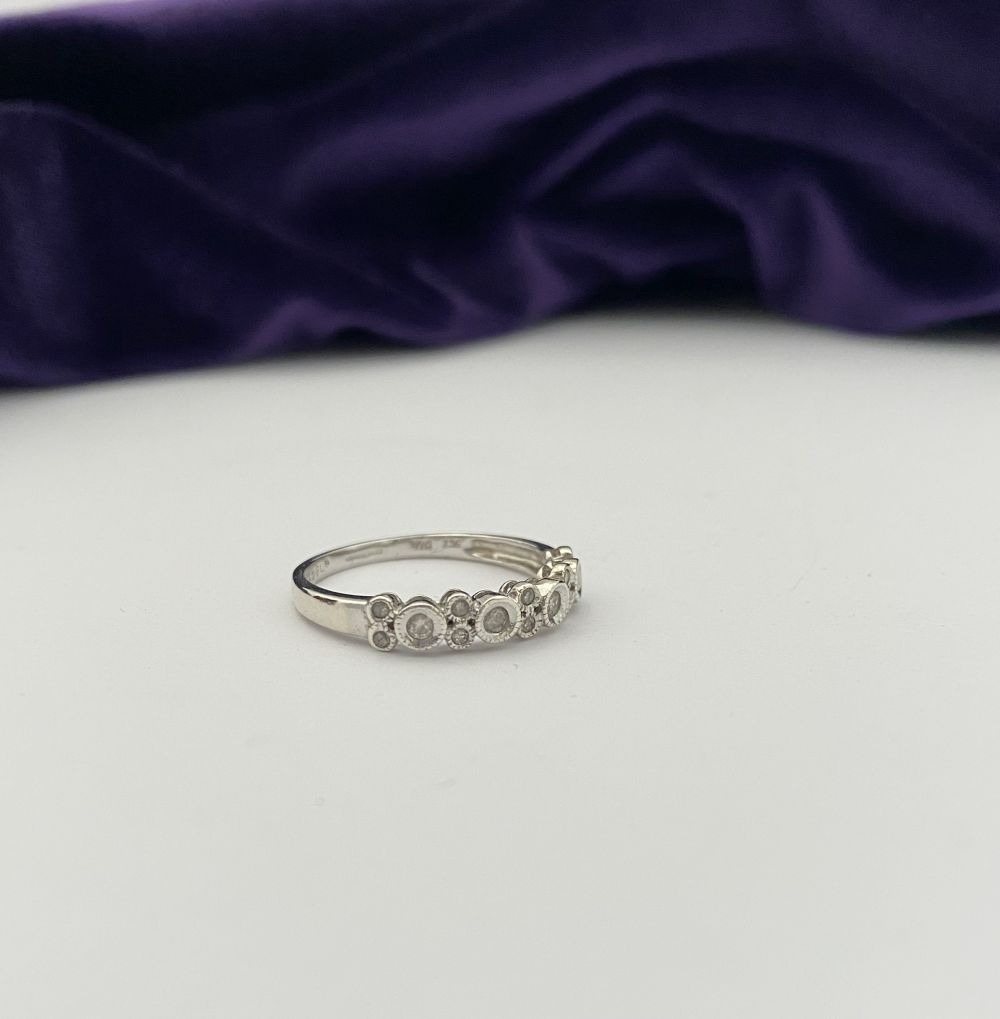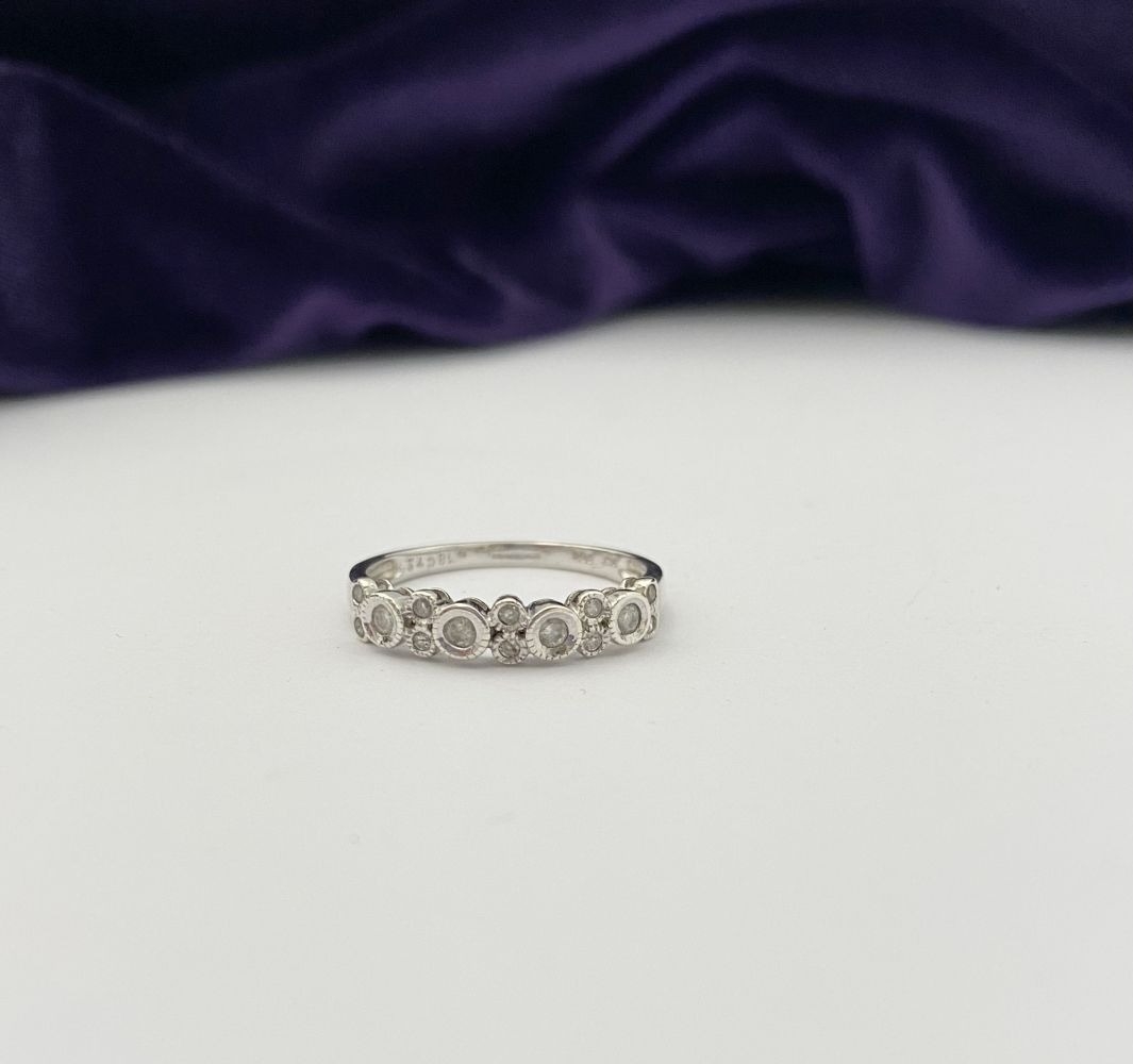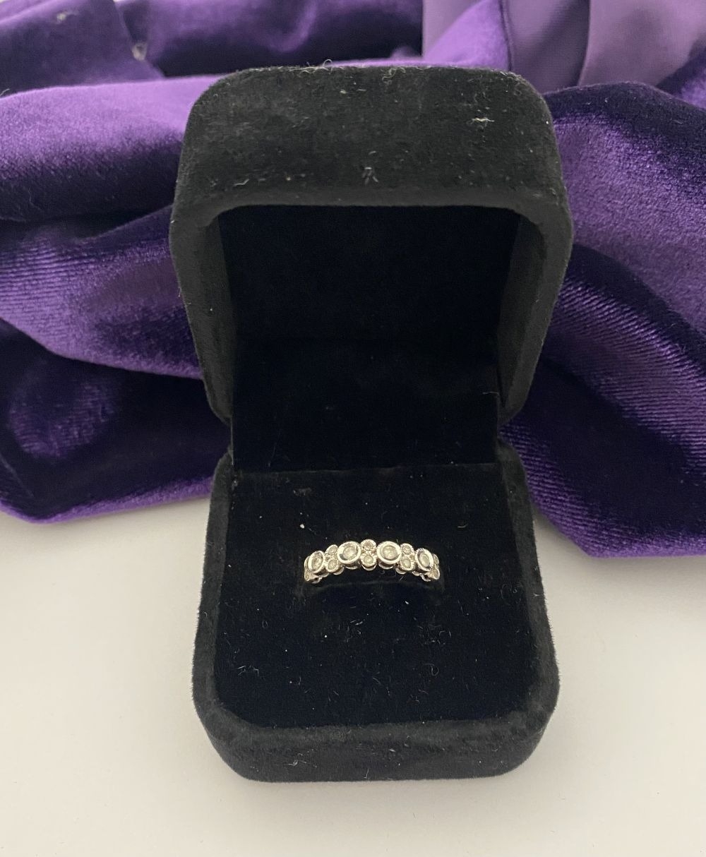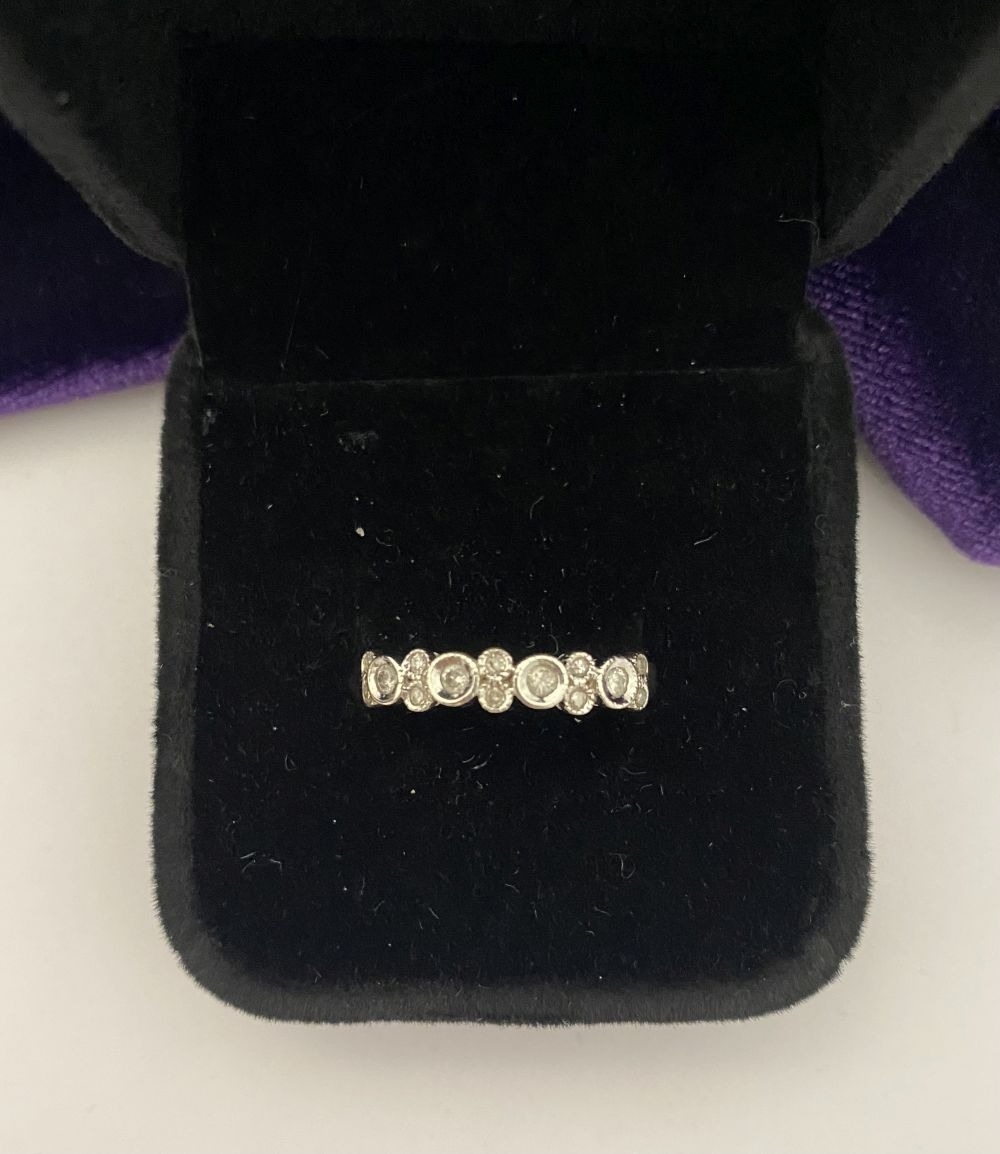A 9CT WHITE GOLD DIAMOND BAND RING, set with fourteen round cut diamonds in millegrain raised bezel setting. Hallmarked 9ct DIA with Makers marks to interior band. Ring size: P/Q