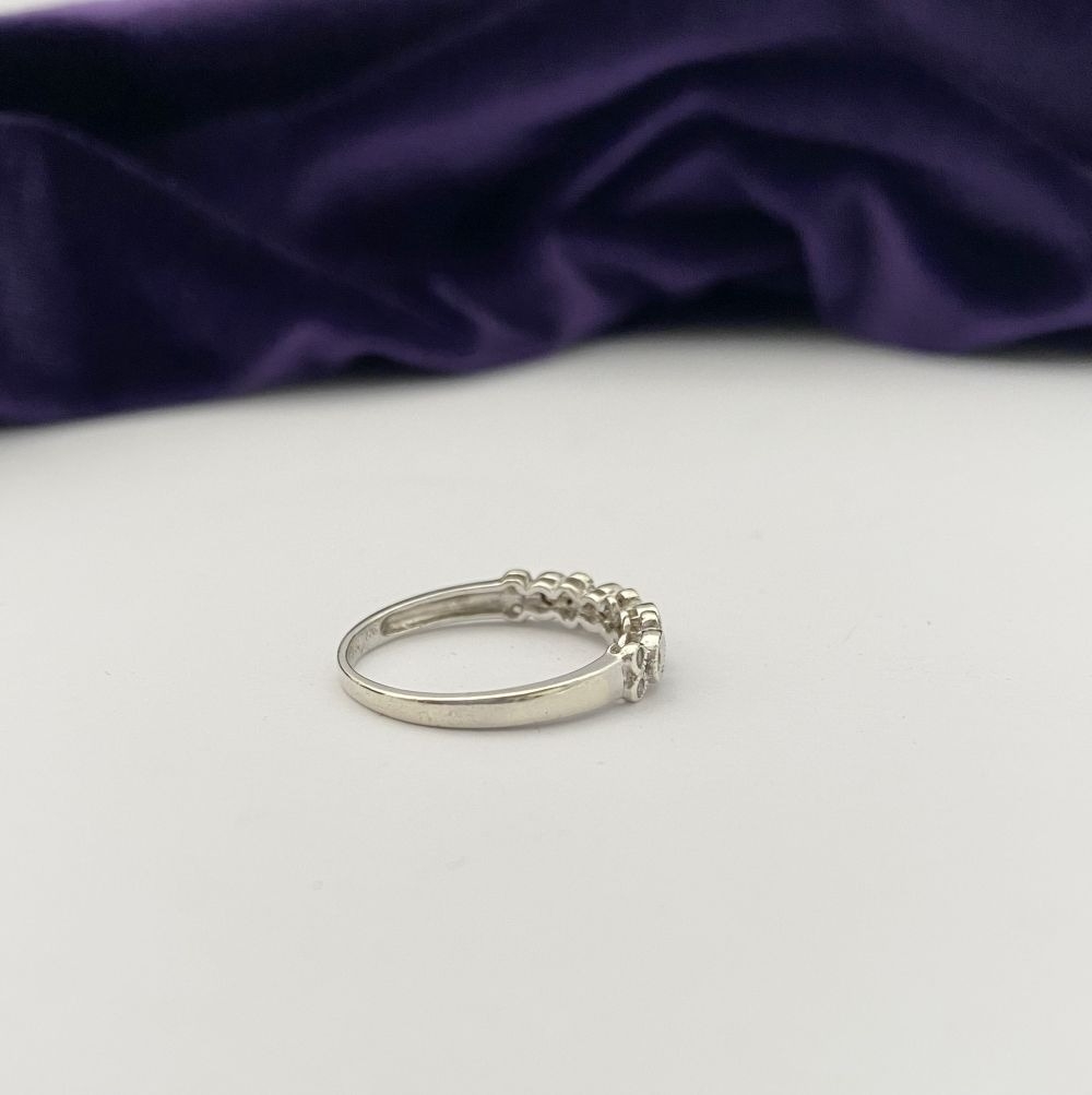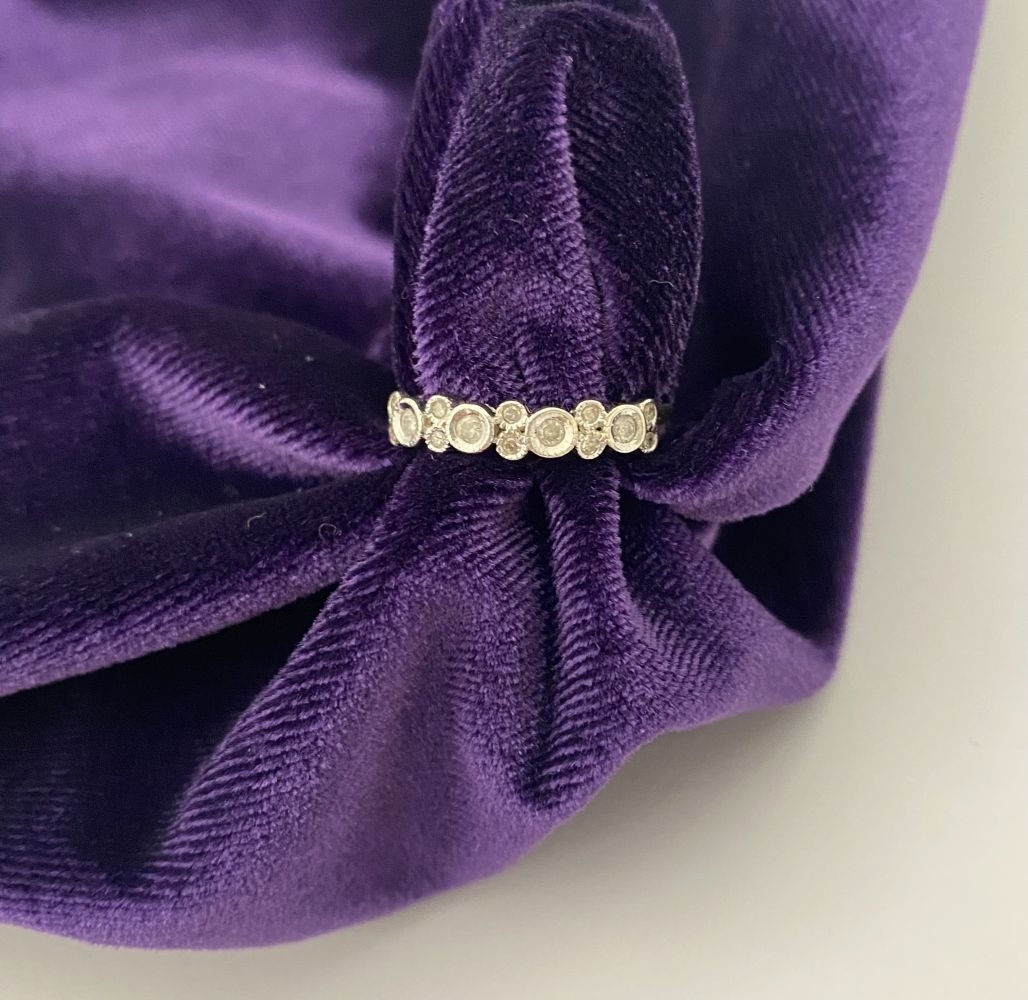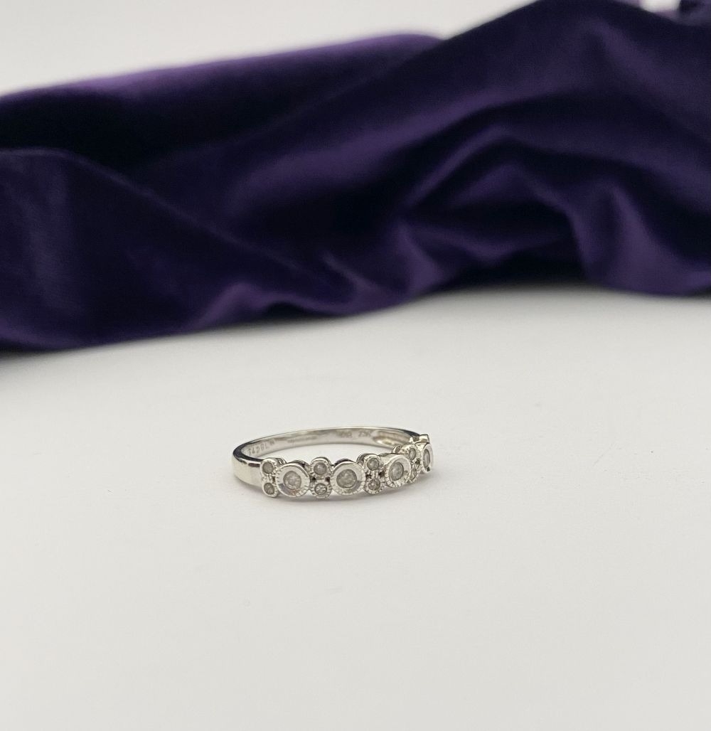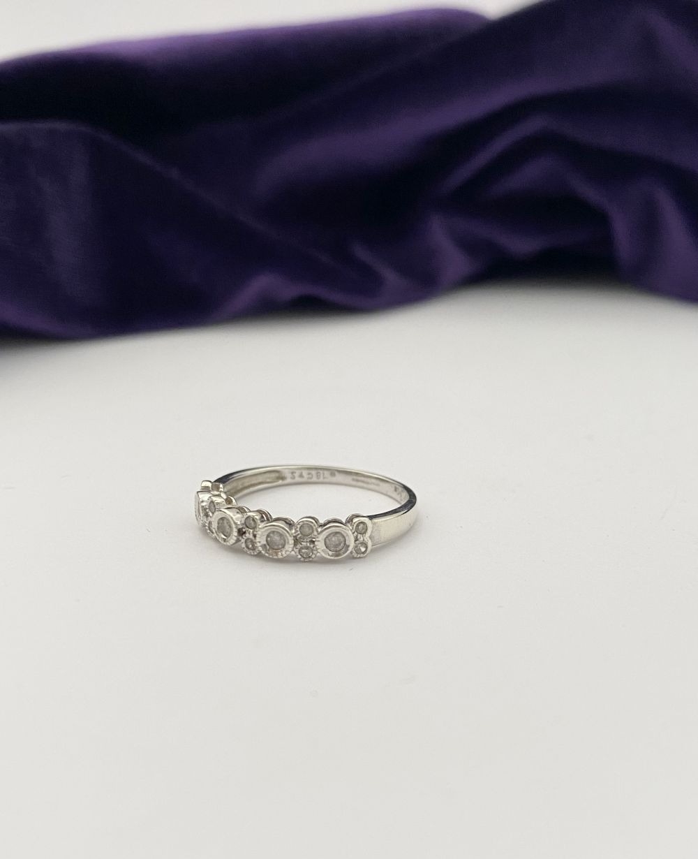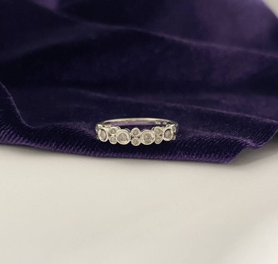 A 9CT WHITE GOLD DIAMOND BAND RING, set with fourteen round cut diamonds in millegrain raised bezel setting. Hallmarked 9ct DIA with Makers marks to interior band. Ring size: P/Q