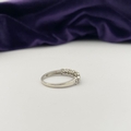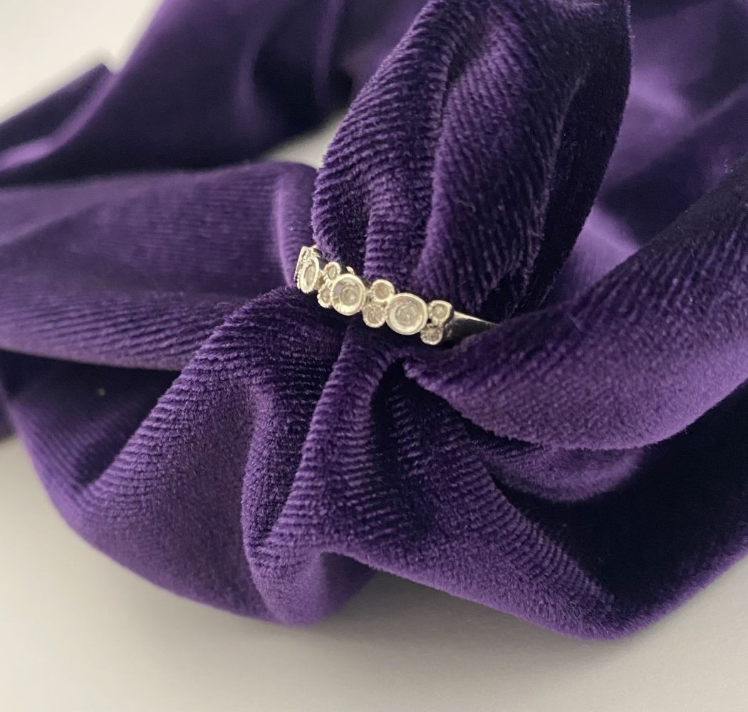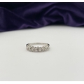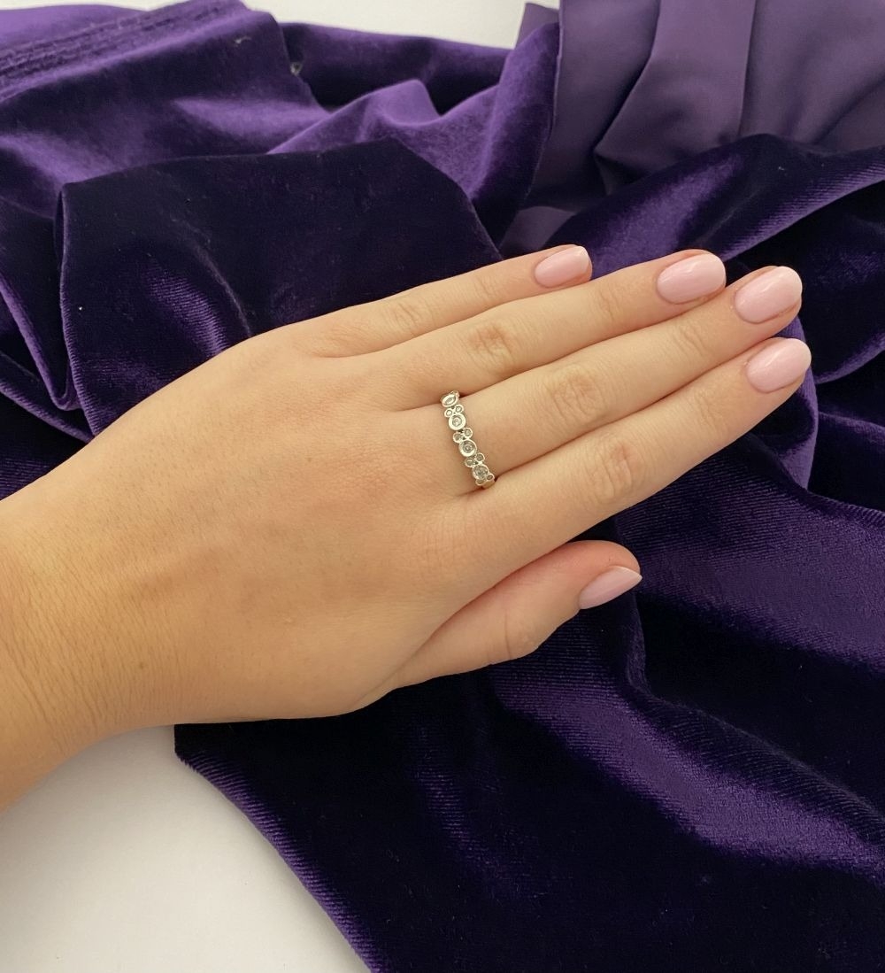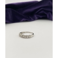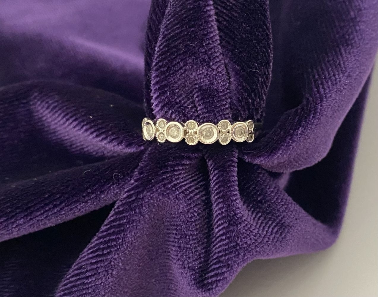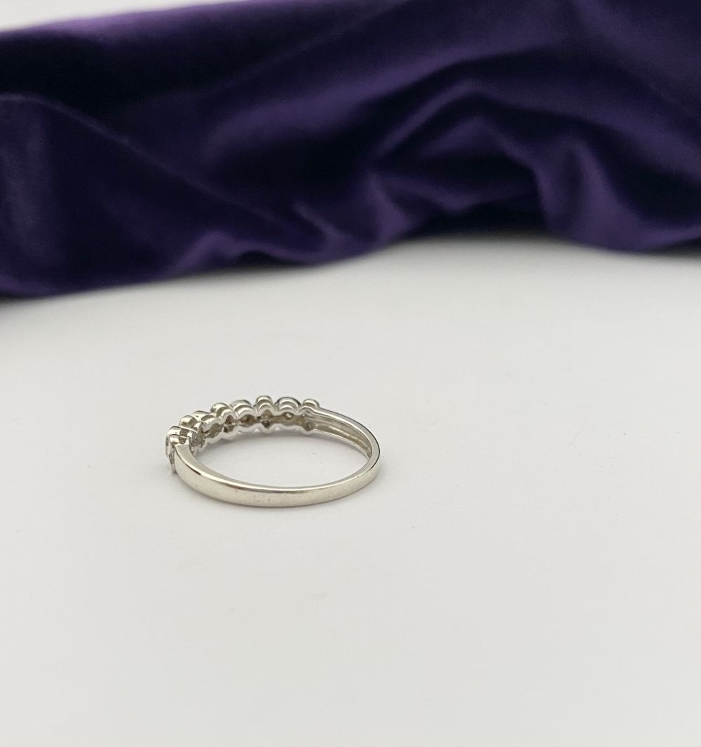 A 9CT WHITE GOLD DIAMOND BAND RING, set with fourteen round cut diamonds in millegrain raised bezel setting. Hallmarked 9ct DIA with Makers marks to interior band. Ring size: P/Q