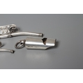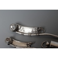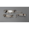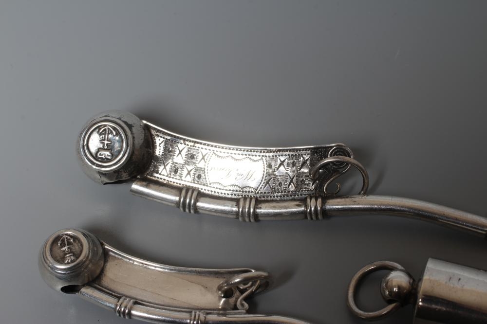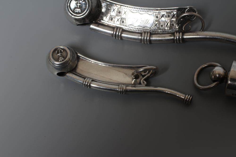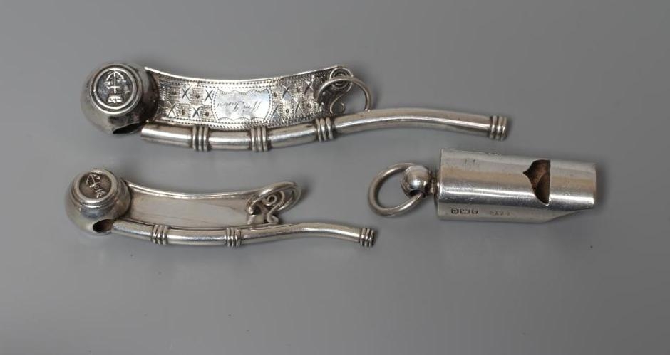 TWO SILVER BO'SUNS WHISTLES comprising one by Hilliard & Thomason, Birmingham 1866, with chequered engraved handle named Wm. Jones, 4" long, and a smaller plain example by George Unite, Birmingham 1911, 2 3/4" long, together with an Edwardian whistle by Britton, Gould & Co., Birmingham 1904, all with hanging loops (3)