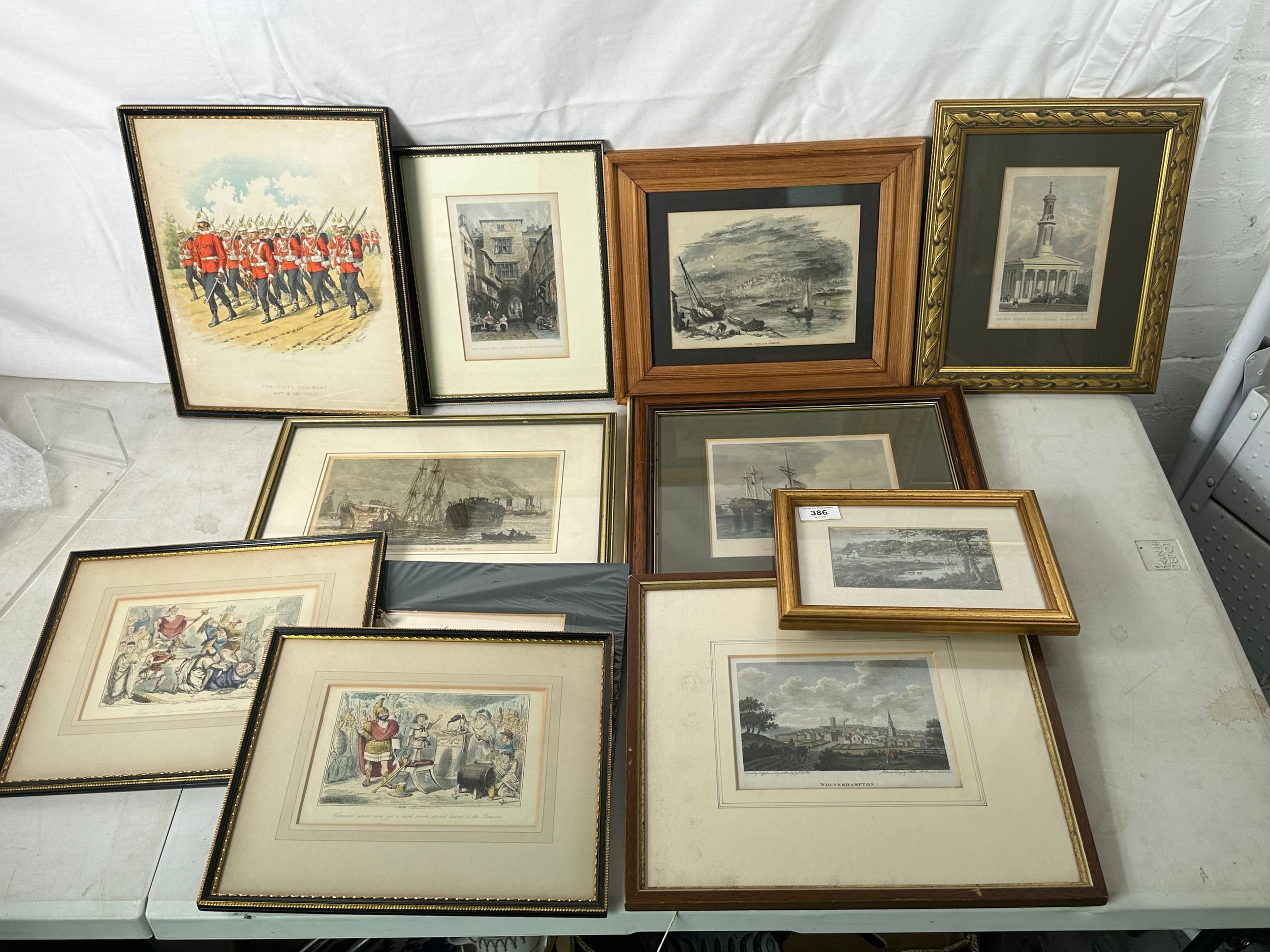 Quantity of antique etchings to include the New Church 1827, Black Gate Newcastle on Tyne, Rye from the harbour, raising a sunken Indian man in the Thames, and several others