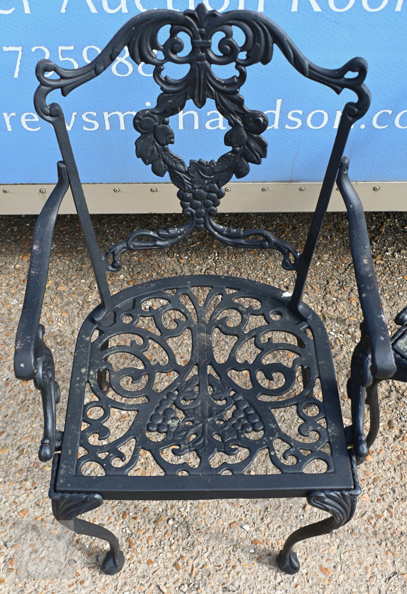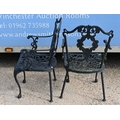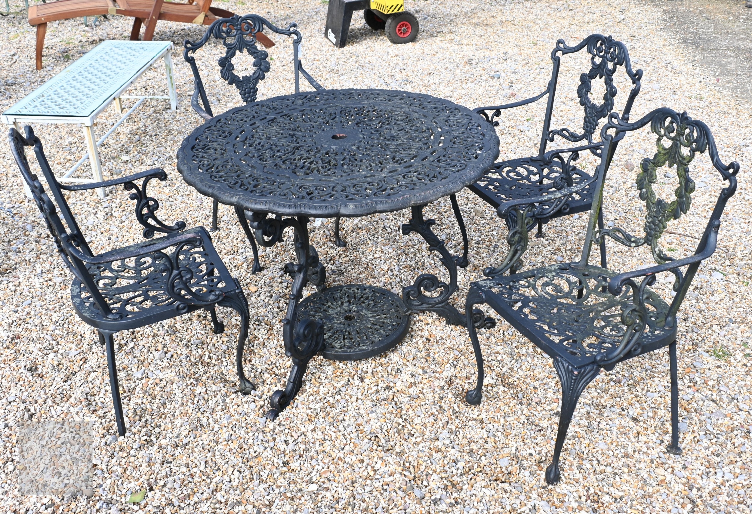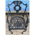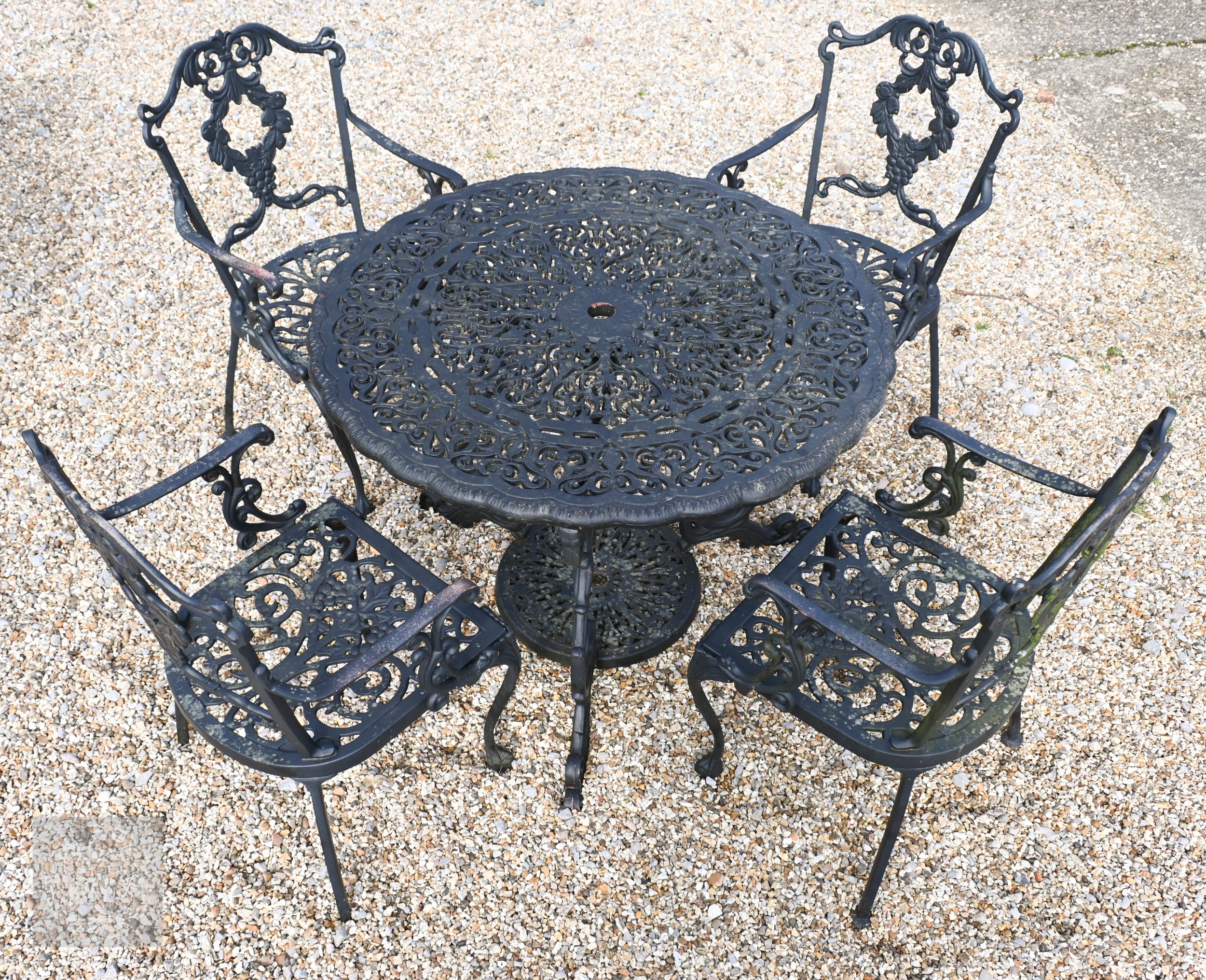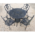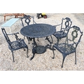 A traditional Victorian style cast alloy terrace dining set comprising a circular table cm dia. and four armchairs, finished in dull black (5)