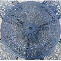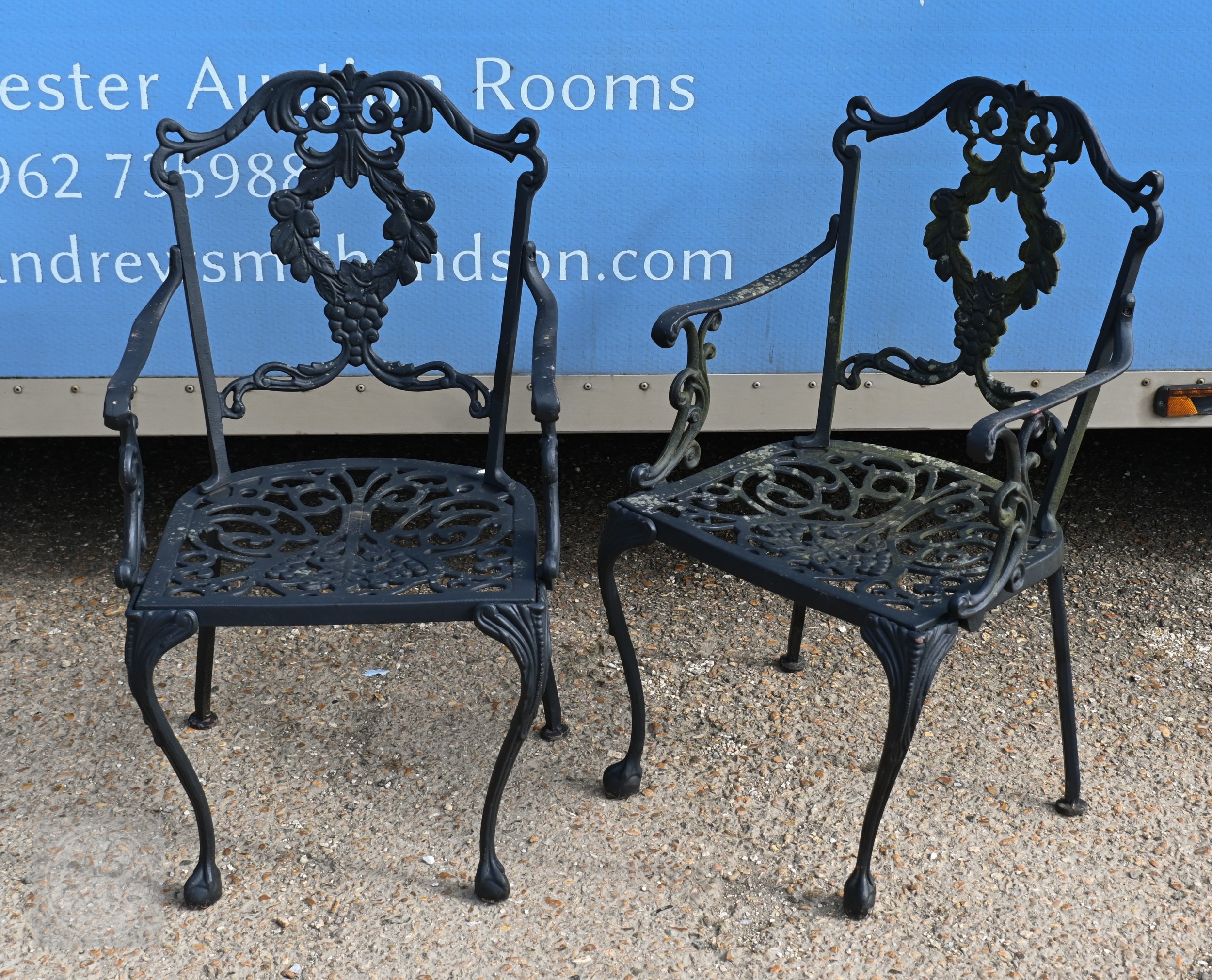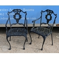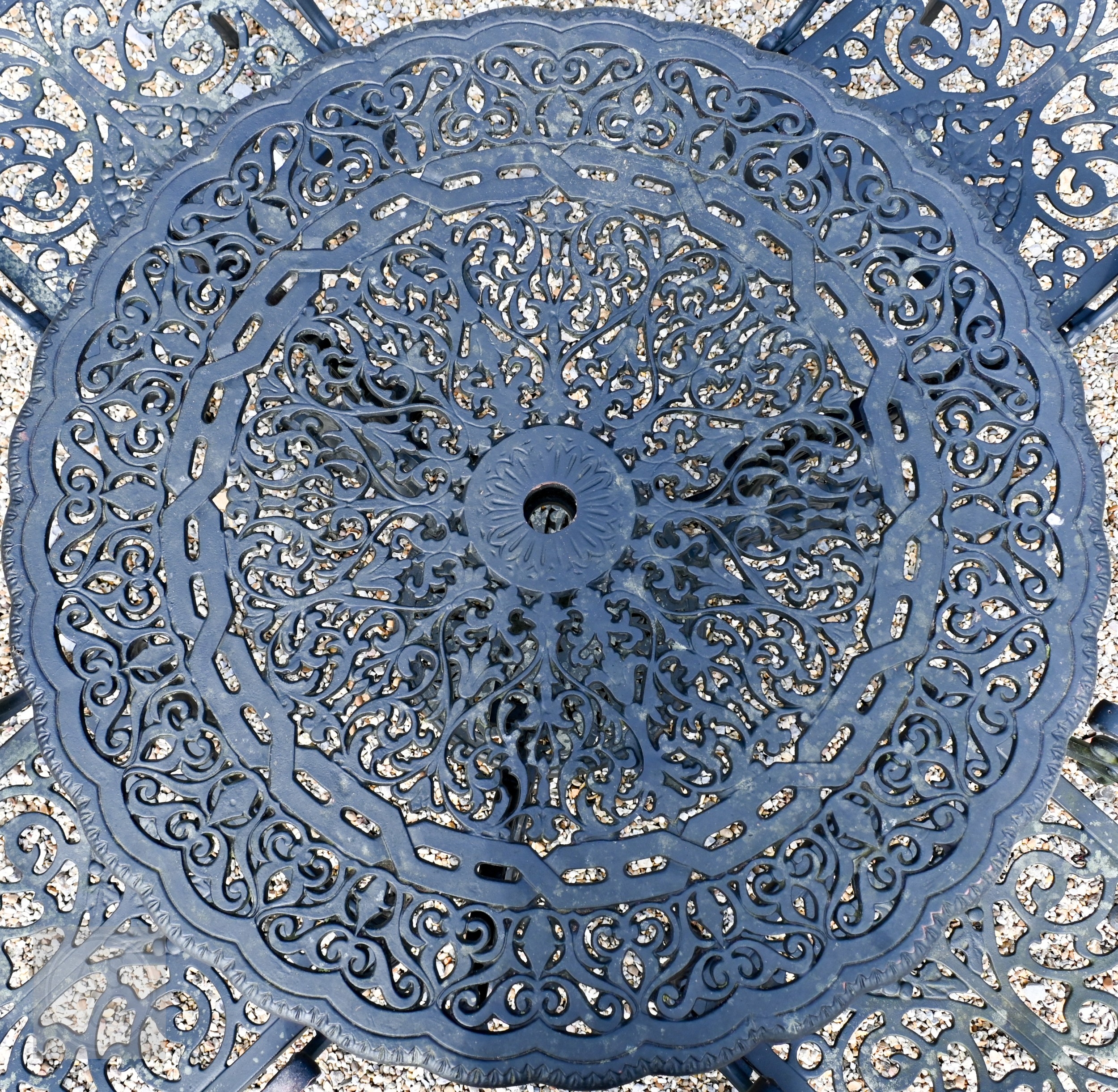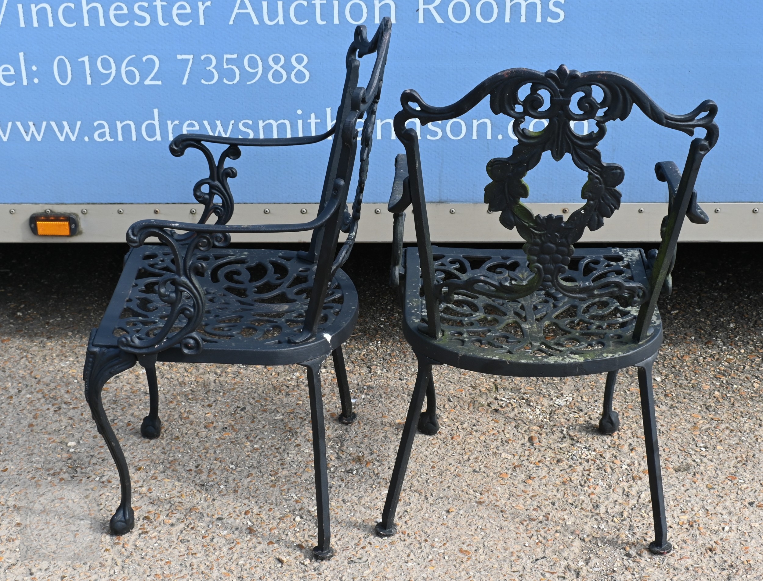 A traditional Victorian style cast alloy terrace dining set comprising a circular table cm dia. and four armchairs, finished in dull black (5)