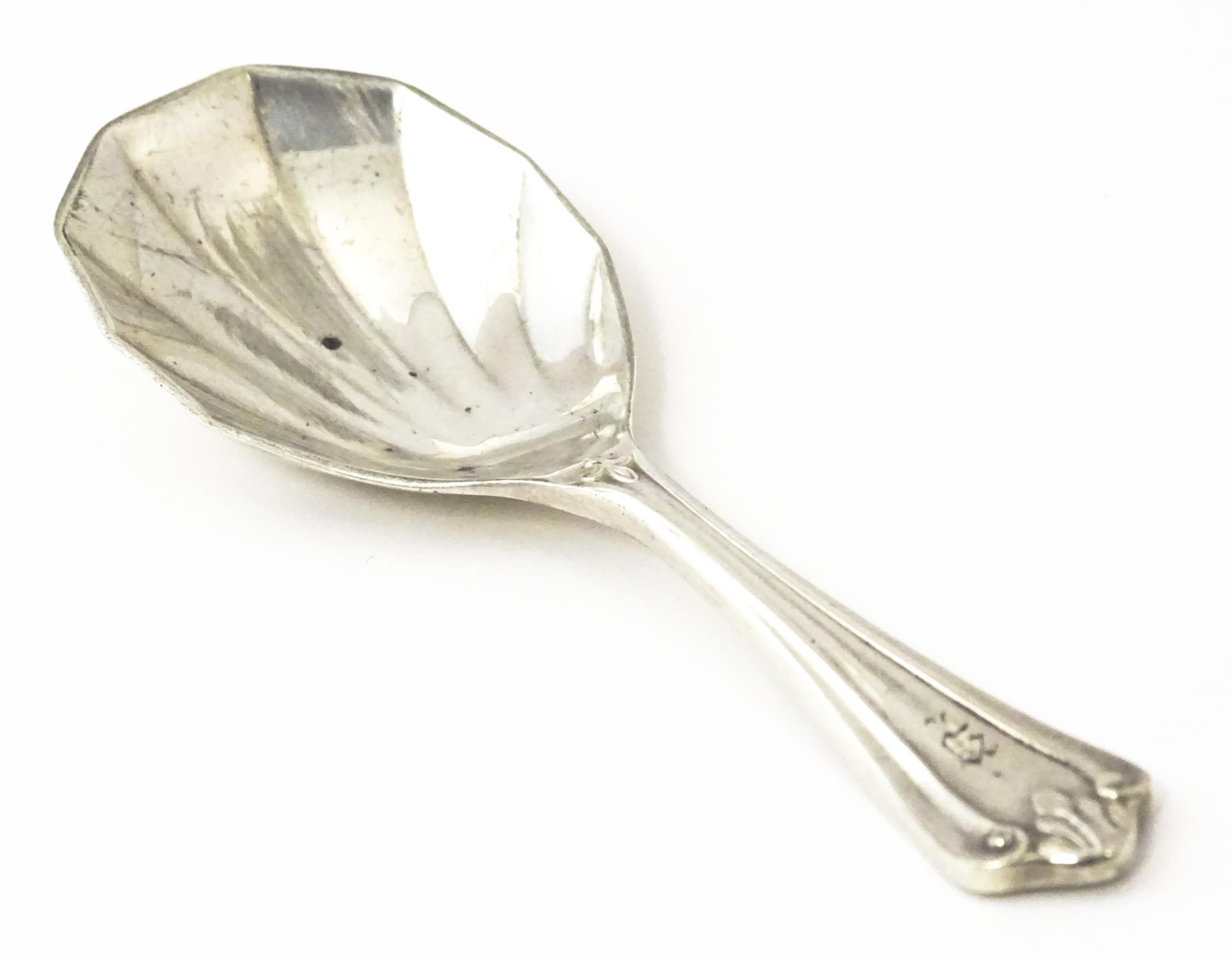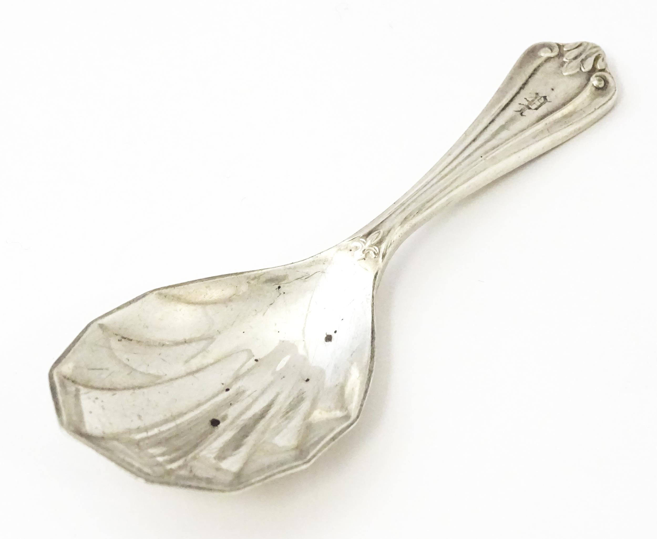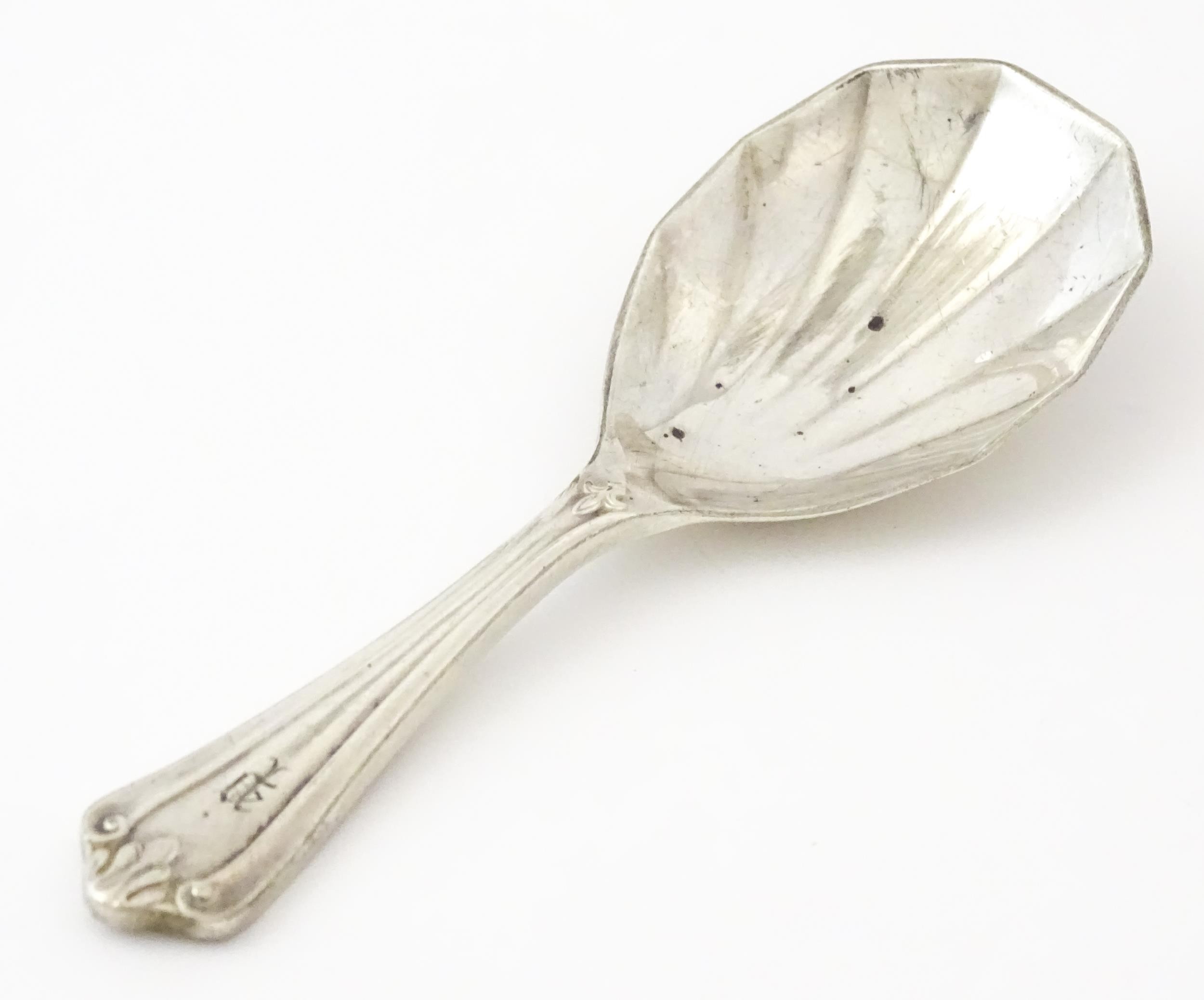A silver caddy spoon with shell formed bowl, hallmarked Birmingham 1913, maker Elkington & Co Ltd. Approx. 4" long