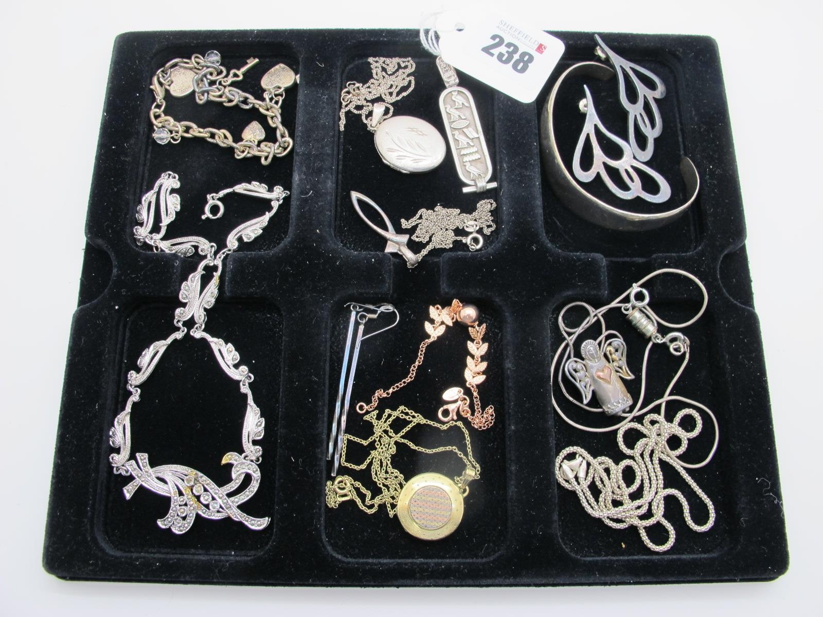 Escorcia; A Modernist Style Bangle, stamped "Mex TP.120"; together with pendants on chains, oval locket pendant, Egyptian cartouche pendant, openwork earrings etc.