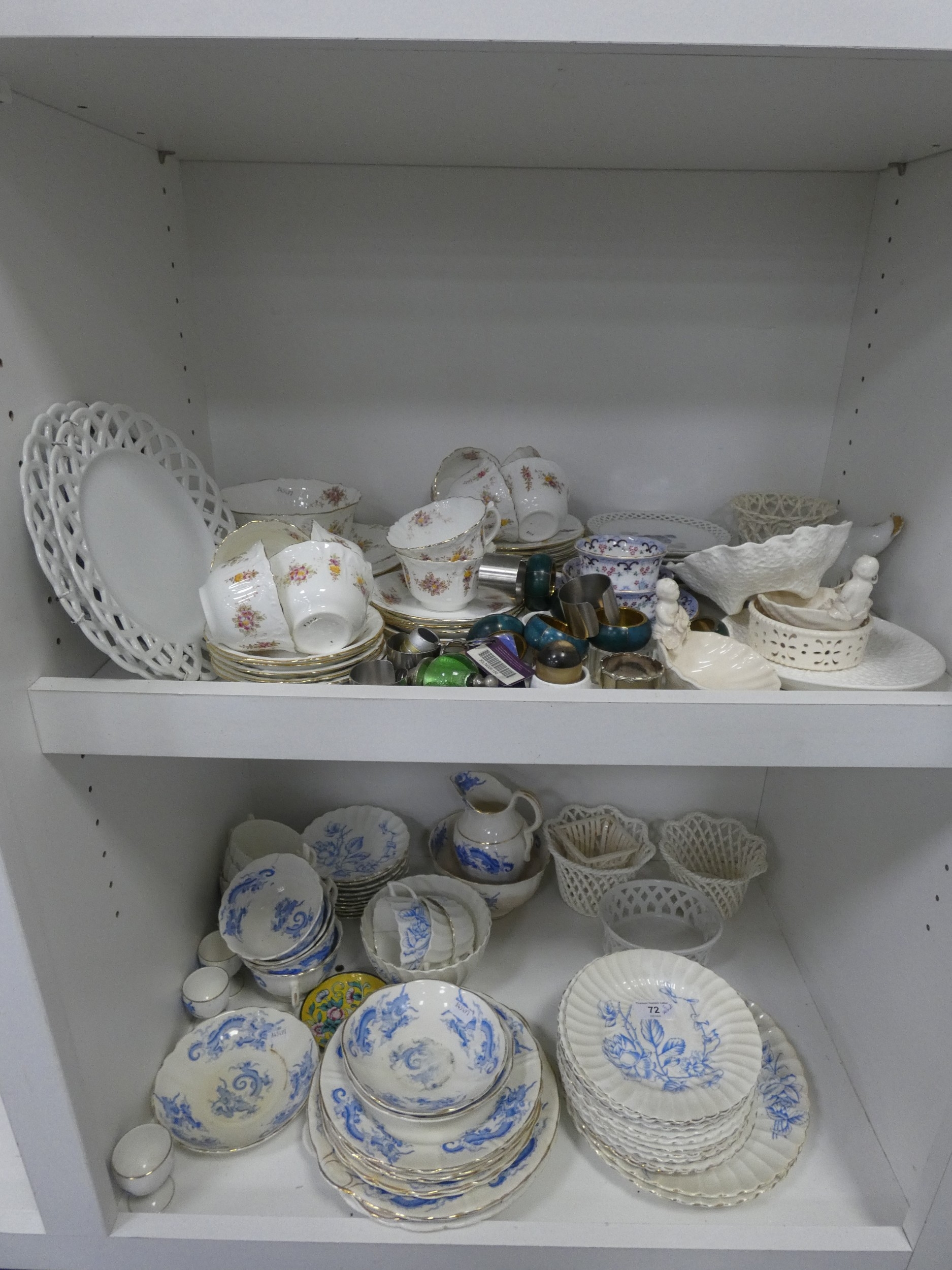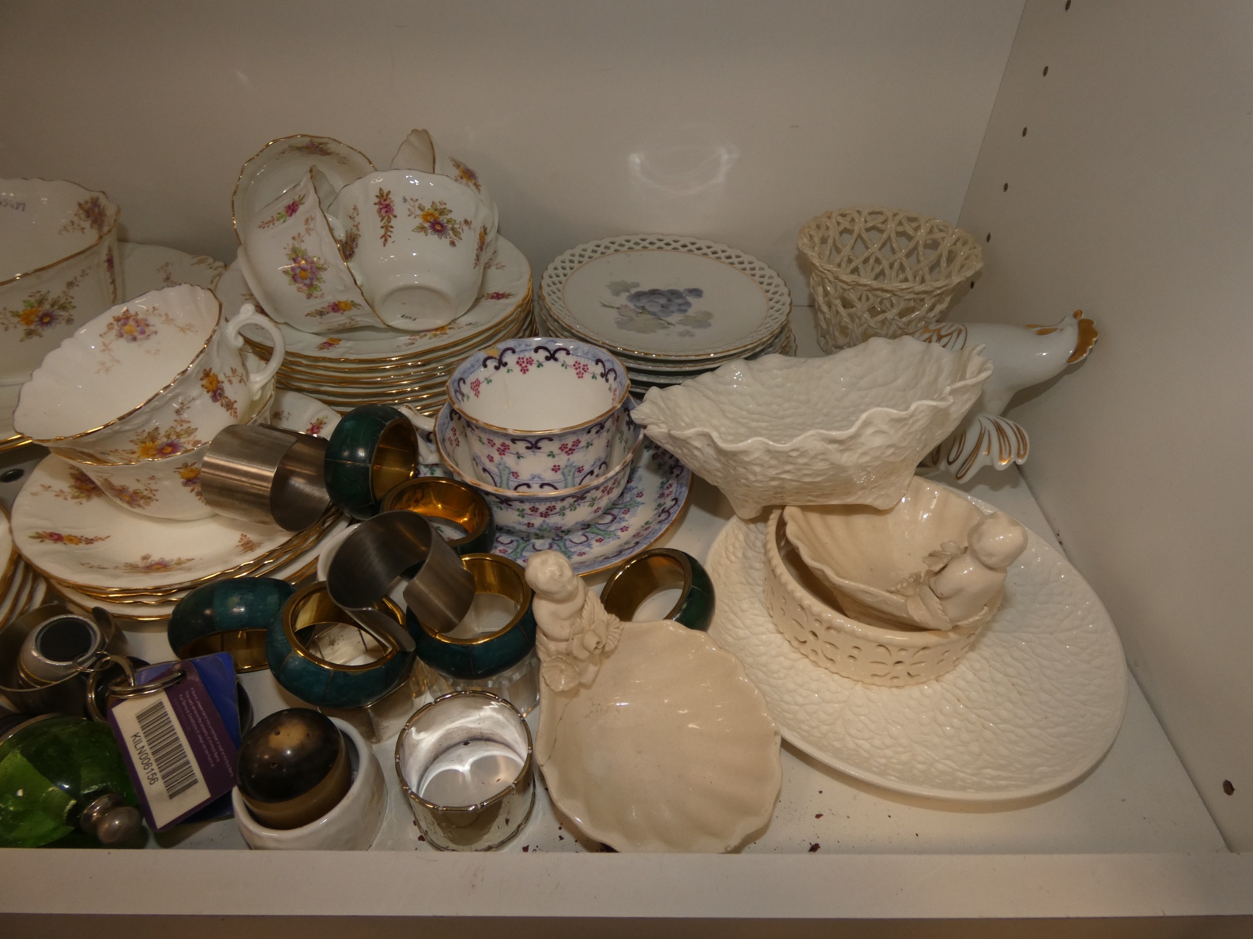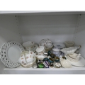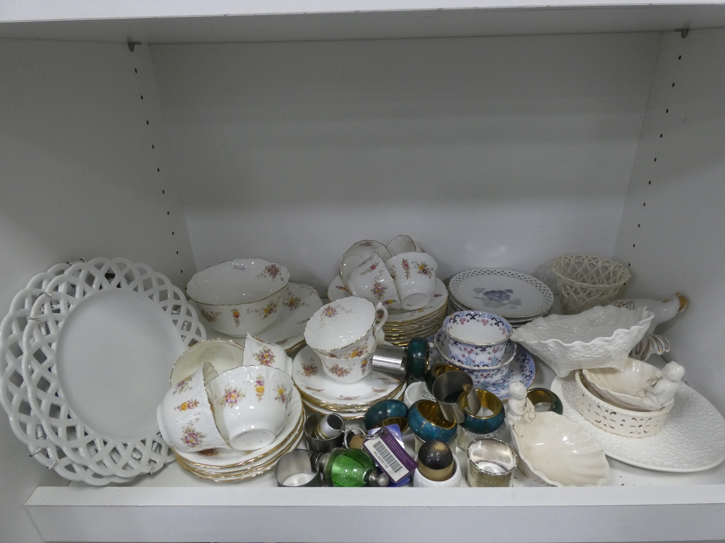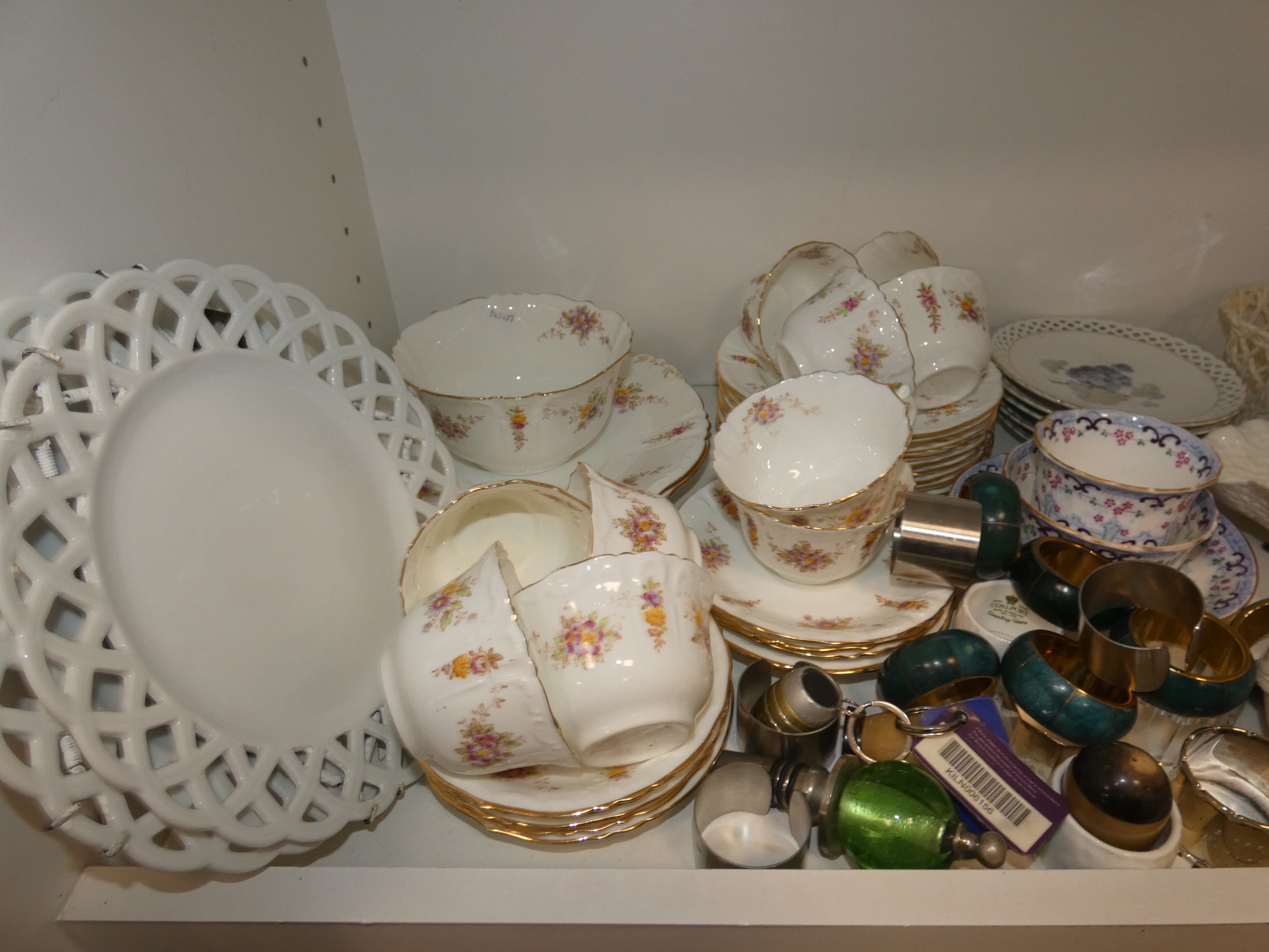 Victorian part tea set with dragon decoration, another Victorian part tea set, floral decorated part tea set, lattice plates and dishes, napkin rings, kitchenalia etc (two shelves).