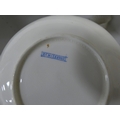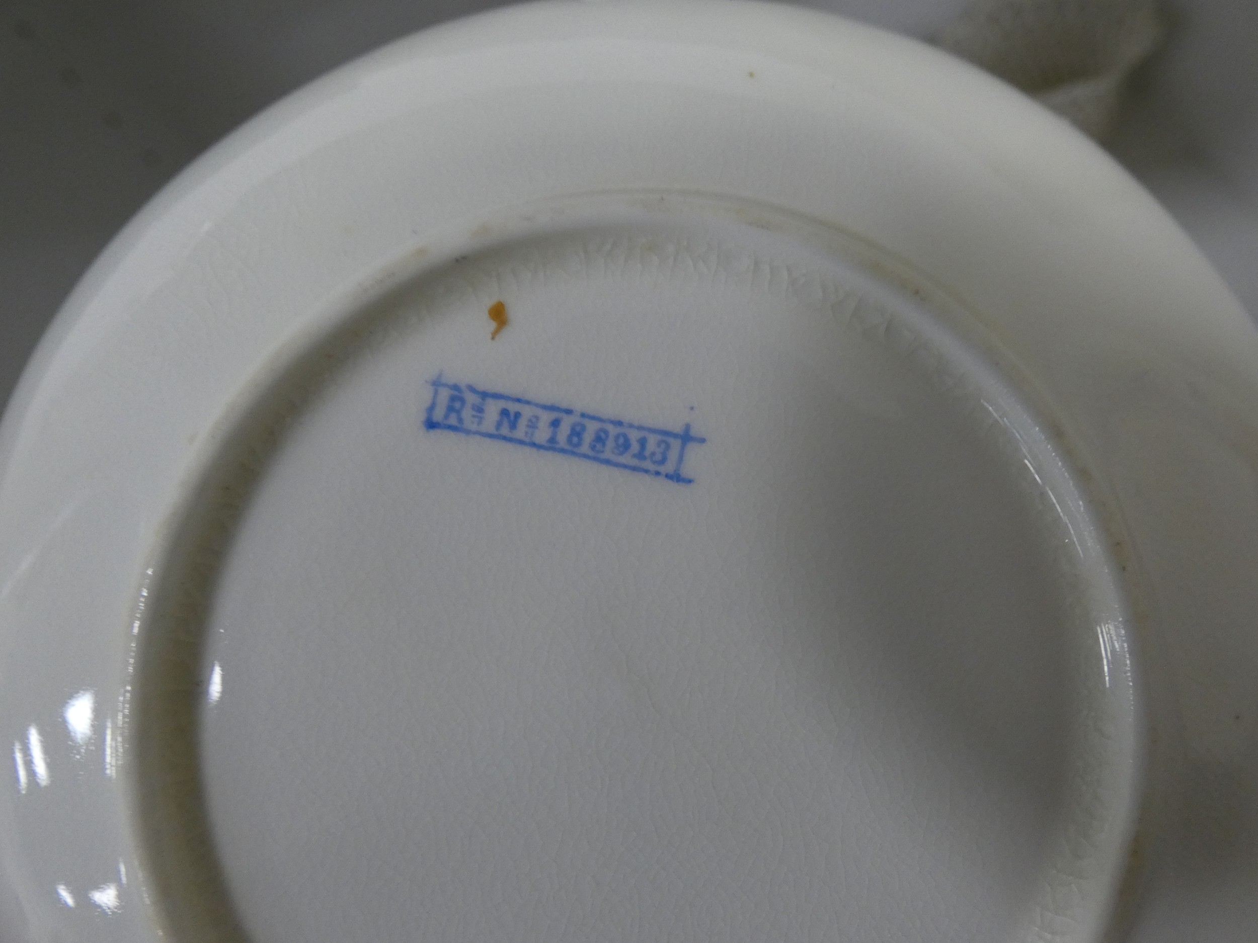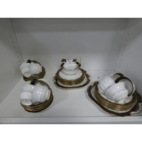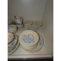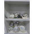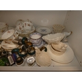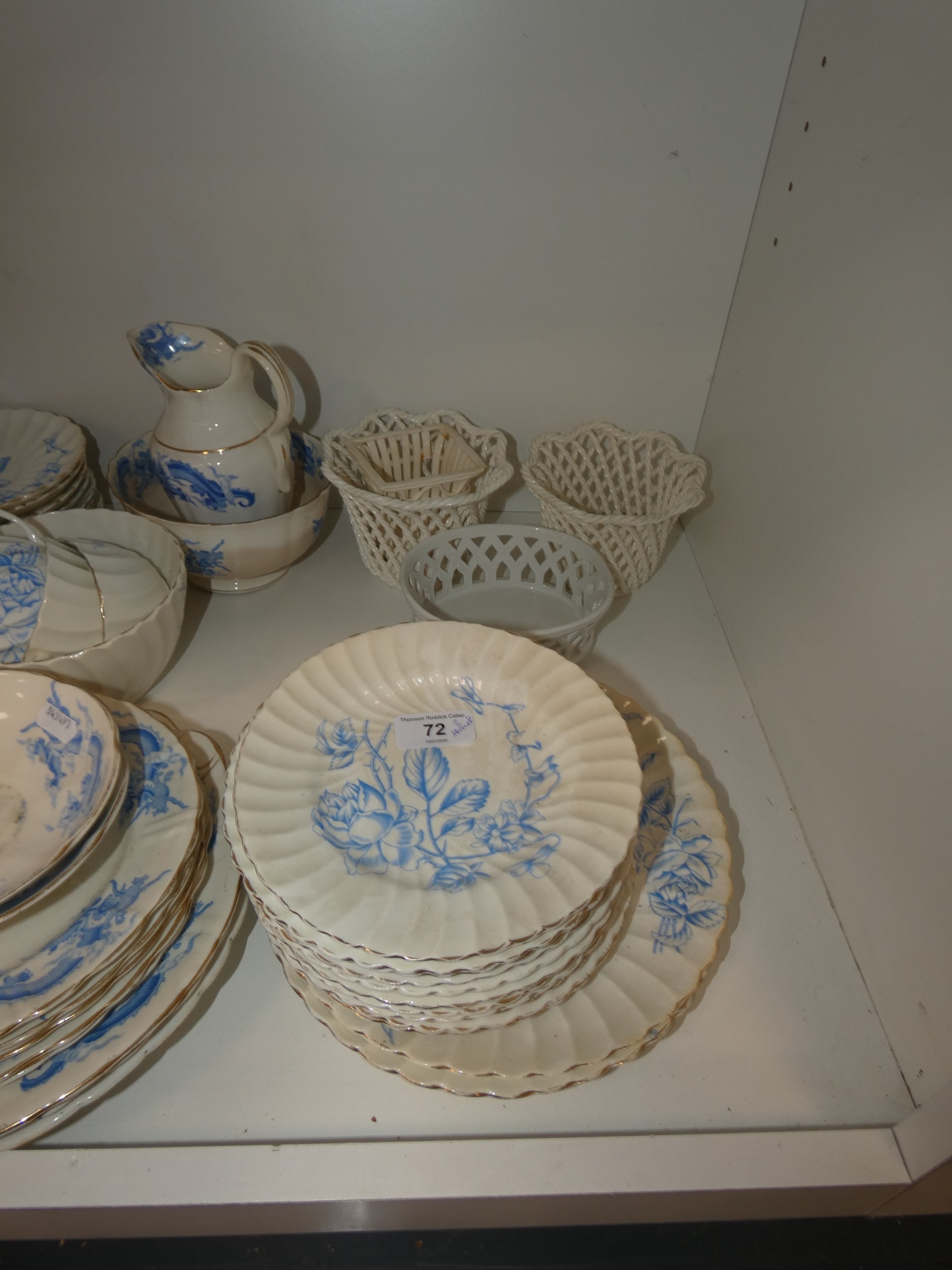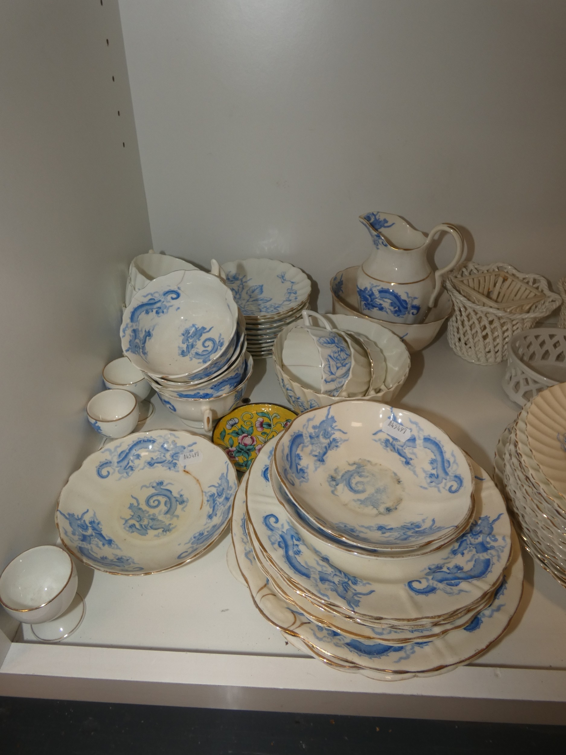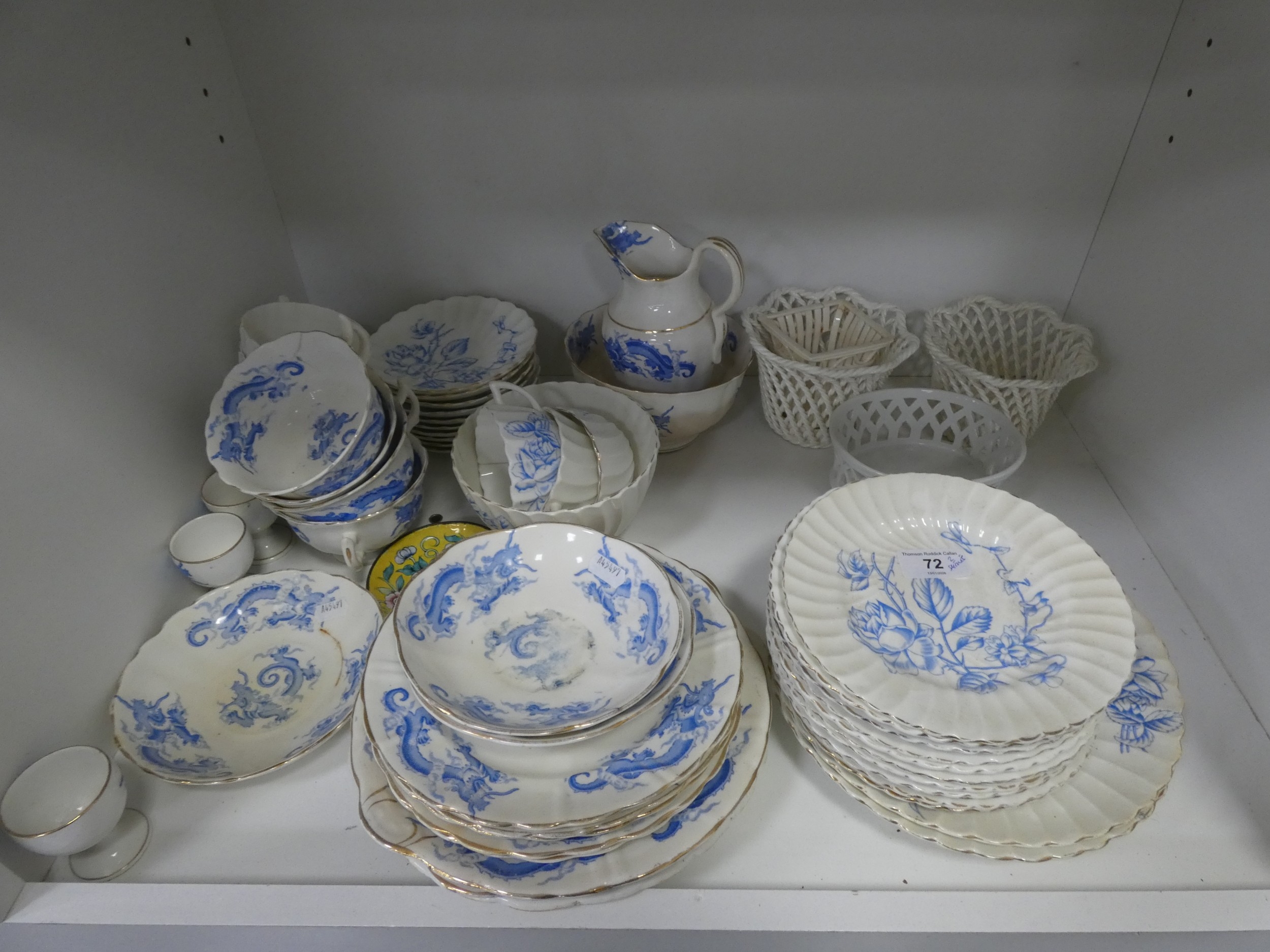 Victorian part tea set with dragon decoration, another Victorian part tea set, floral decorated part tea set, lattice plates and dishes, napkin rings, kitchenalia etc (two shelves).