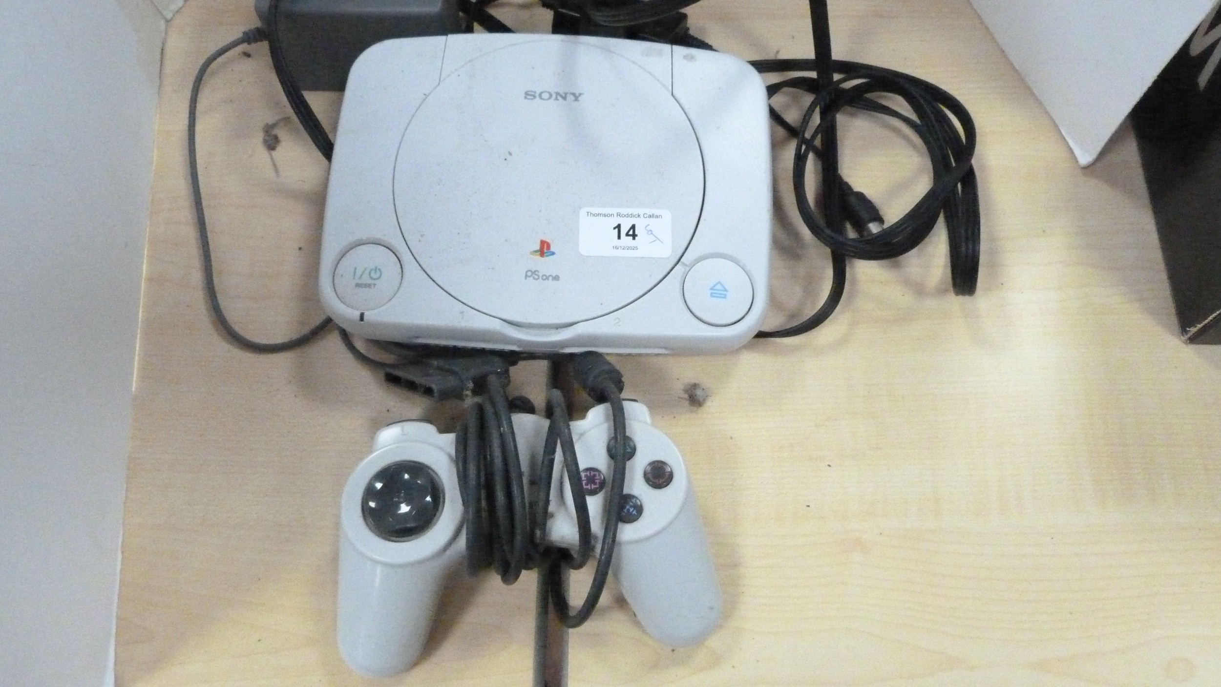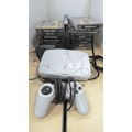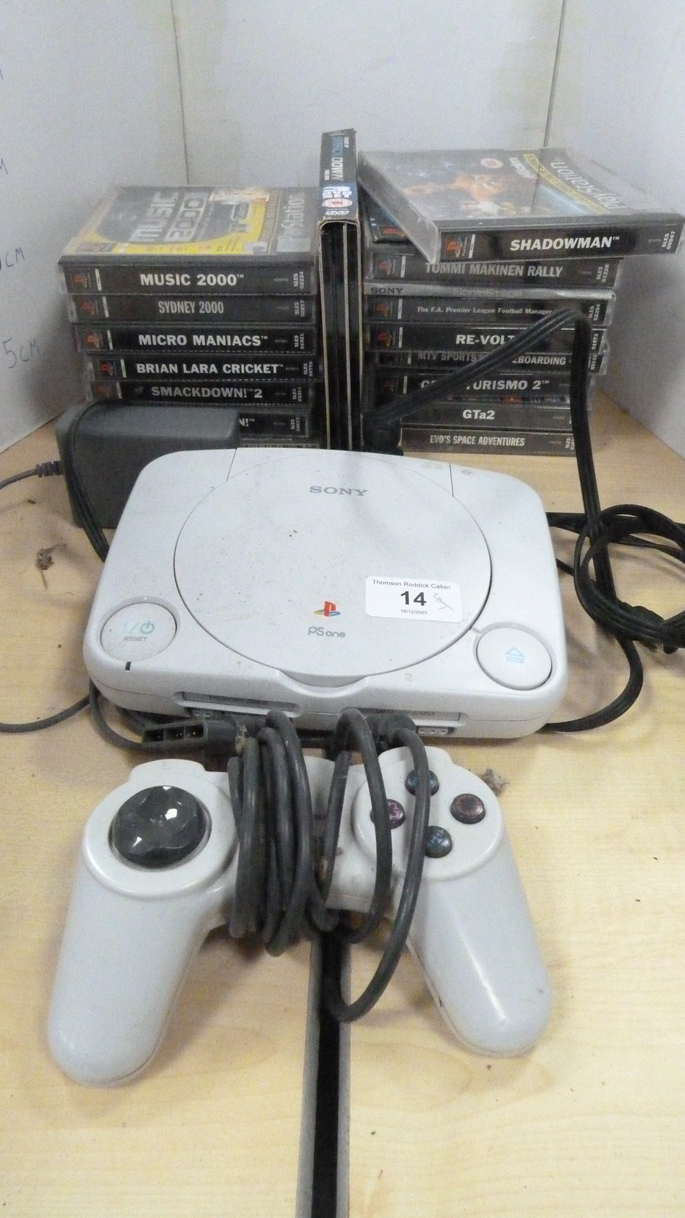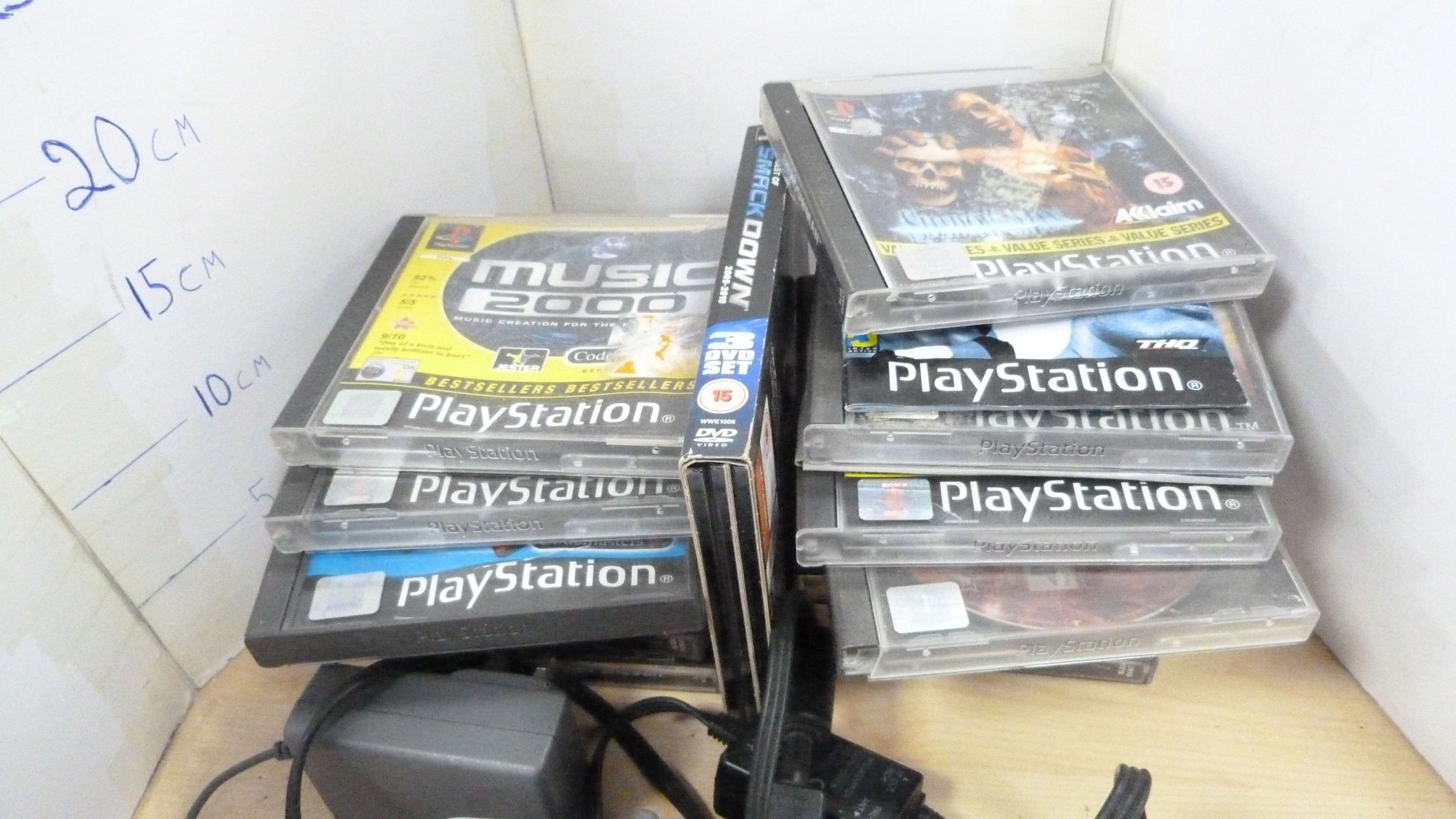 Sony PS1 console with controller and a group of games to include Brian Lara Cricket, GTA 2 etc.