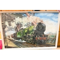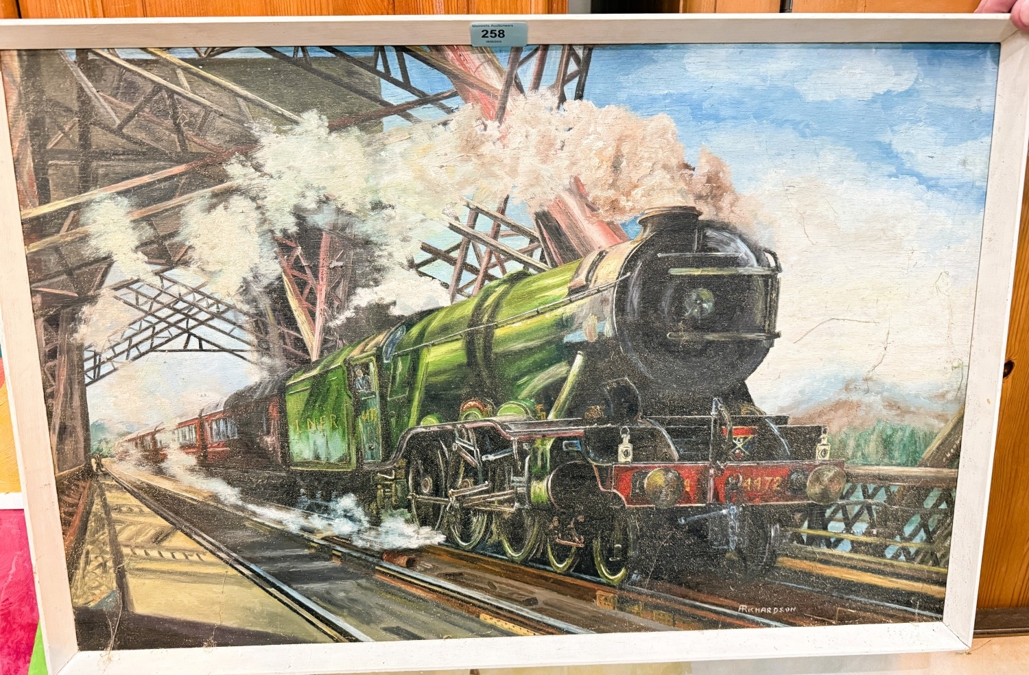 A Richardson's, steam locomotive on a bridge, oil on board, signed, 44 x 69cms.