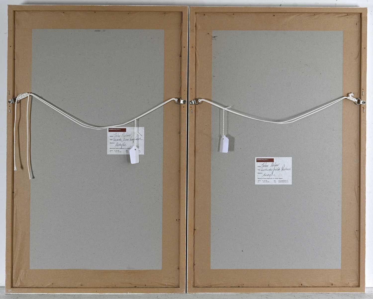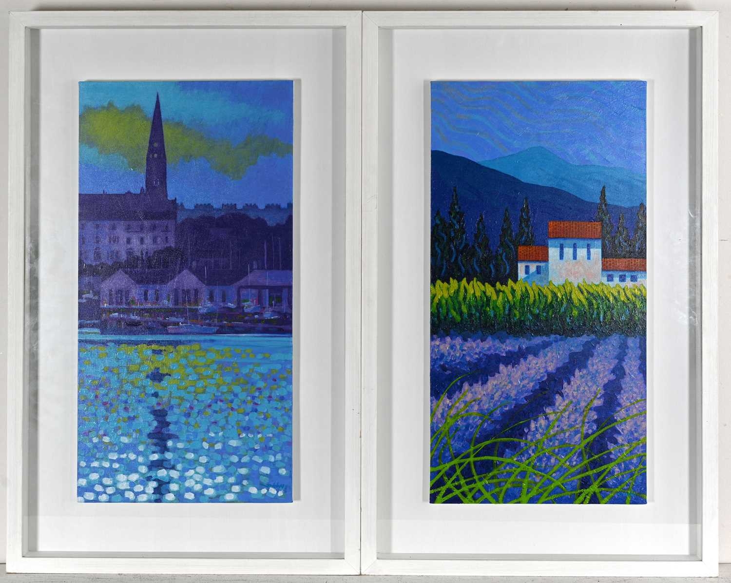 John Nolan (Irish, 1958), Lavender Fields, Provence; Towards Dun Laoghaire, a pair, both signed l.r., titled verso, acrylic on canvas, 60 by 29cm, framed (2). Provenance: with Waldock Gallery, Dublin