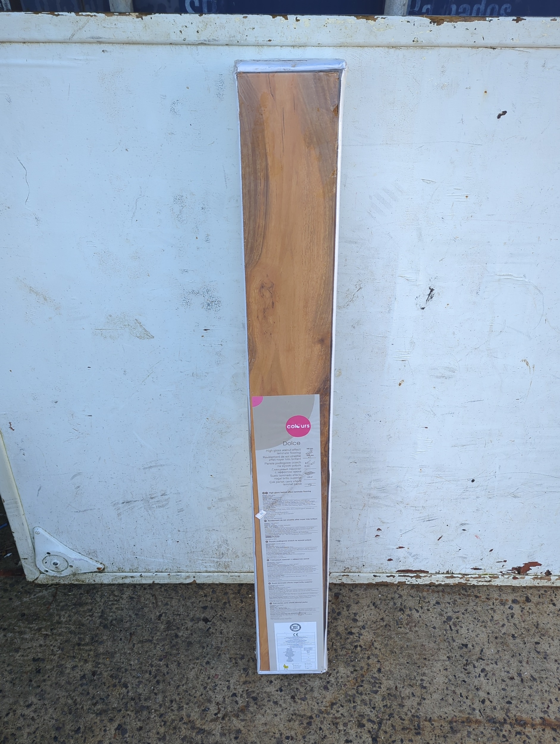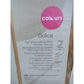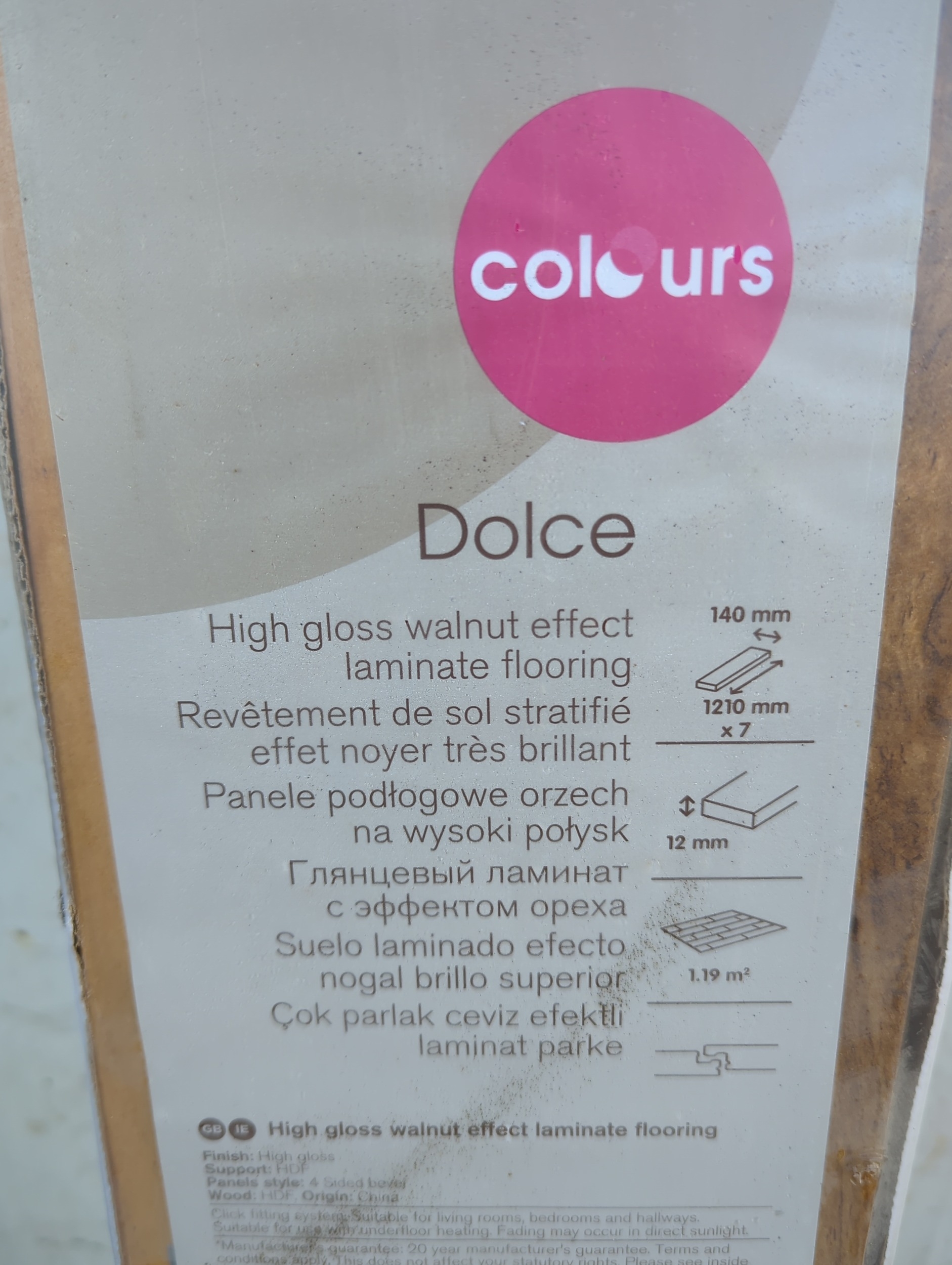 This is a box of Colours brand Dolce model laminate flooring. The product features a high gloss walnut effect and includes specifications such as 140mm width and 12mm thickness. The packaging appears to contain multiple flooring planks suitable for home installation.
