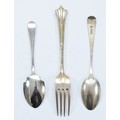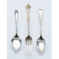 A Victorian silver Albany pattern fork, Sheffield 1896, 15cm, together with a silver bead pattern preserve spoon, Sheffield 1923, and a silver teaspoon, Sheffield 1925, 57gm.